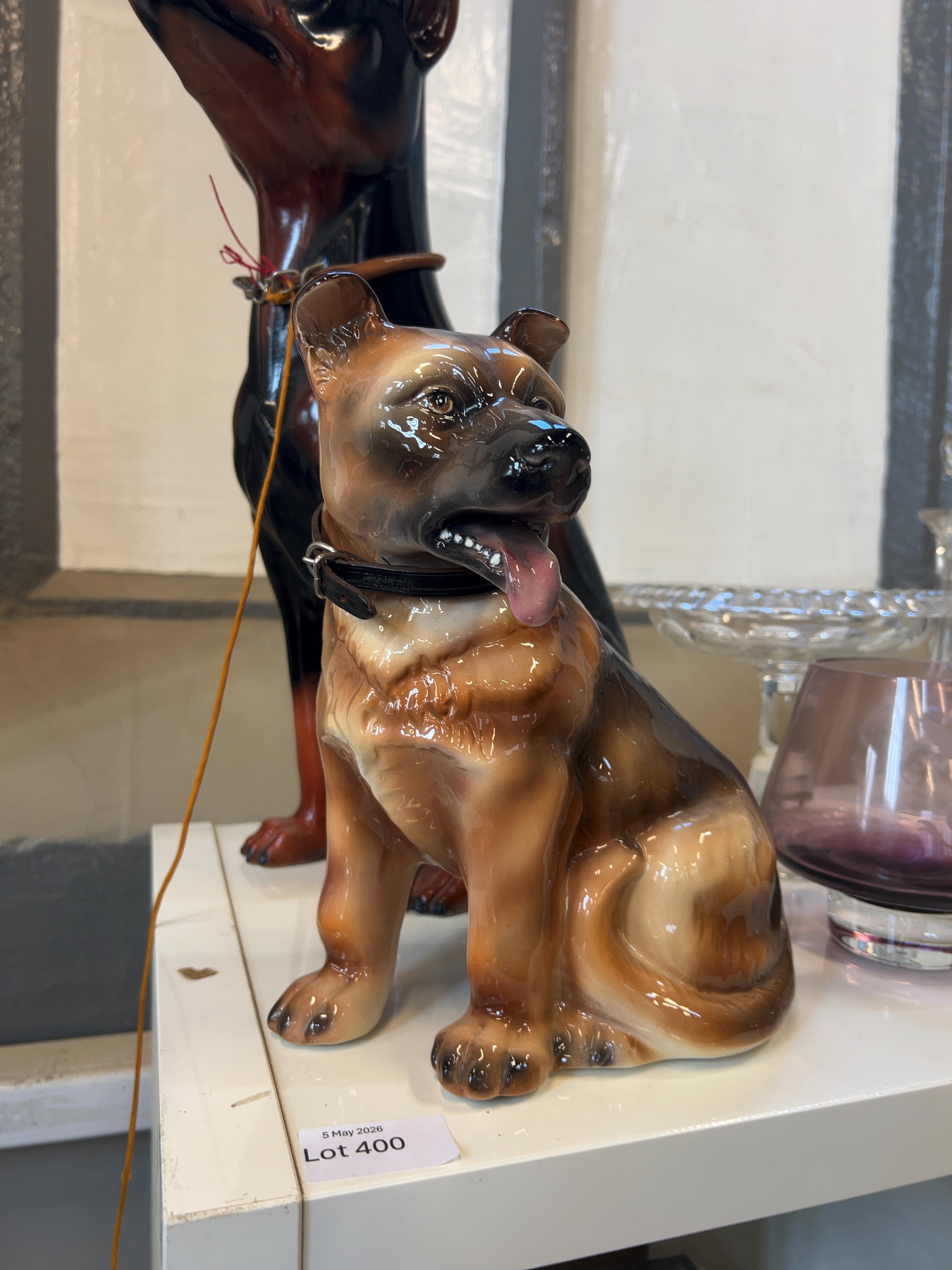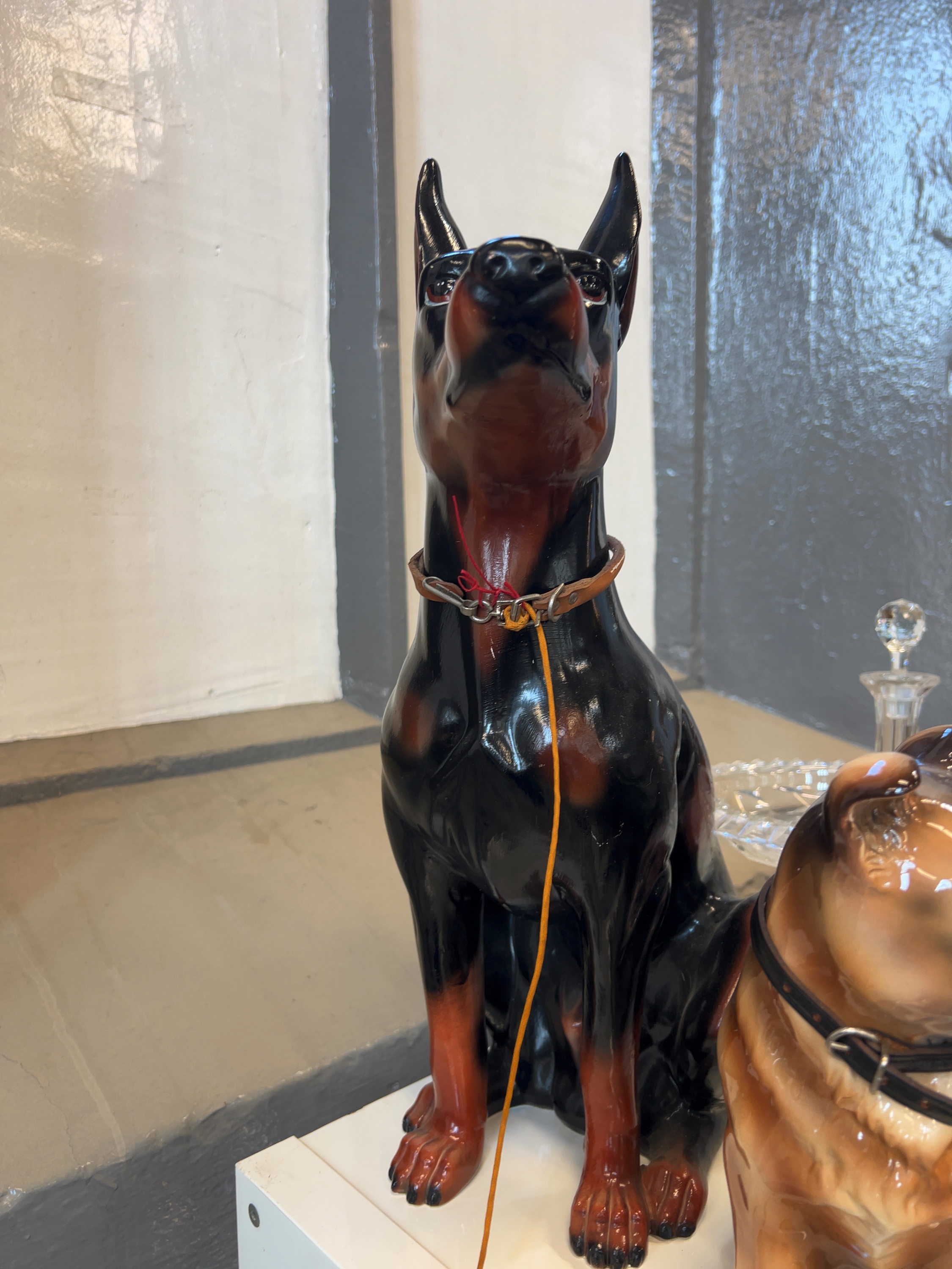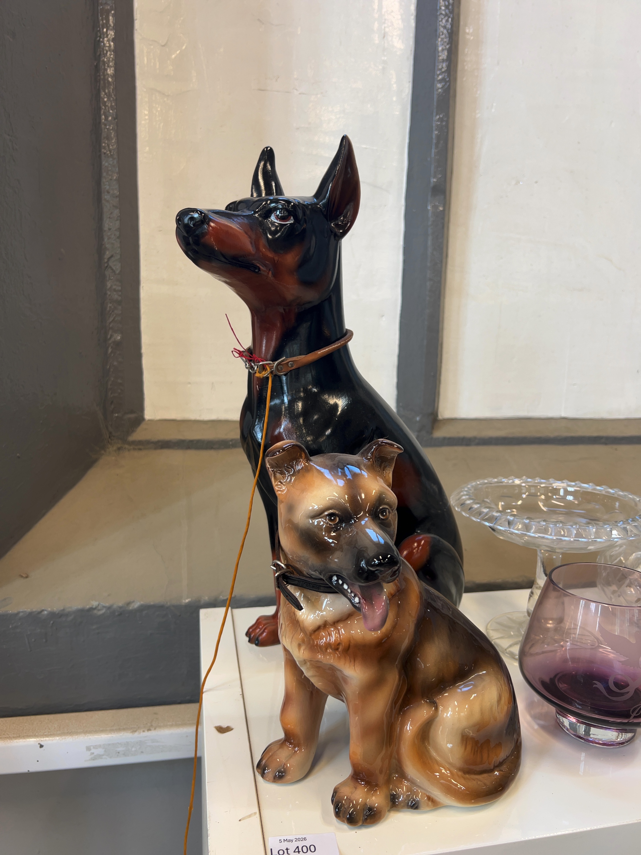 This lot comprises two realistically modelled canine figures in high-gloss glazed ceramic. The first figure represents a Doberman Pinscher, depicted in a tall, seated, alert posture with a black and tan finish. It is fitted with a brown faux-leather collar and a long yellow cord tether. The second figure is a smaller German Shepherd, also seated, with a brown and black glaze, an open mouth, and a protruding tongue, wearing a black faux-leather collar. These items are in the style of mid-to-late 20th-century decorative pottery, characteristic of Italian ceramic studios or makers such as Melba Ware. No factory marks, stamps, or model numbers are visible on the exterior surfaces.