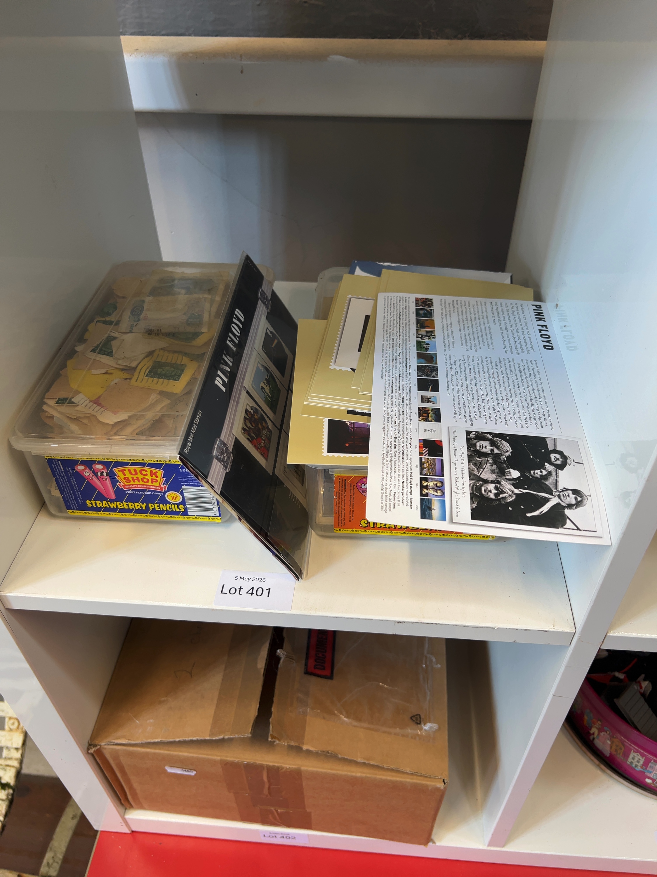 The Pink Floyd presentation pack and cards appear to be in good, unused condition. The loose stamps show varying levels of handling consistent with a bulk collection. The plastic storage tub shows some light surface wear and residue.