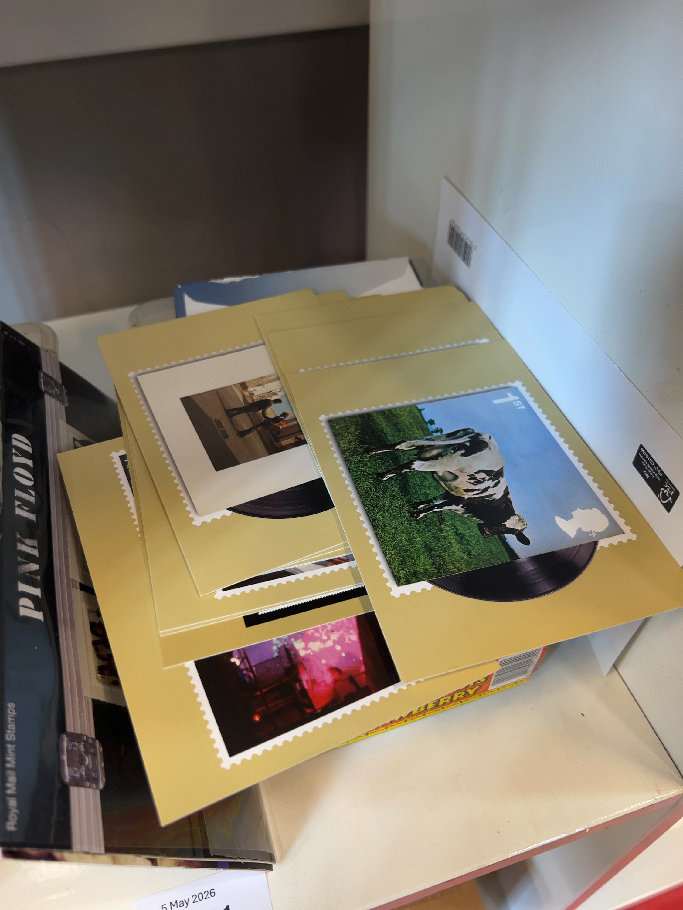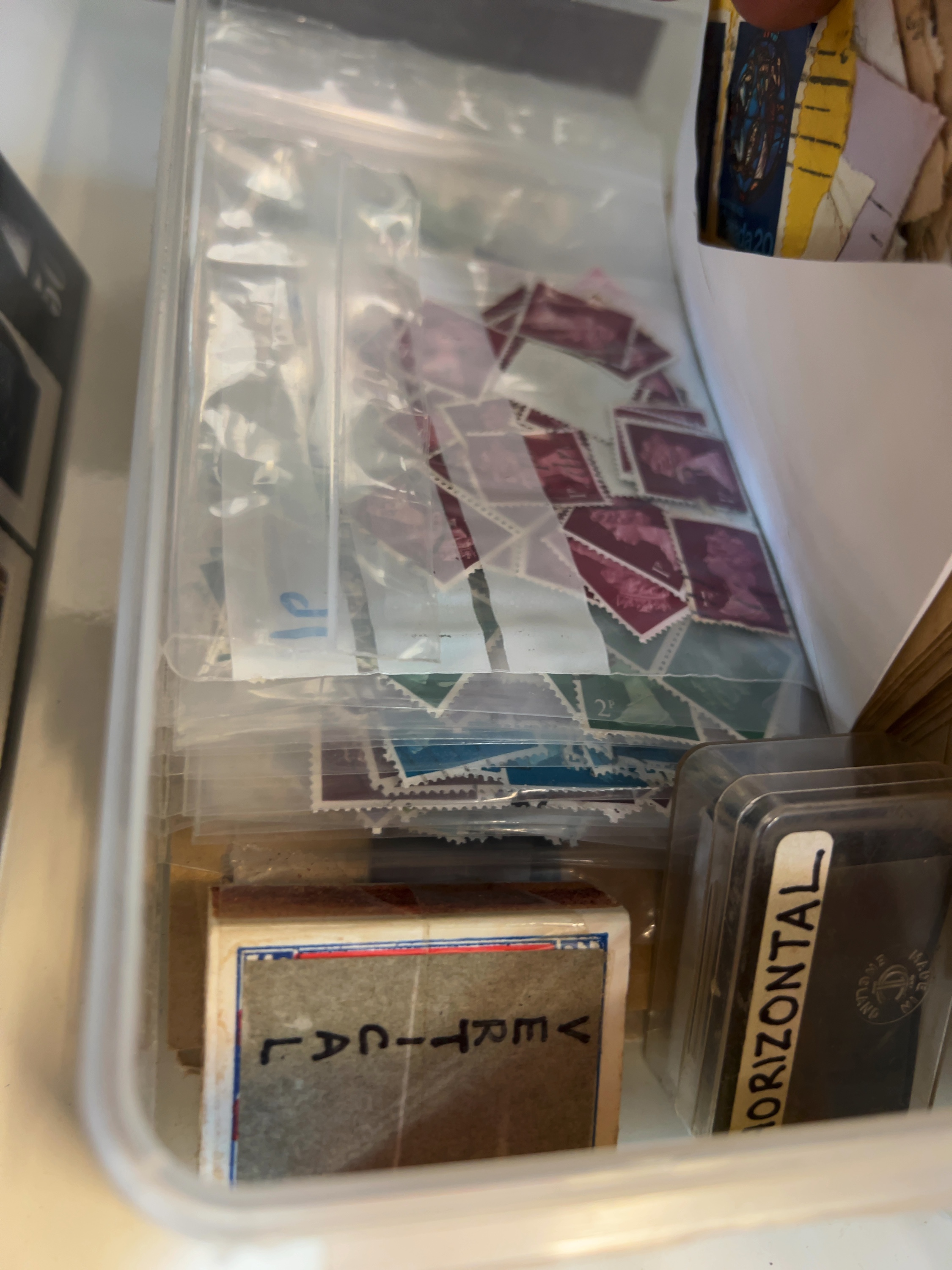 A collection containing Pink Floyd music memorabilia and general philatelic materials. The lot includes items from the 2016 Royal Mail commemorative Pink Floyd issue, featuring a presentation pack and booklet titled Royal Mail Mint Stamps with a monochrome group portrait of the band. Also included is a set of PHQ cards reproducing various Pink Floyd album covers, notably Atom Heart Mother and Wish You Were Here. The philatelic portion consists of a large quantity of loose British stamps, primarily Machin head definitives in various colours including purple, teal, and blue. Several stamps are organised into small plastic grip-seal bags with handwritten denominations such as 1p and 2p. The lot also contains two small storage containers with handwritten labels reading VERTICAL and HORIZONTAL. The entire collection is housed within a clear plastic Tuck Shop Strawberry Pencils tub.