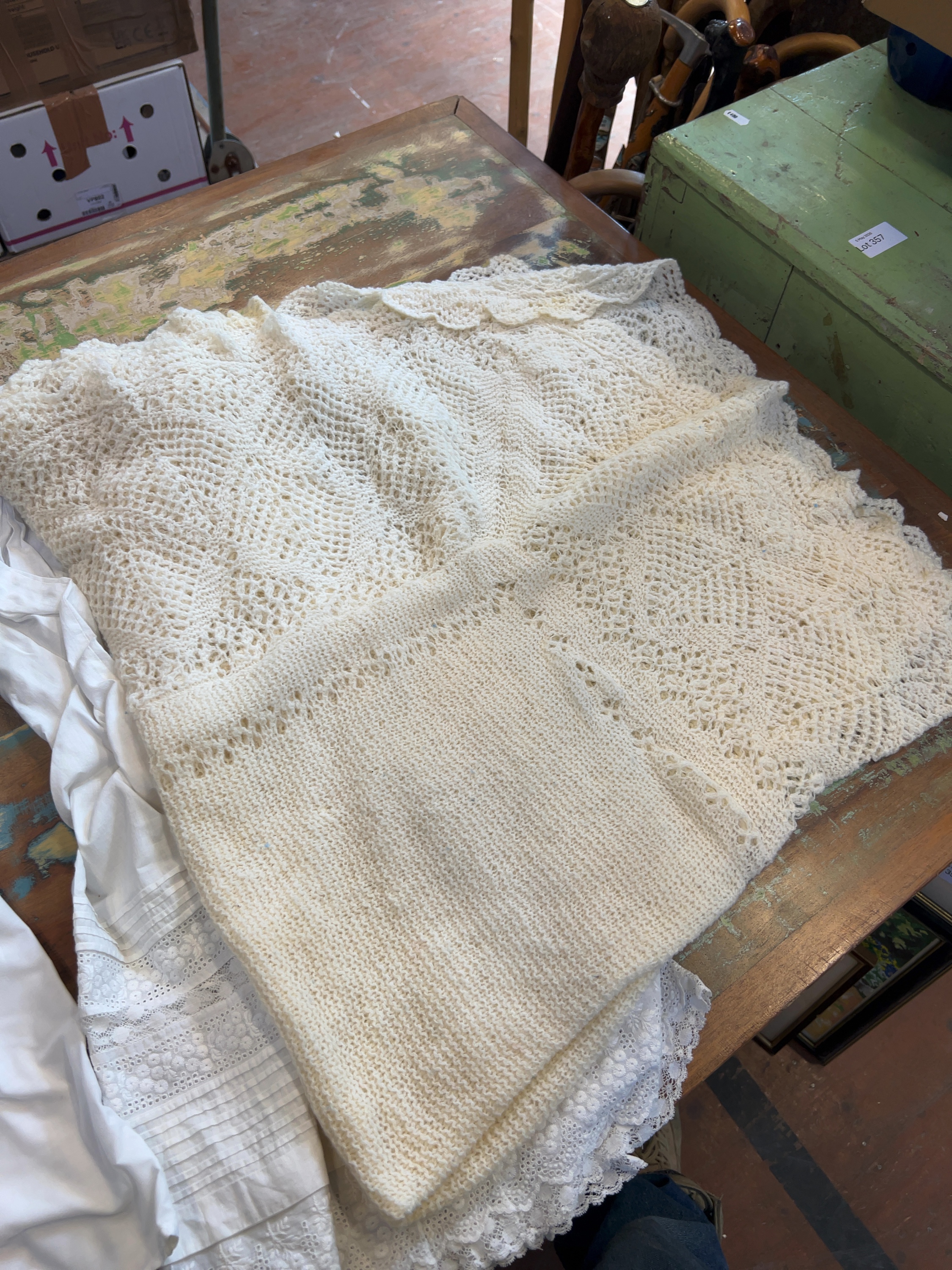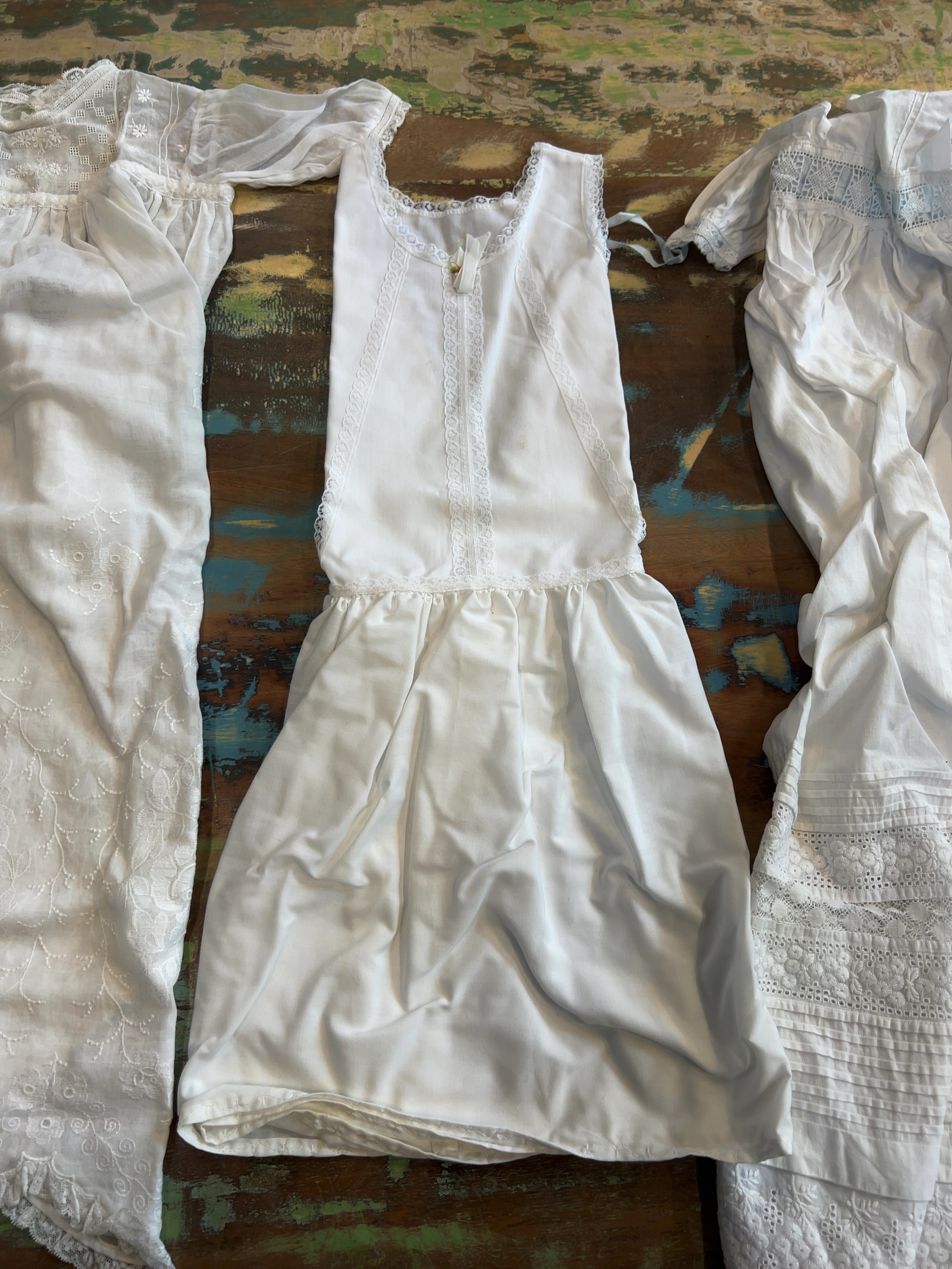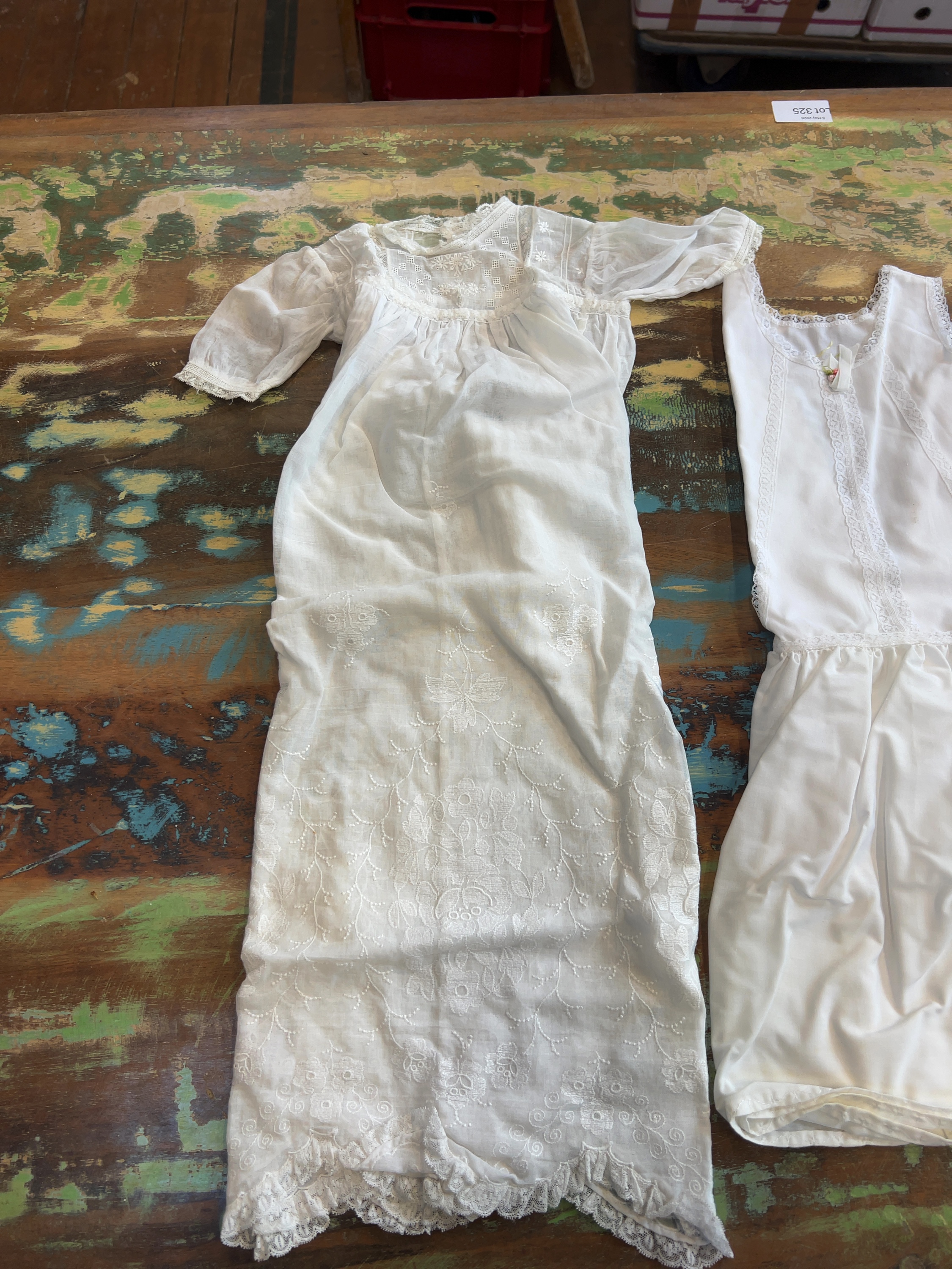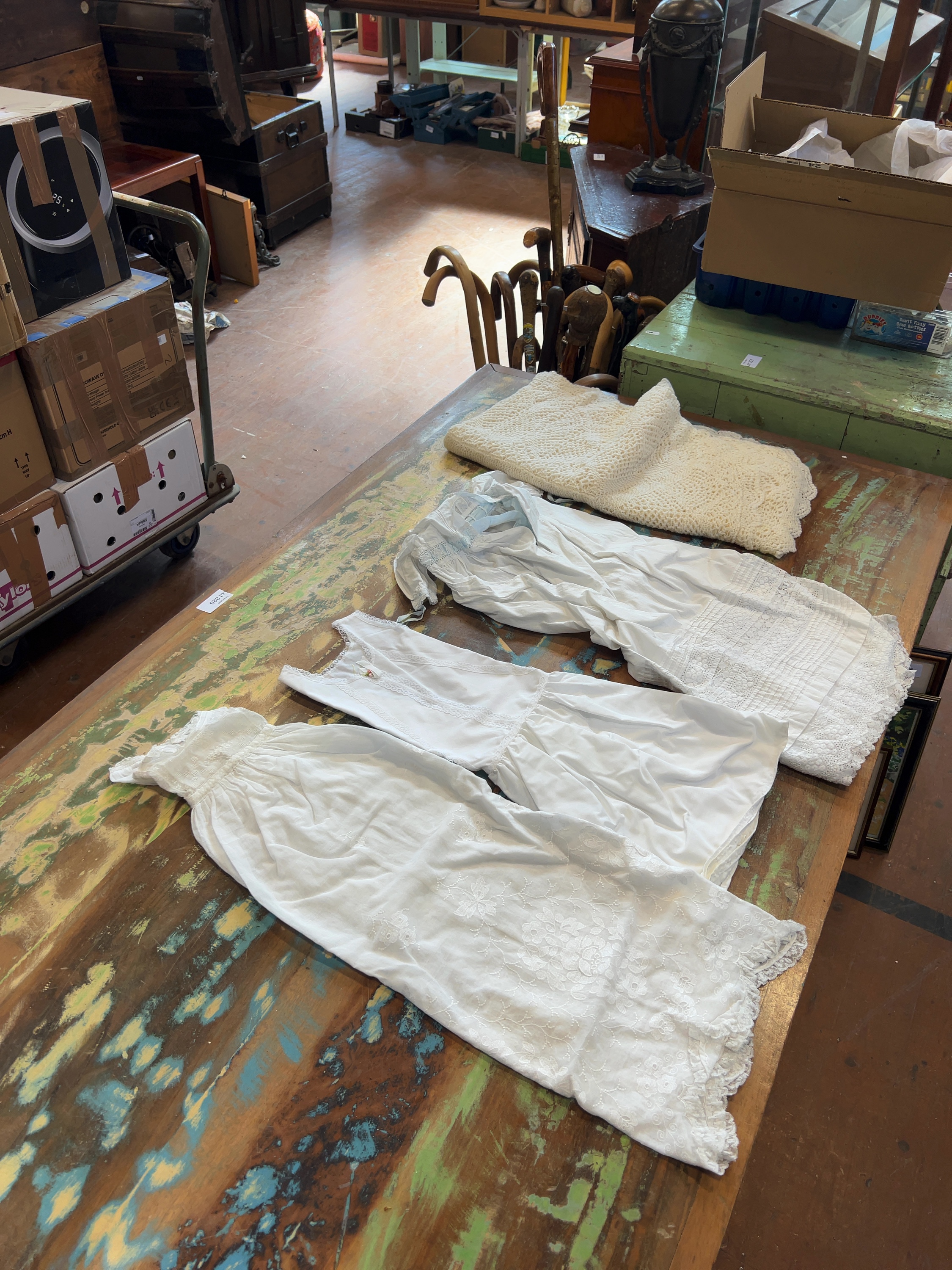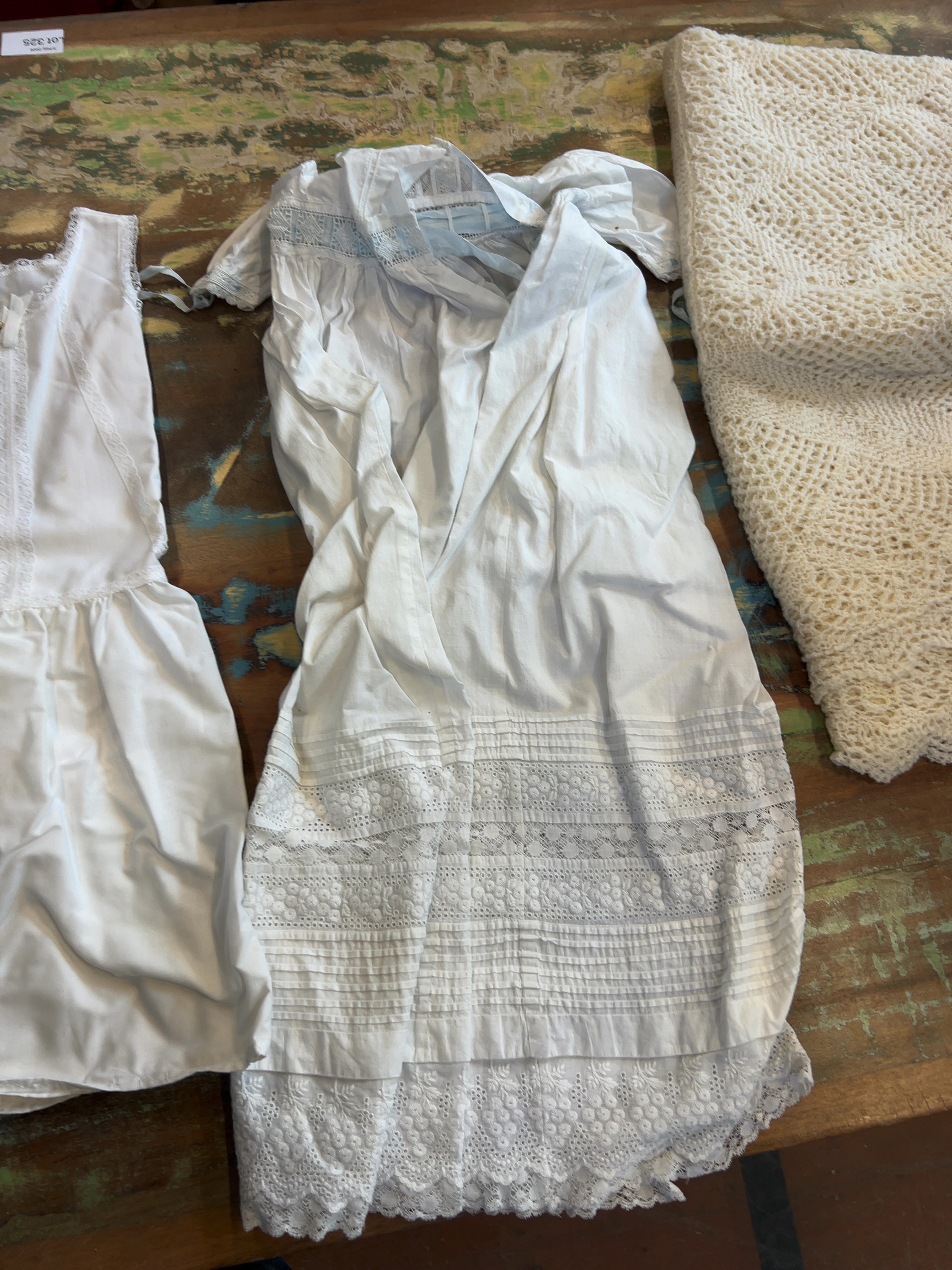 This collection of infants wear includes several white cotton garments and a cream-coloured shawl, dating from the late 19th to the early 20th century. The assembly includes a full-length christening gown constructed from fine white cotton lawn or muslin, featuring a square neckline with a lace-inset yoke and long sleeves with lace-trimmed cuffs. The garment is decorated with floral broderie anglaise, eyelet embroidery, and cutwork to the front panel and hem, which is finished with a scalloped lace edge. Also included is a sleeveless under-slip made of white cotton with a gathered waist and lace trim around the neckline and armholes, featuring vertical lace-insertion panels to the bodice. Another garment in the group is a short-sleeved gown detailed with lace trim and a blue ribbon threaded through a lace band at the bodice; the skirt displays horizontal pintuck tiers and bands of decorative lace and broderie anglaise above a scalloped hem. The accompanying hand-knitted shawl is worked in a cream wool or wool-blend yarn with an intricate openwork lace pattern and a decorative scalloped border. No manufacturer labels or marks are present.