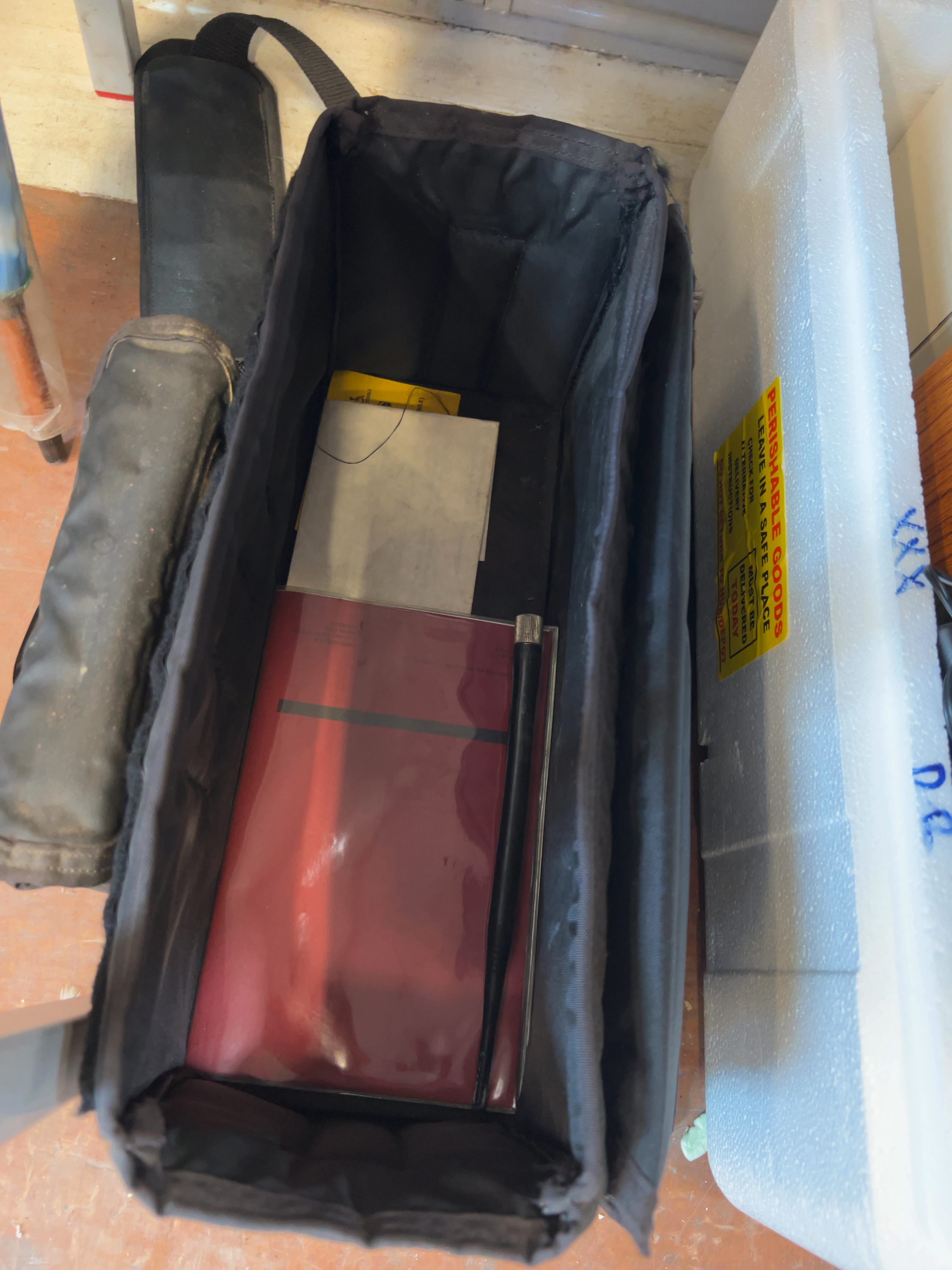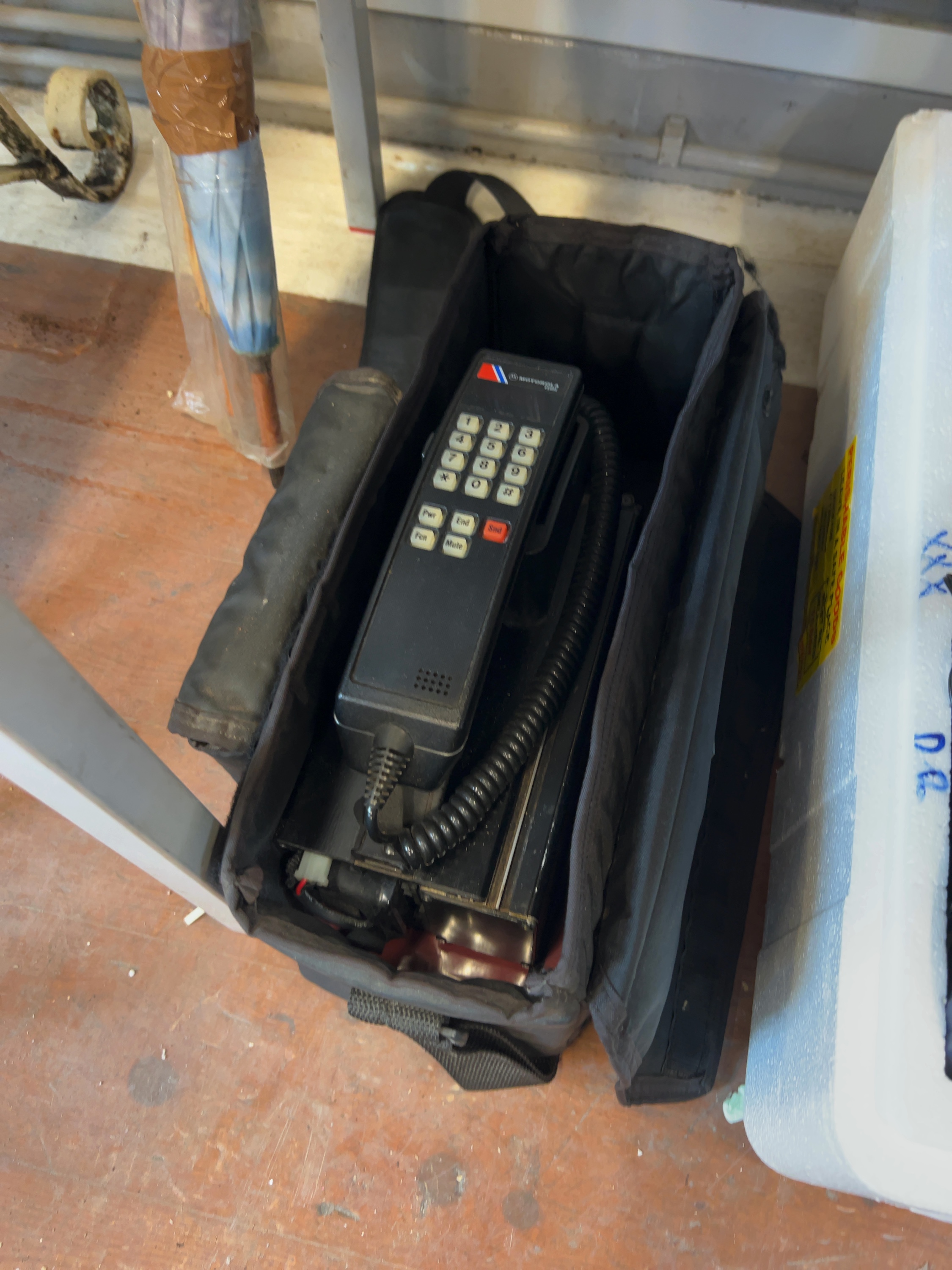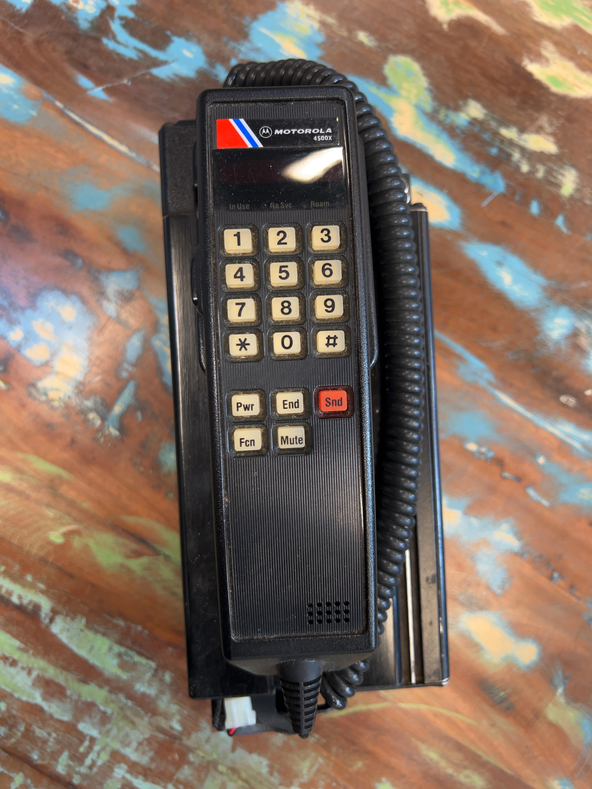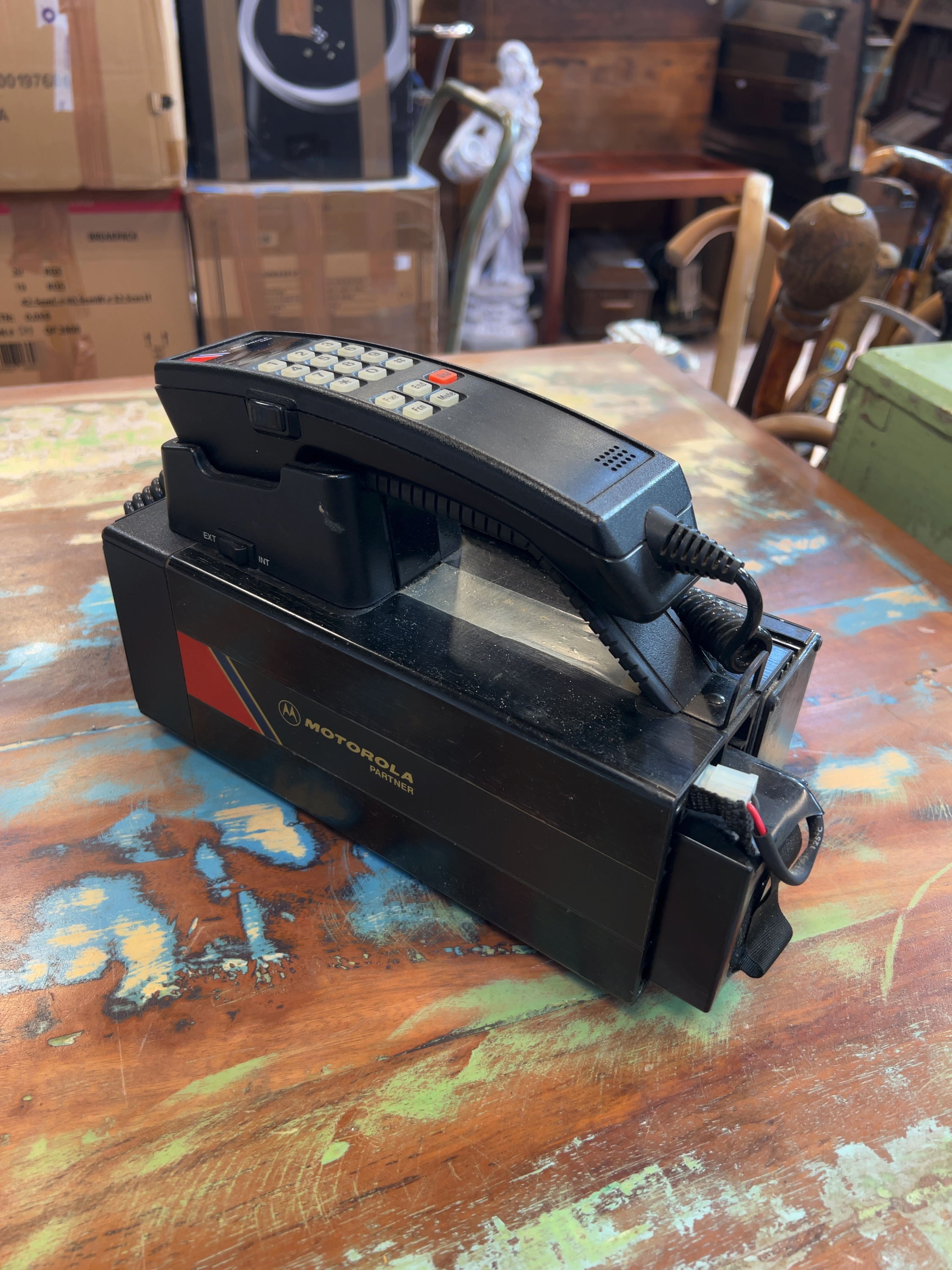 A vintage Motorola 4500X Partner transportable cellular telephone, commonly known as a bag phone, dating from the late 1980s to early 1990s and housed in its original black padded nylon carrying case which includes a shoulder strap. The case features a separate internal compartment containing a black whip antenna and a user manual.