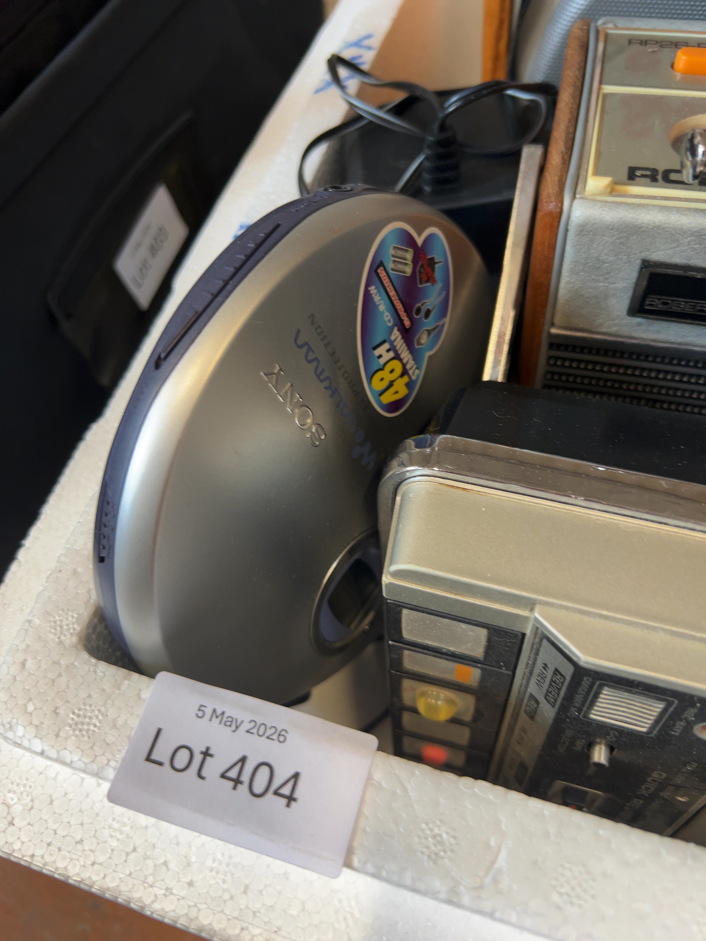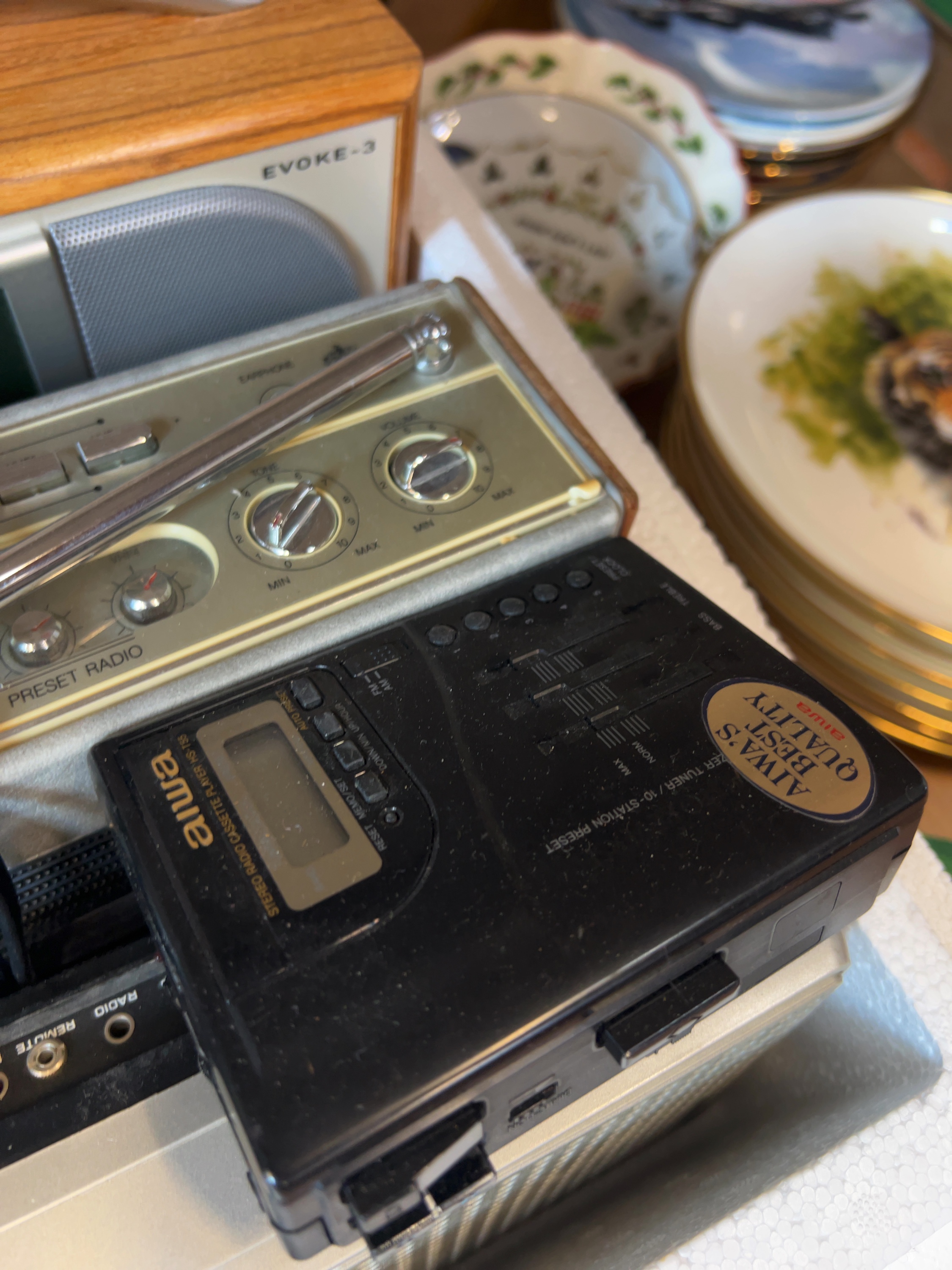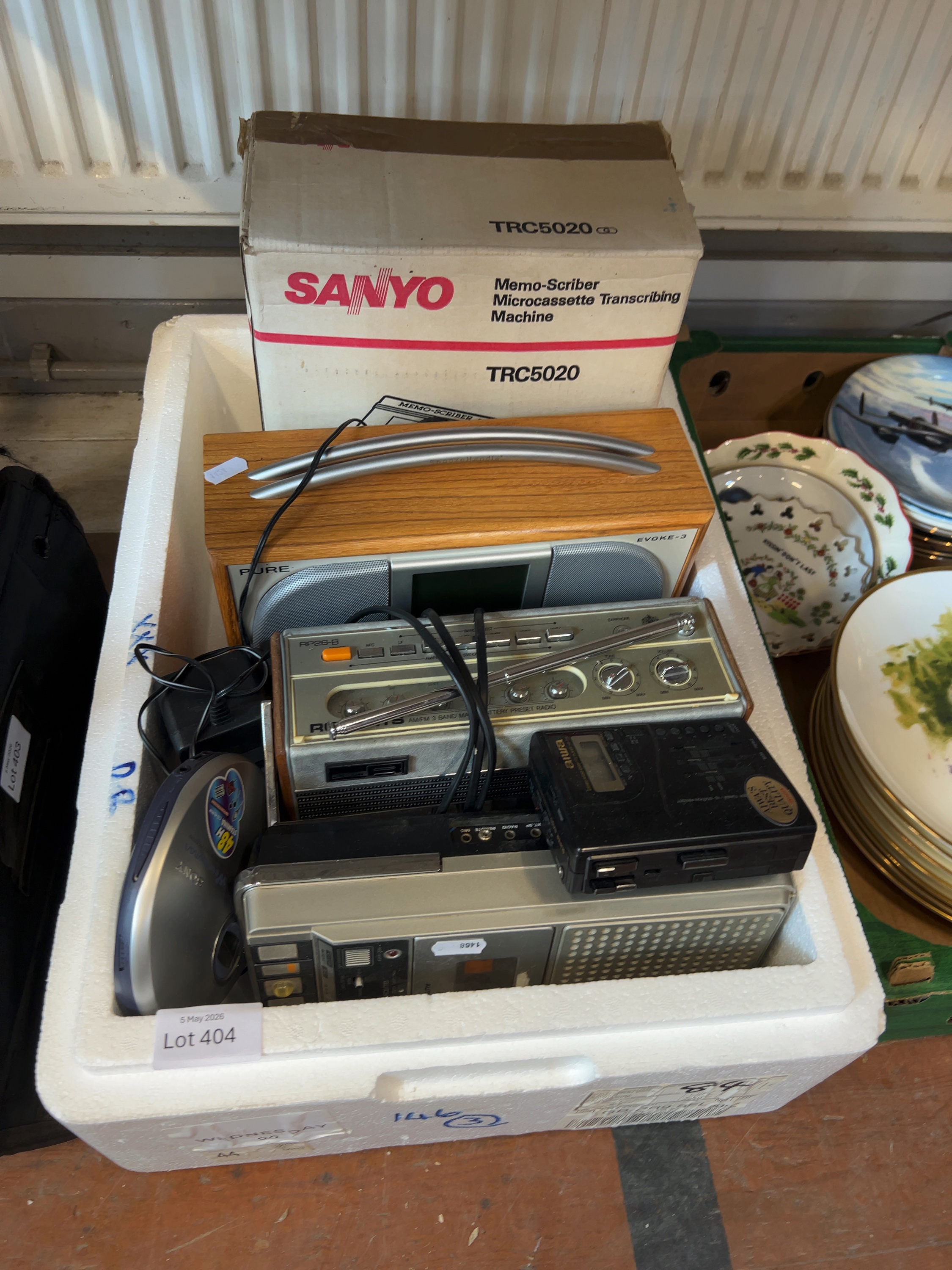 An assortment of portable audio devices and transcribing machinery. Key items include a Sanyo Memo-Scriber TRC5020 microcassette transcribing machine; Pure Evoke-3 digital radio, a Roberts RP26-B three-band portable radio; an Aiwa HS-T55 stereo radio cassette player with a digital tuner and a Sony CD Walkman and a portable cassette recorder and an AC power adapter.