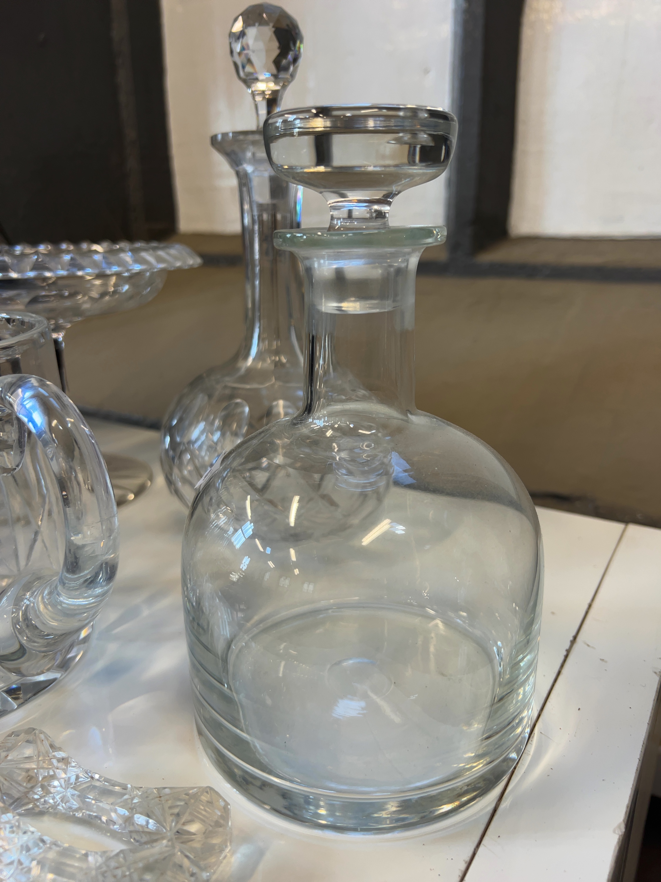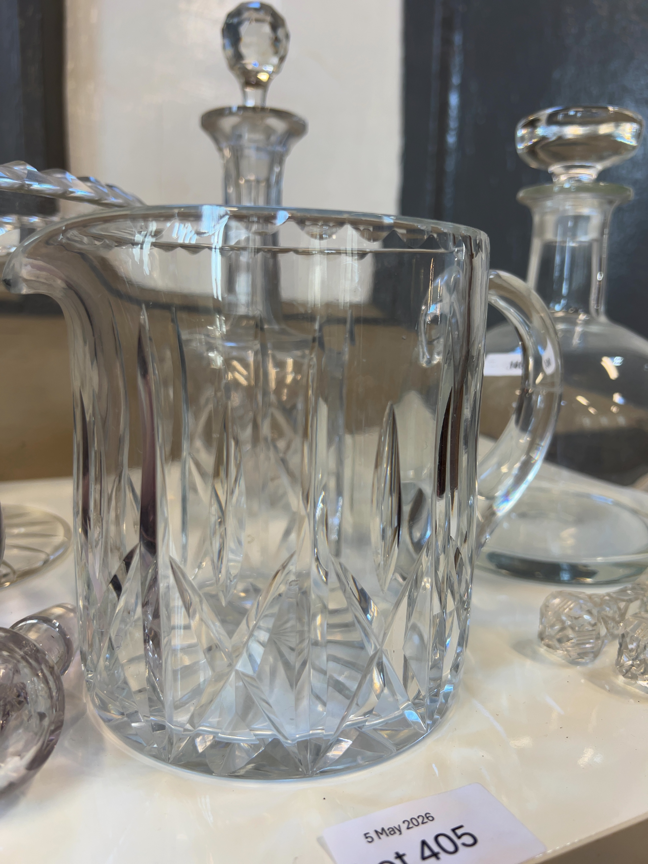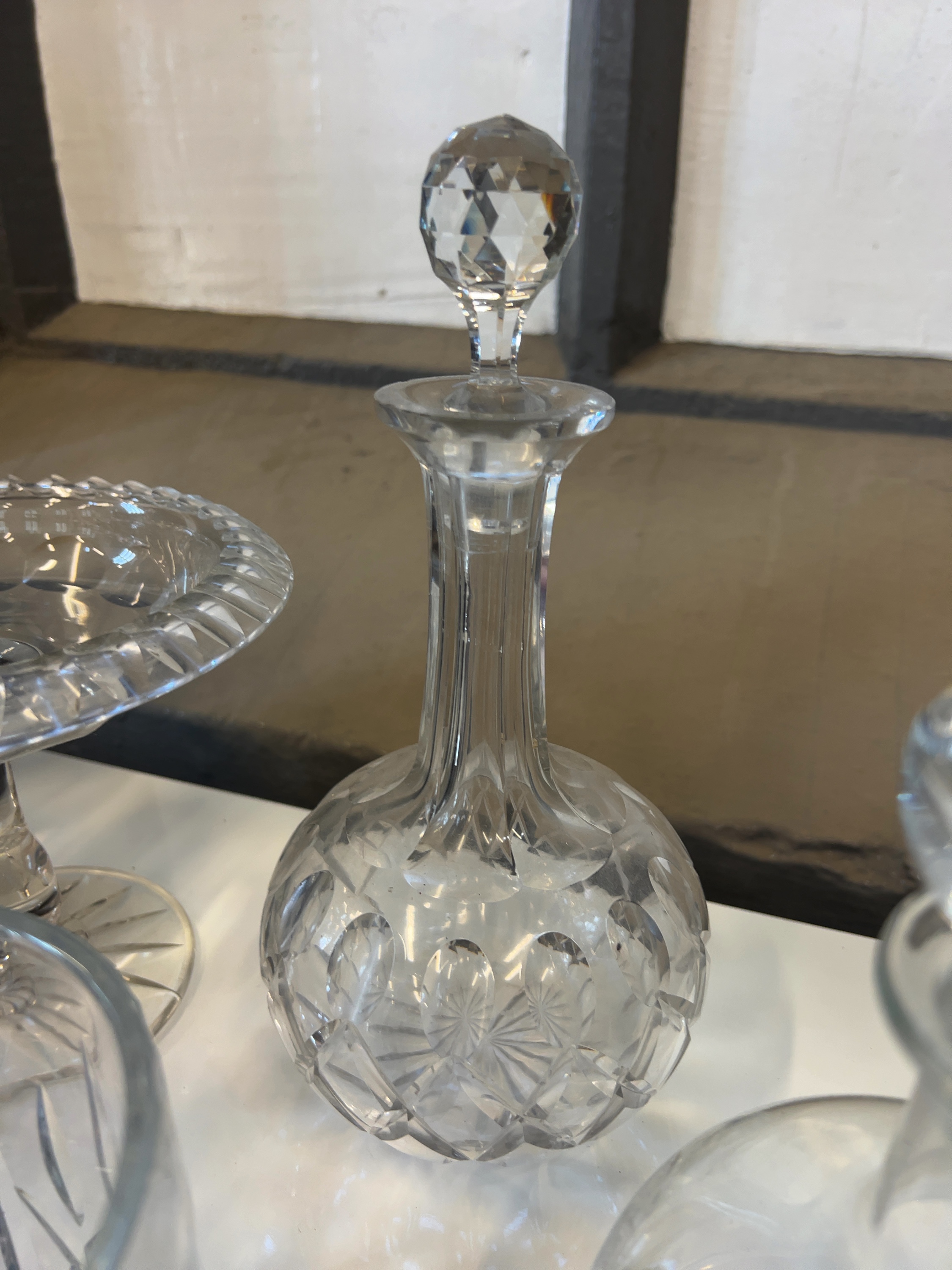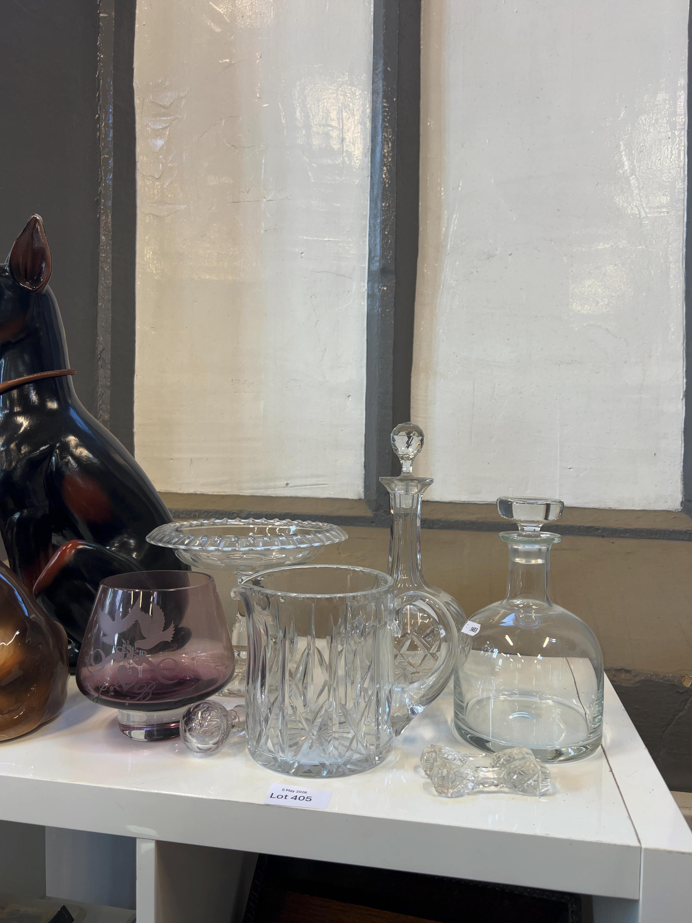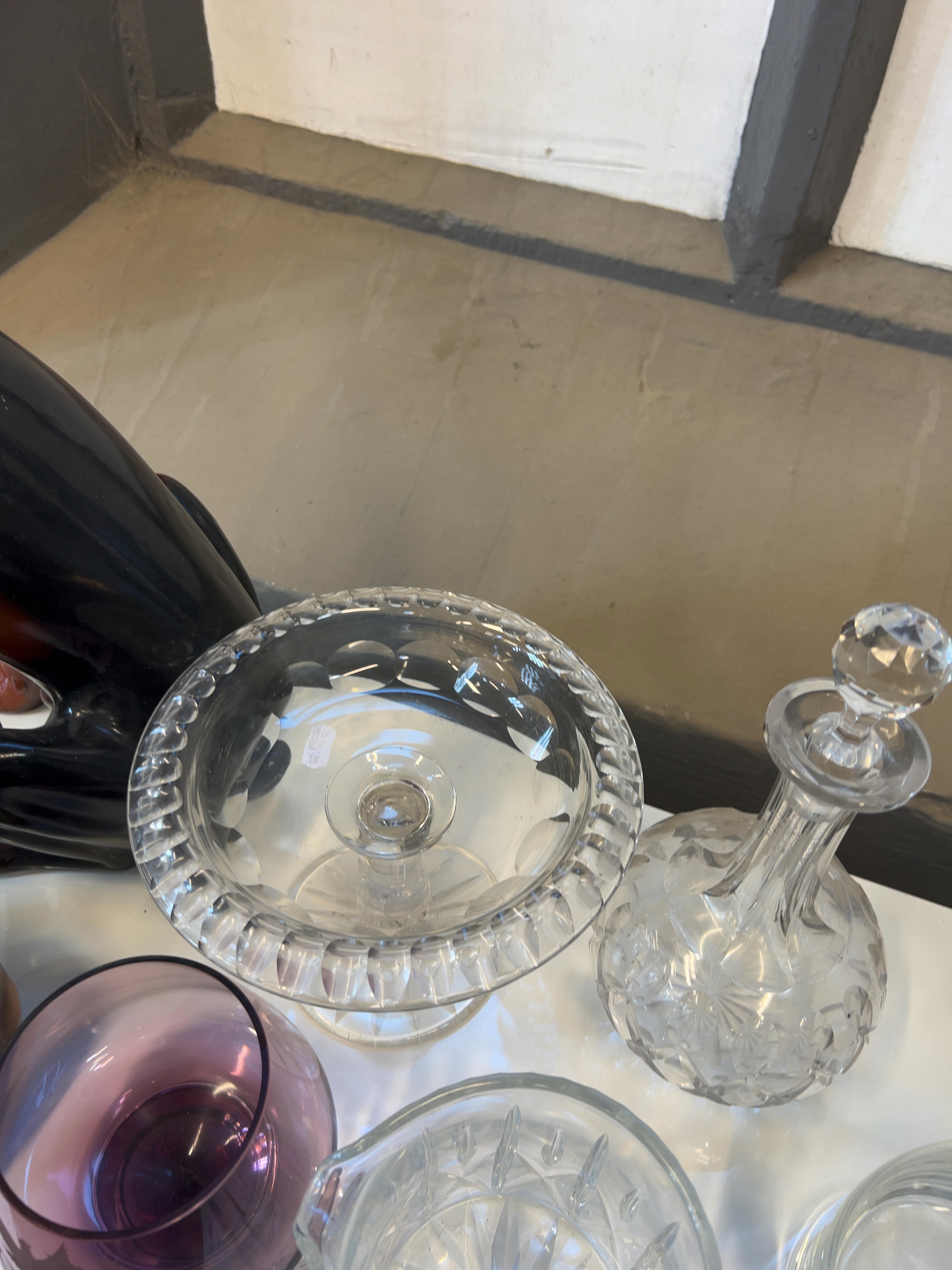 An assortment of decorative glassware and cut crystal items. The collection includes a substantial lead crystal pitcher, a tall, slender-necked cut glass decanter, a clear glass ship’s decanter of traditional form with a disc-shaped stopper, and a circular pedestal tazza or cake stand, purple-tinted amethyst glass vessel featuring etched depictions of birds amongst foliage, a faceted crystal knife rest, and a spare glass stopper. No maker’s marks are visible on the items.