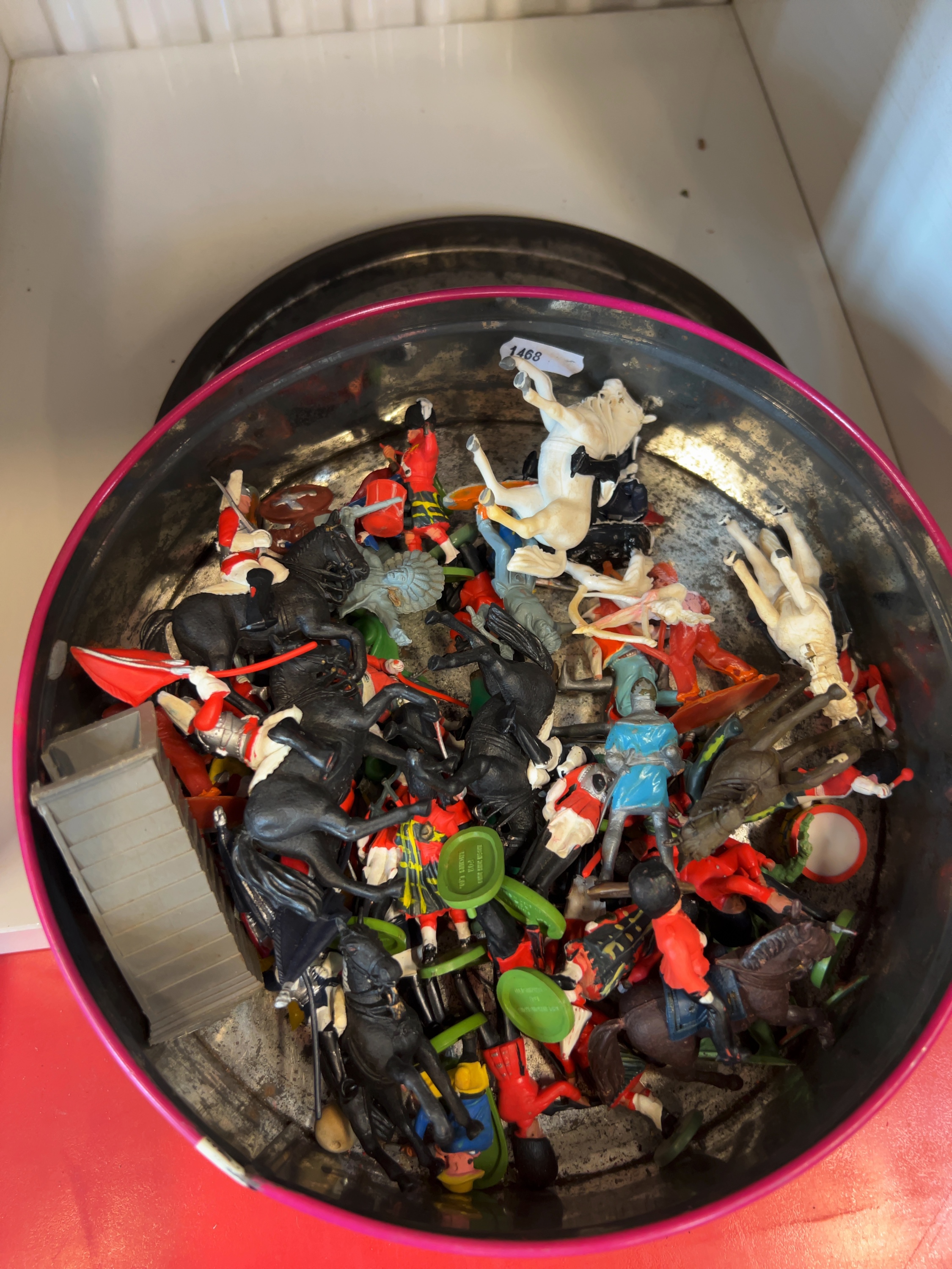 The figures are in used, played-with condition. Visible paint wear, scuffing, and surface marks are present throughout the collection. Some figures may have minor damages or missing parts consistent with their age and play history. The storage tin exhibits internal wear and minor oxidation.