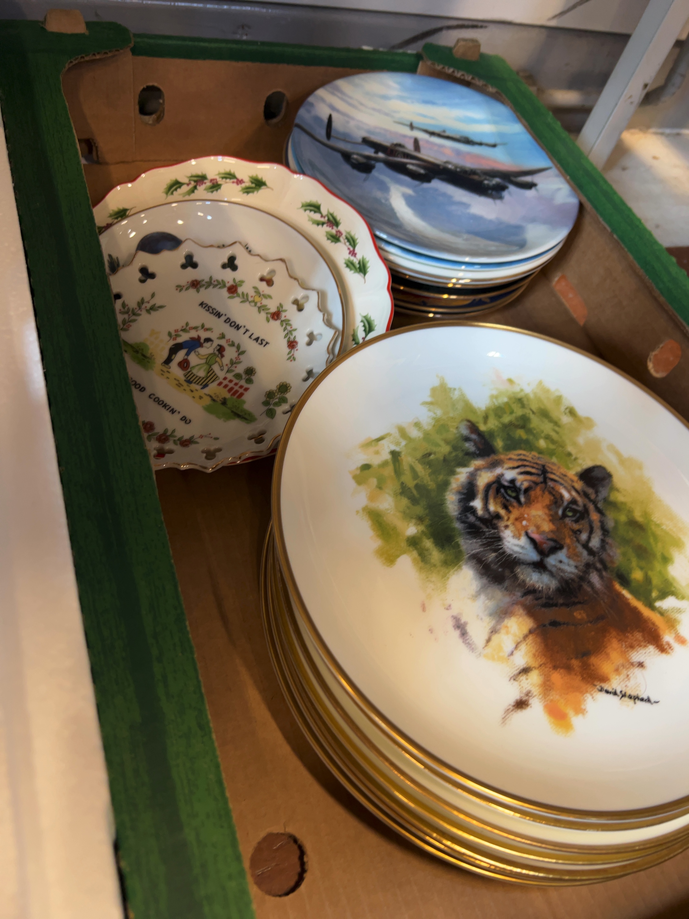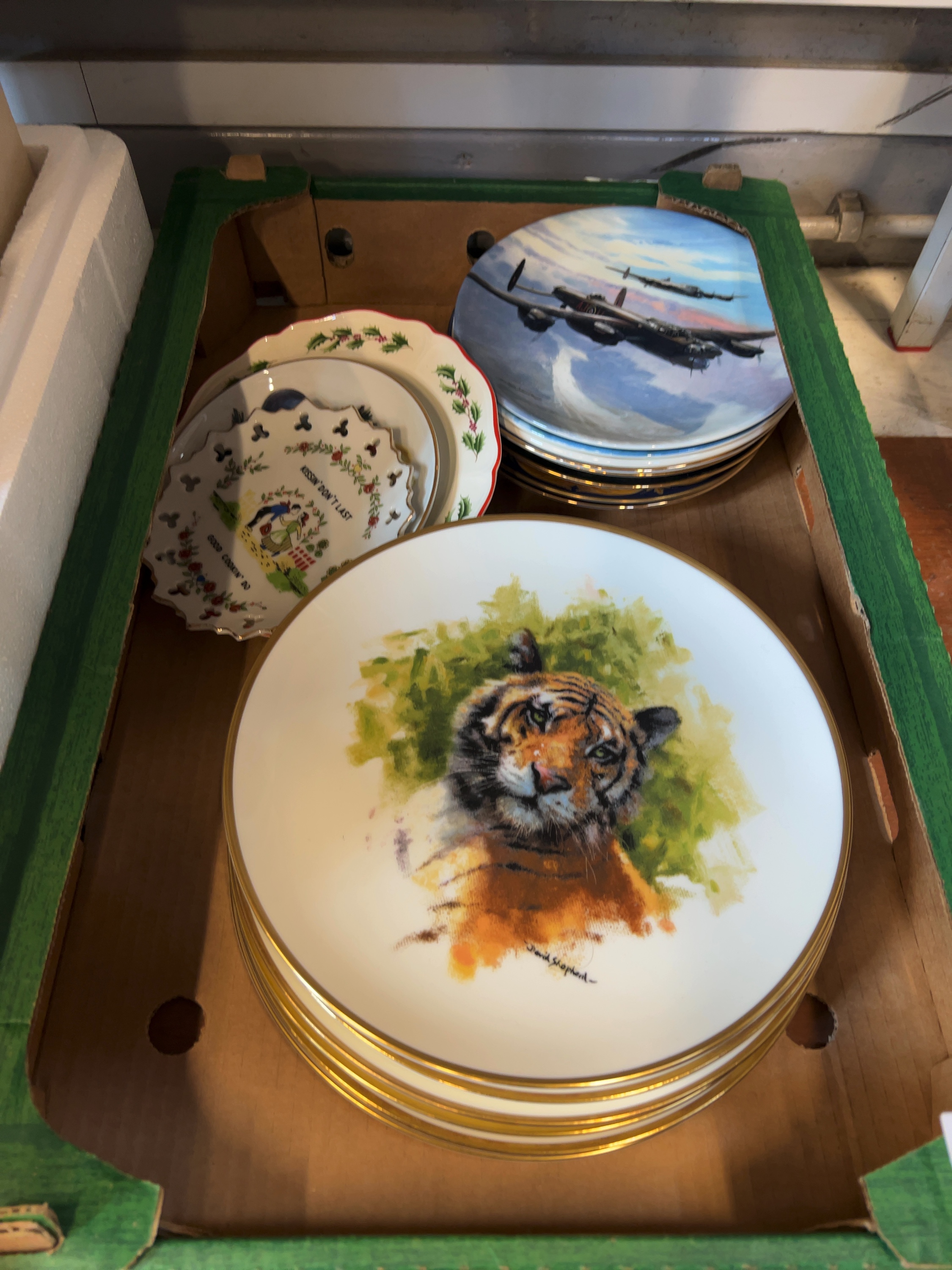 This lot comprises an assortment of ceramic display and collector’s plates. The most prominent group features a series of circular wildlife plates with gilt rims, bearing the printed signature of the British artist David Shepherd and are consistent with limited edition series produced by Wedgwood for the David Shepherd Wildlife Foundation. A second group of plates depicts aviation scenes, specifically Avro Lancaster bombers flying above a cloud layer. Also included is a decorative plate with a scalloped edge and red-lined rim featuring a holly leaf and berry border, and a small reticulated plate with a pierced border. The reticulated plate displays a central garden scene with the printed proverb KISSIN’ DON’T LAST and GOOD COOKIN’ DO.