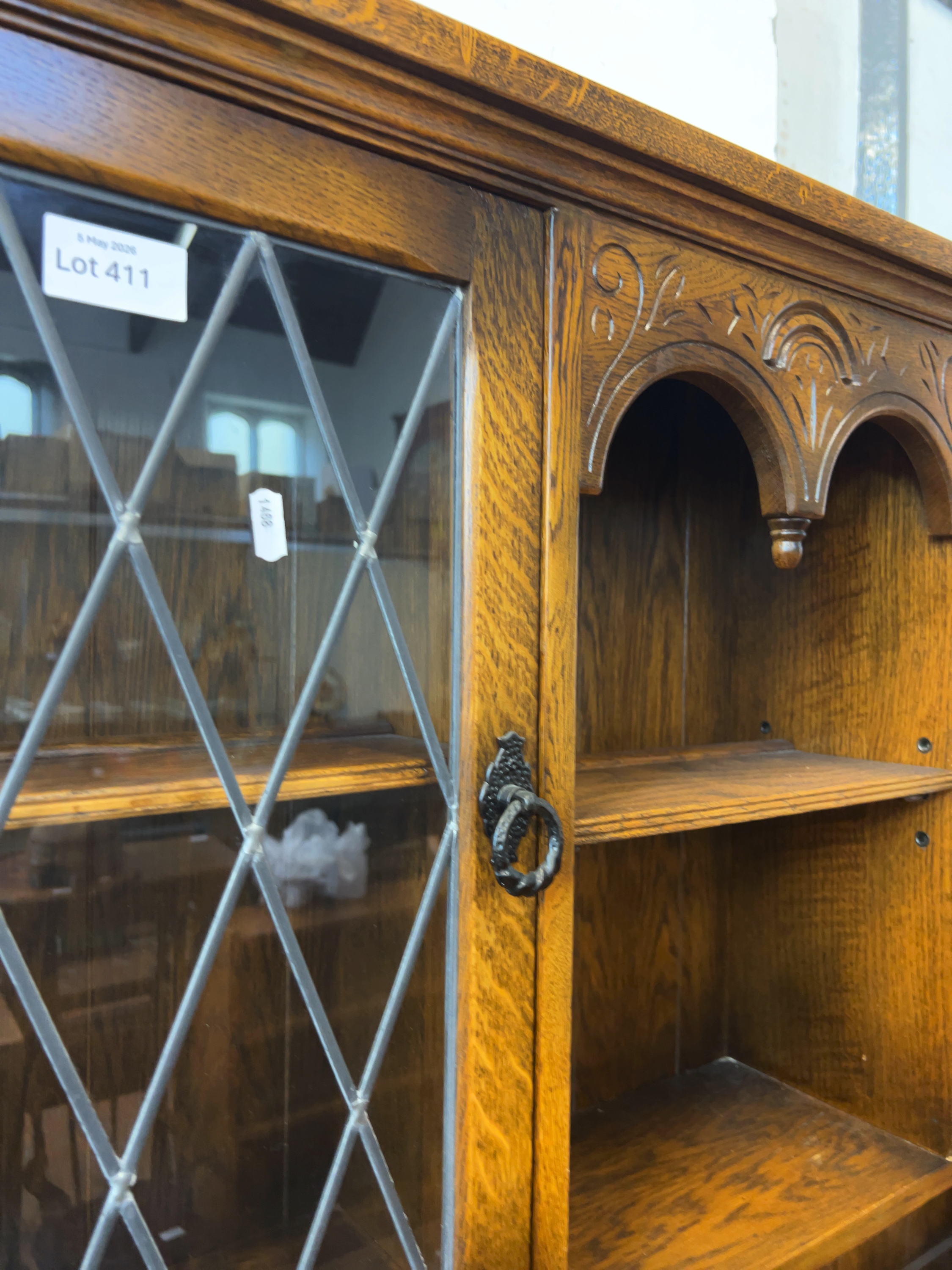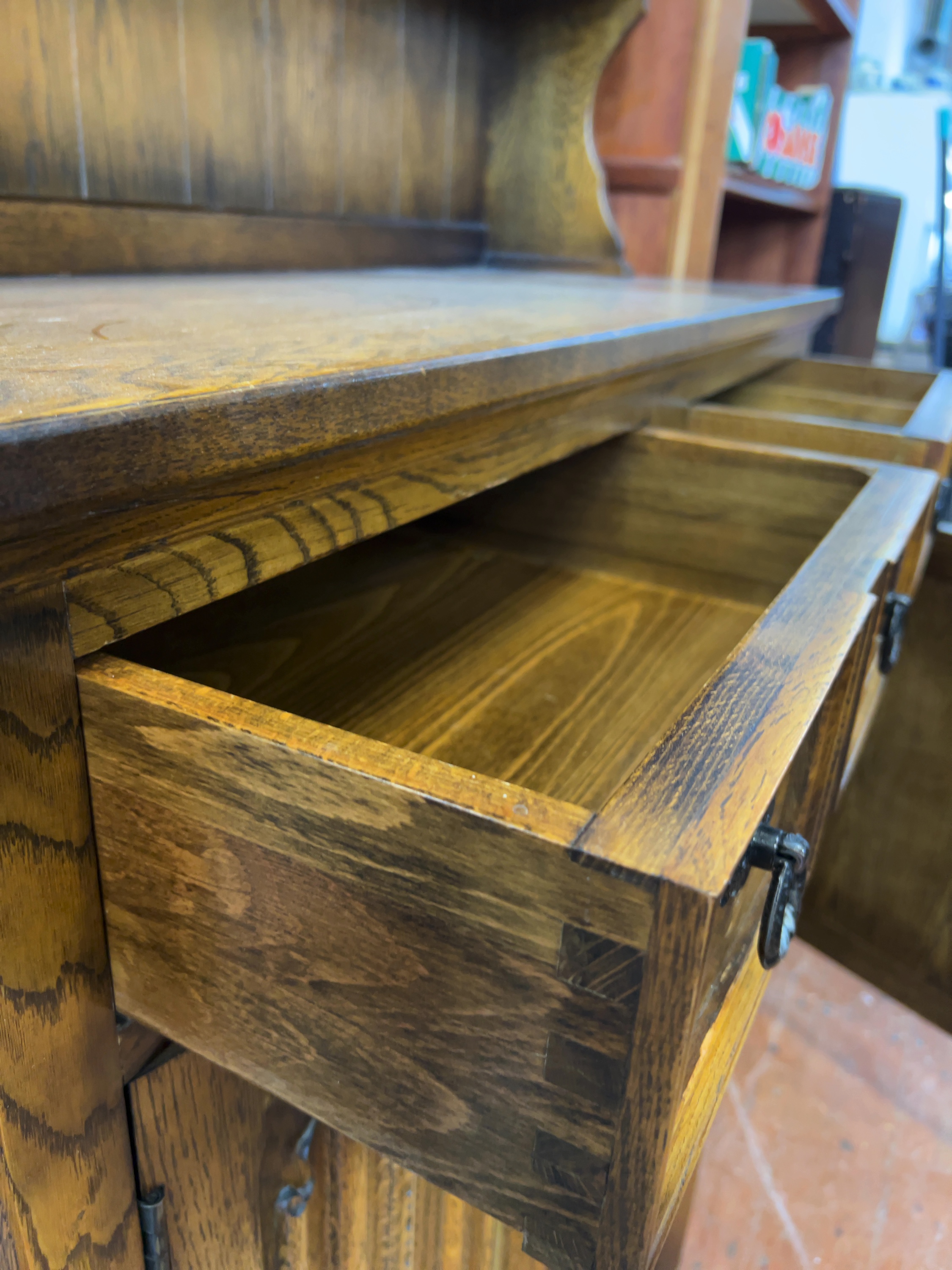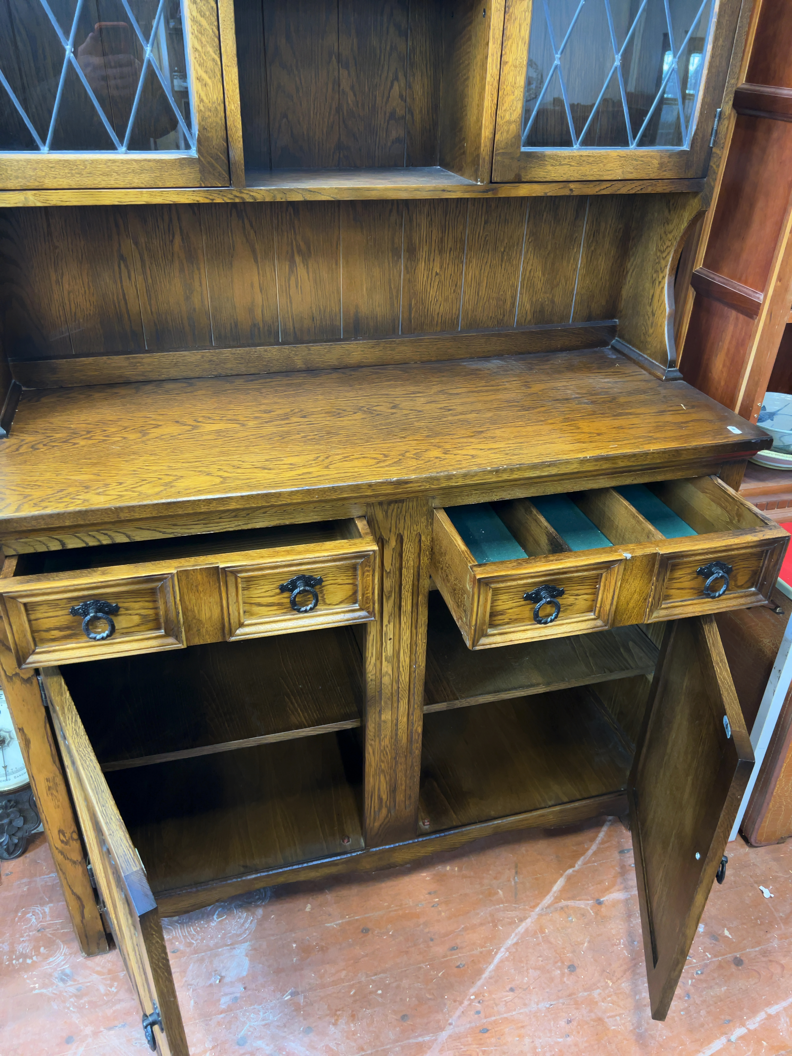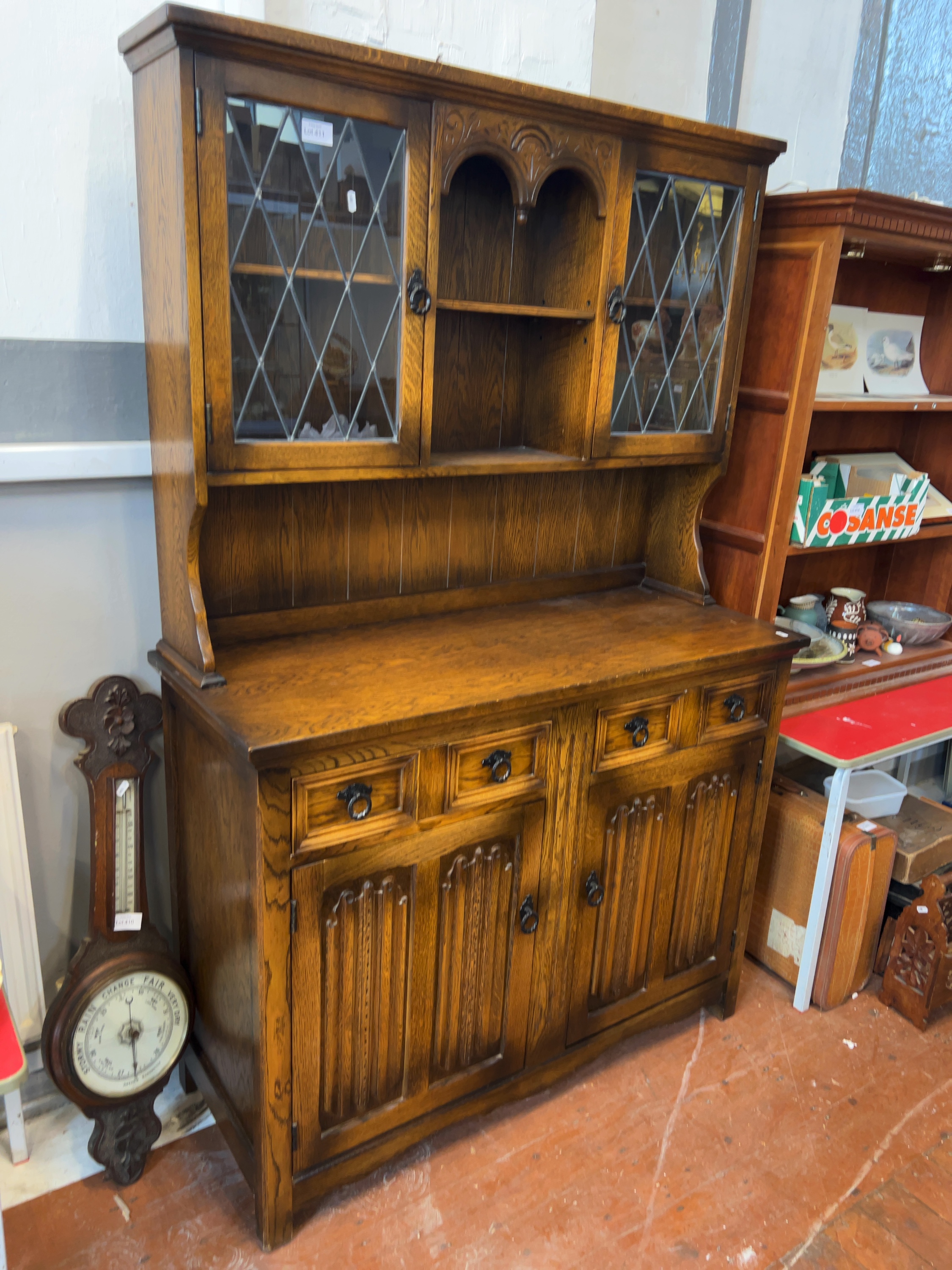 A mid-20th century two-part oak Welsh dresser in the Jacobean Revival style, in the style of the Old Charm range by Wood Bros.