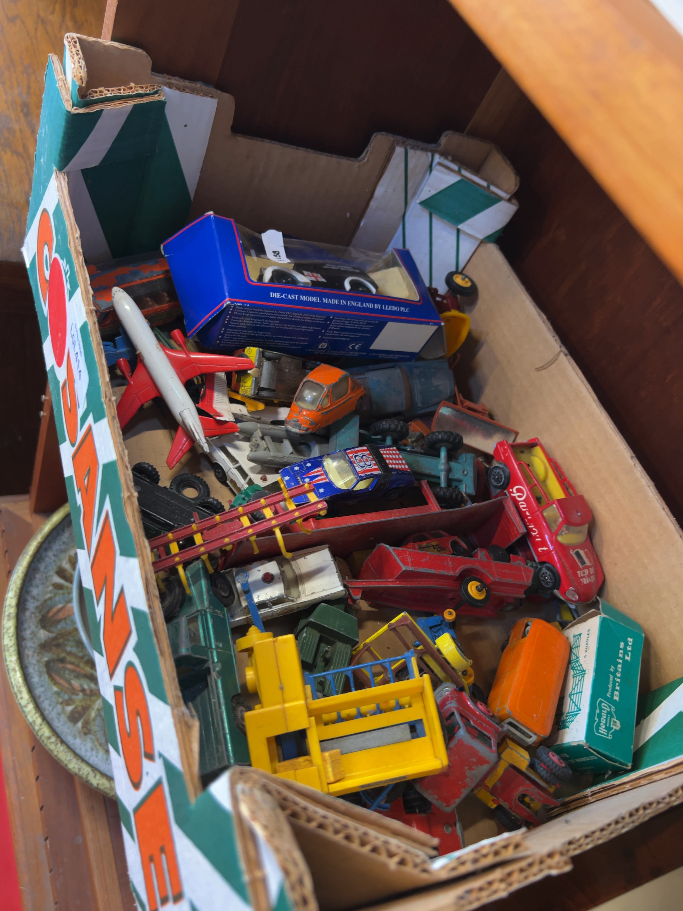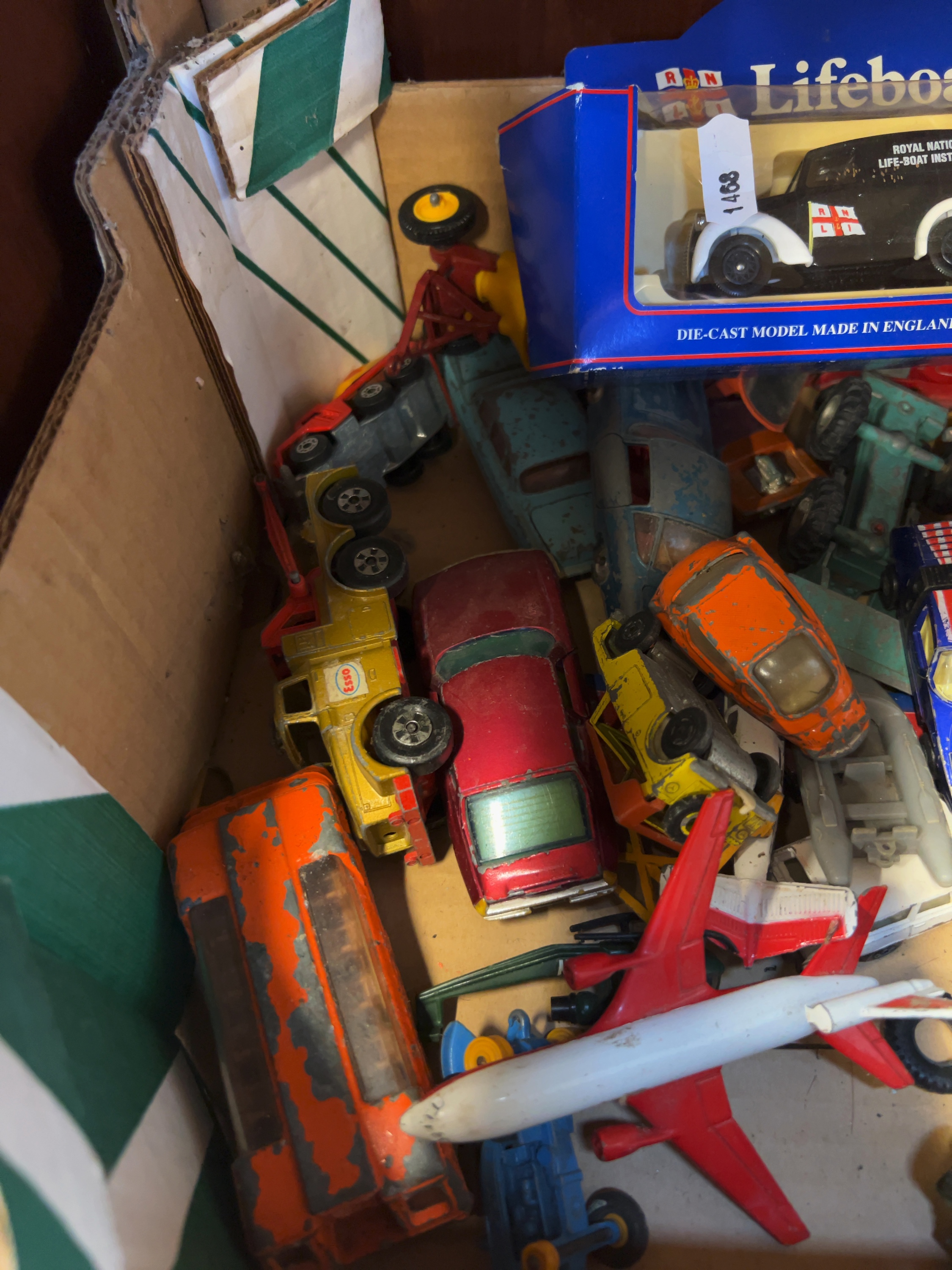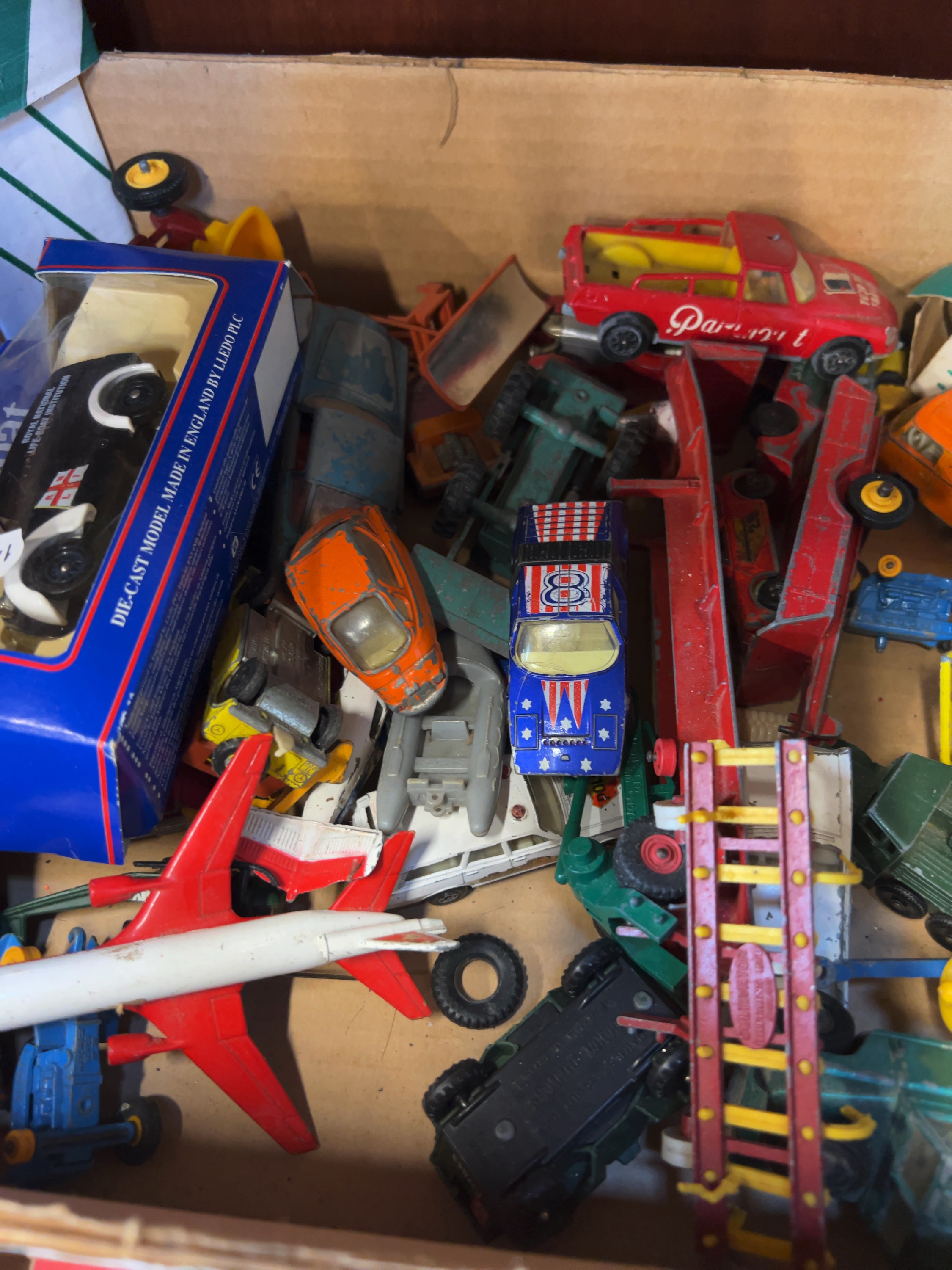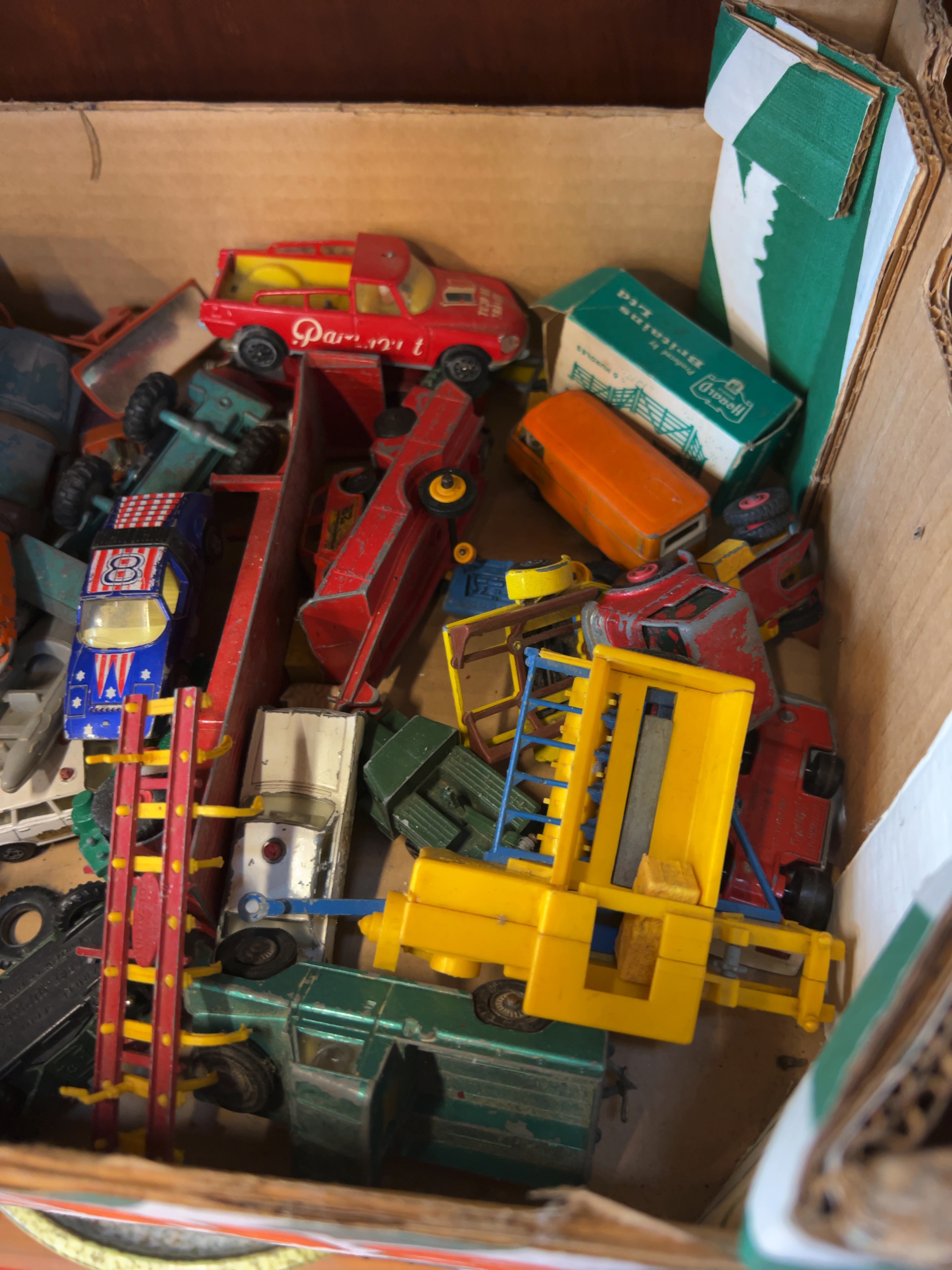 An assortment of vintage toy vehicles and accessories, comprising die-cast metal and moulded plastic models.