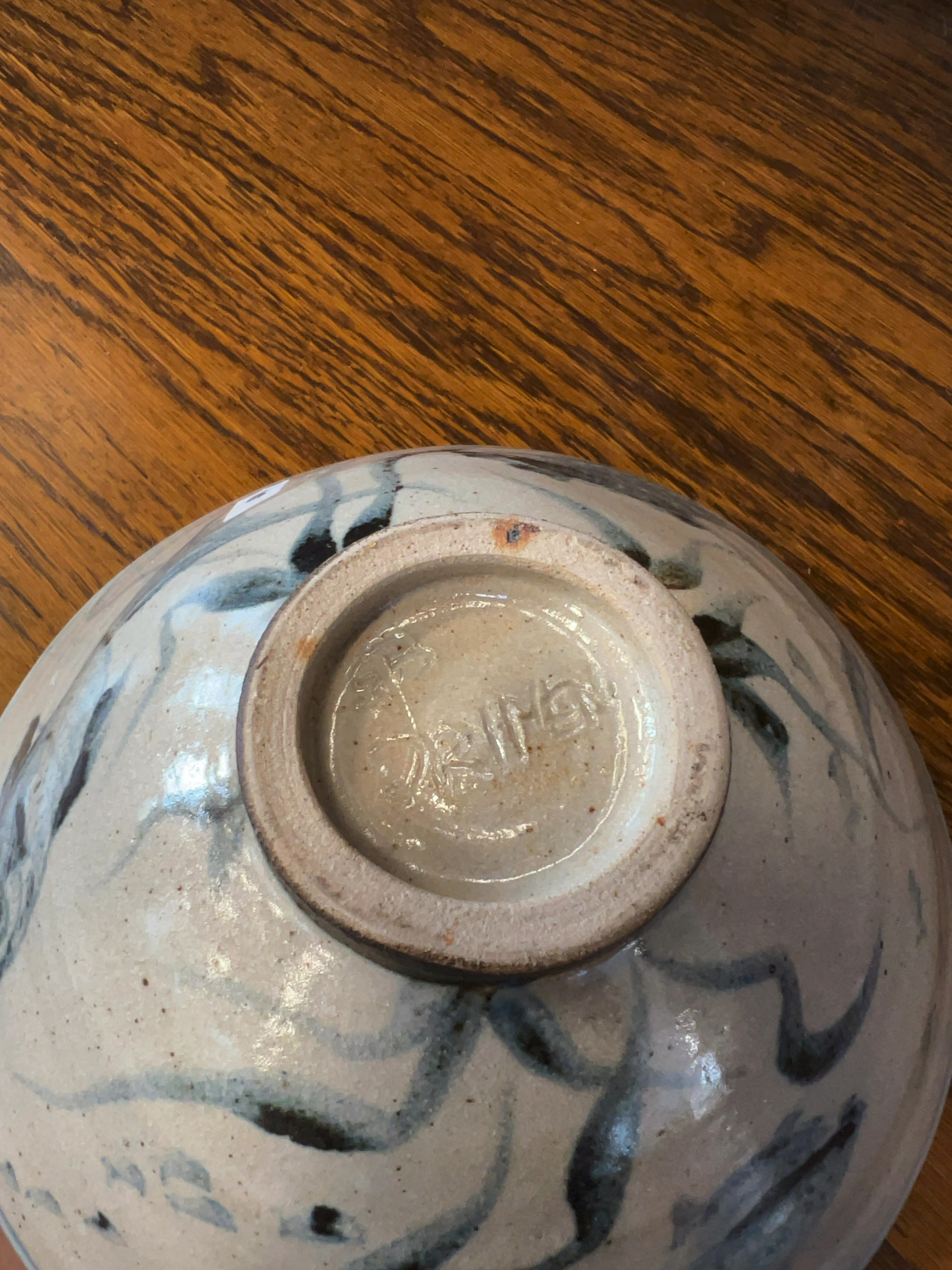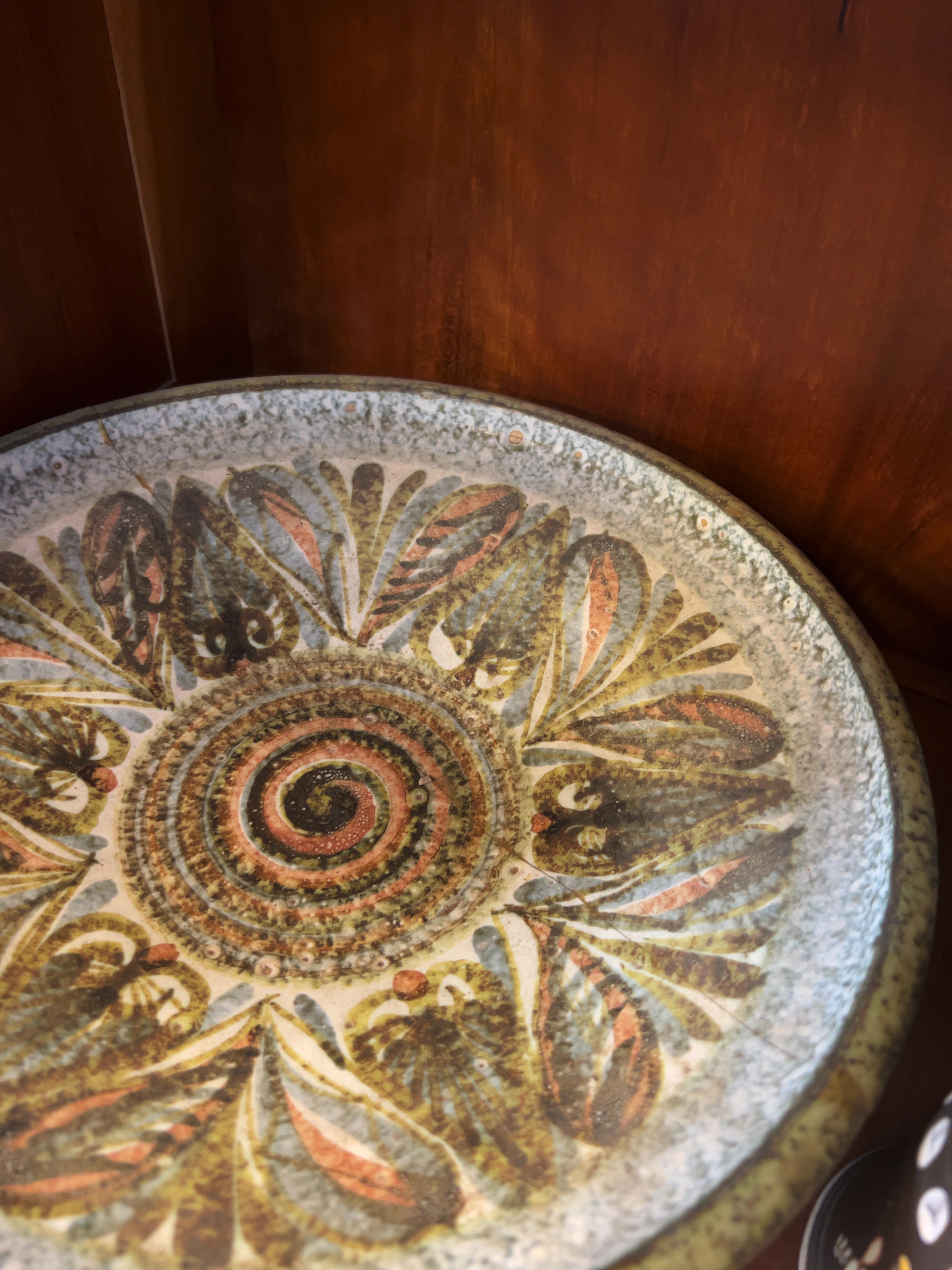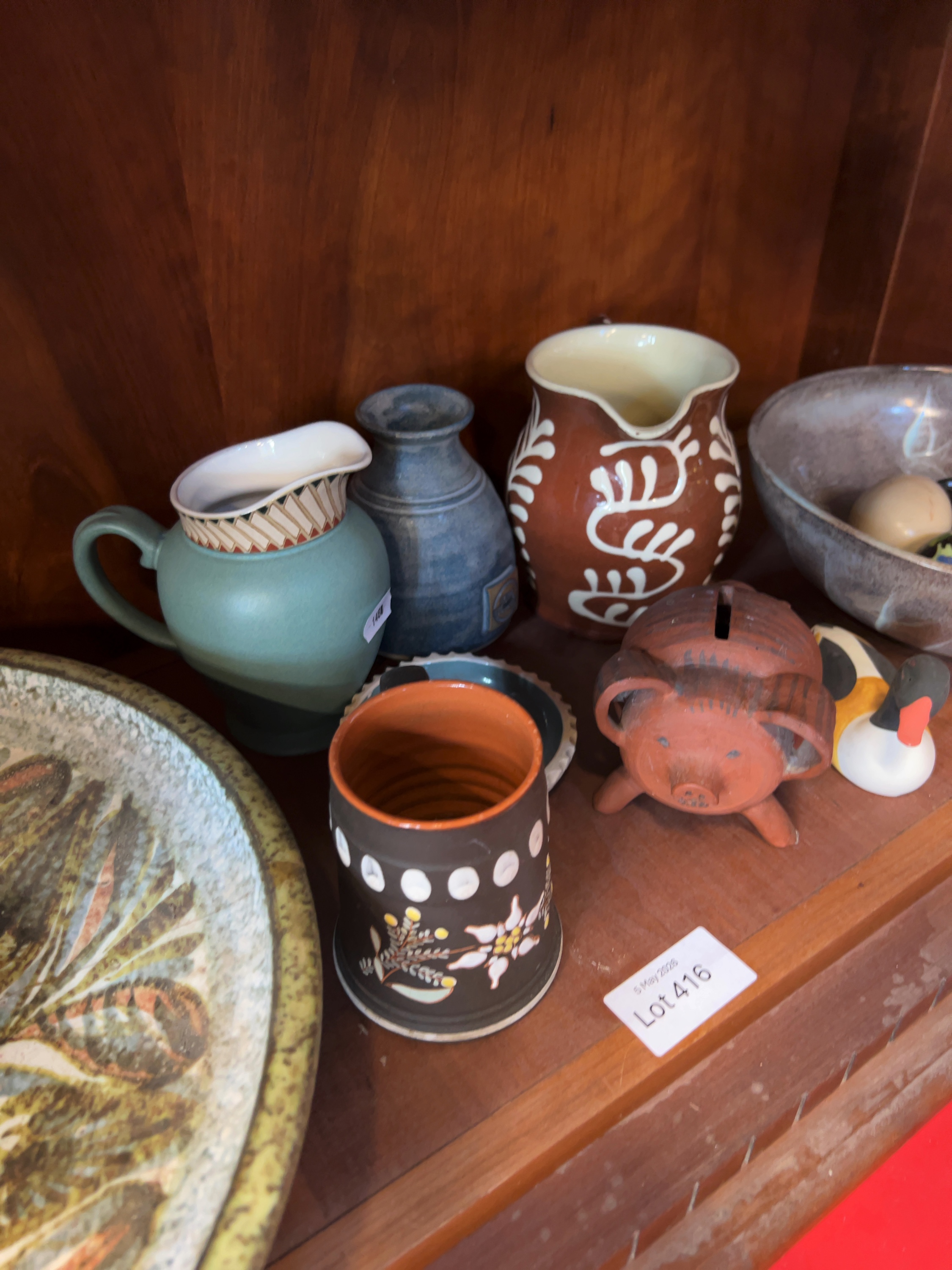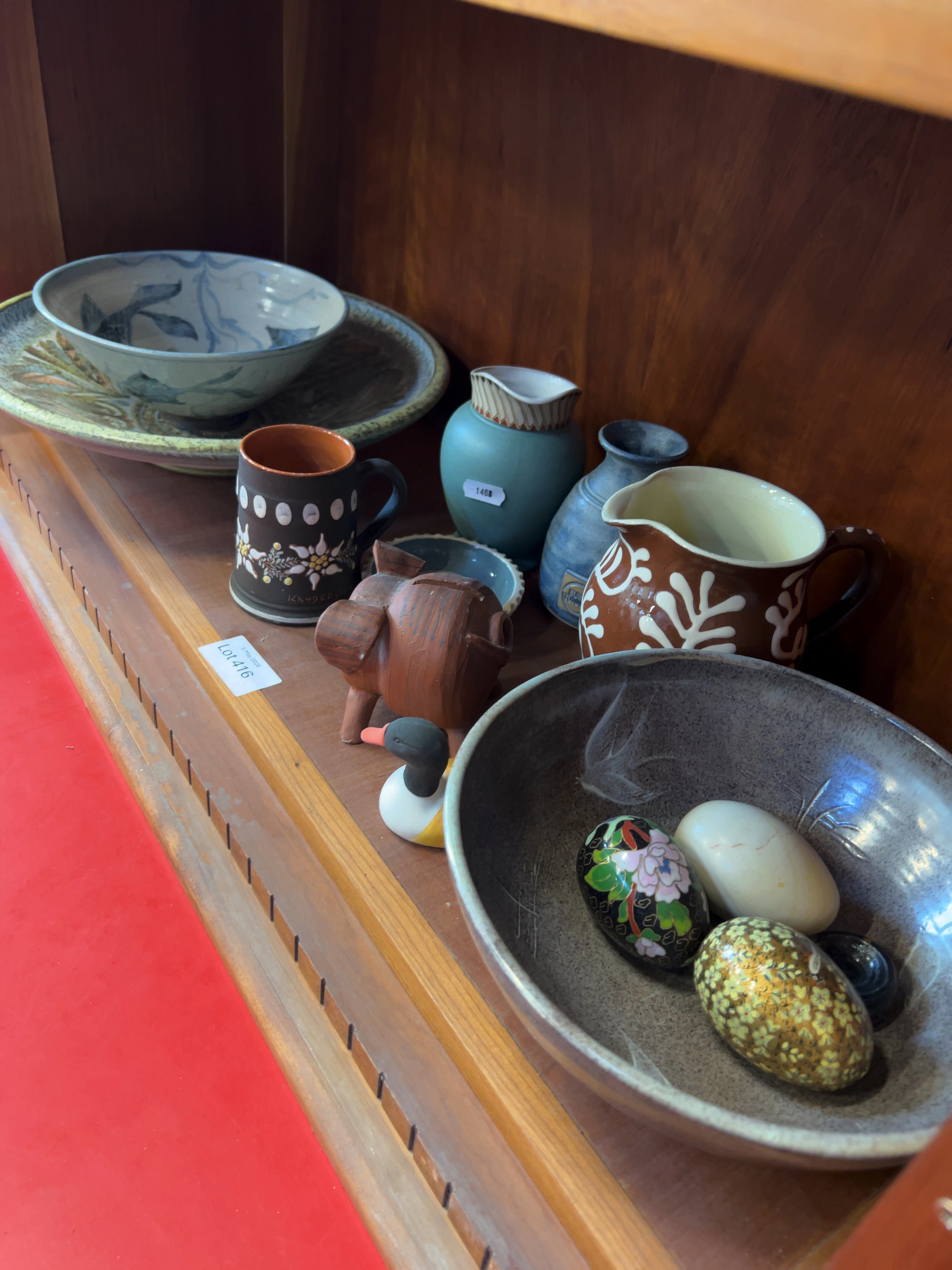 An assortment of studio and decorative ceramics including a shallow stoneware bowl marked MERIDEN; a cylindrical earthenware mug inscribed KANDEL near the base; a large circular charger, two jugs; a small blue-glazed stoneware vase, a terracotta piggy bank, a small ceramic bird figurine, and a brown-glazed bowl containing three decorative eggs with floral, stone, and gold-patterned finishes.