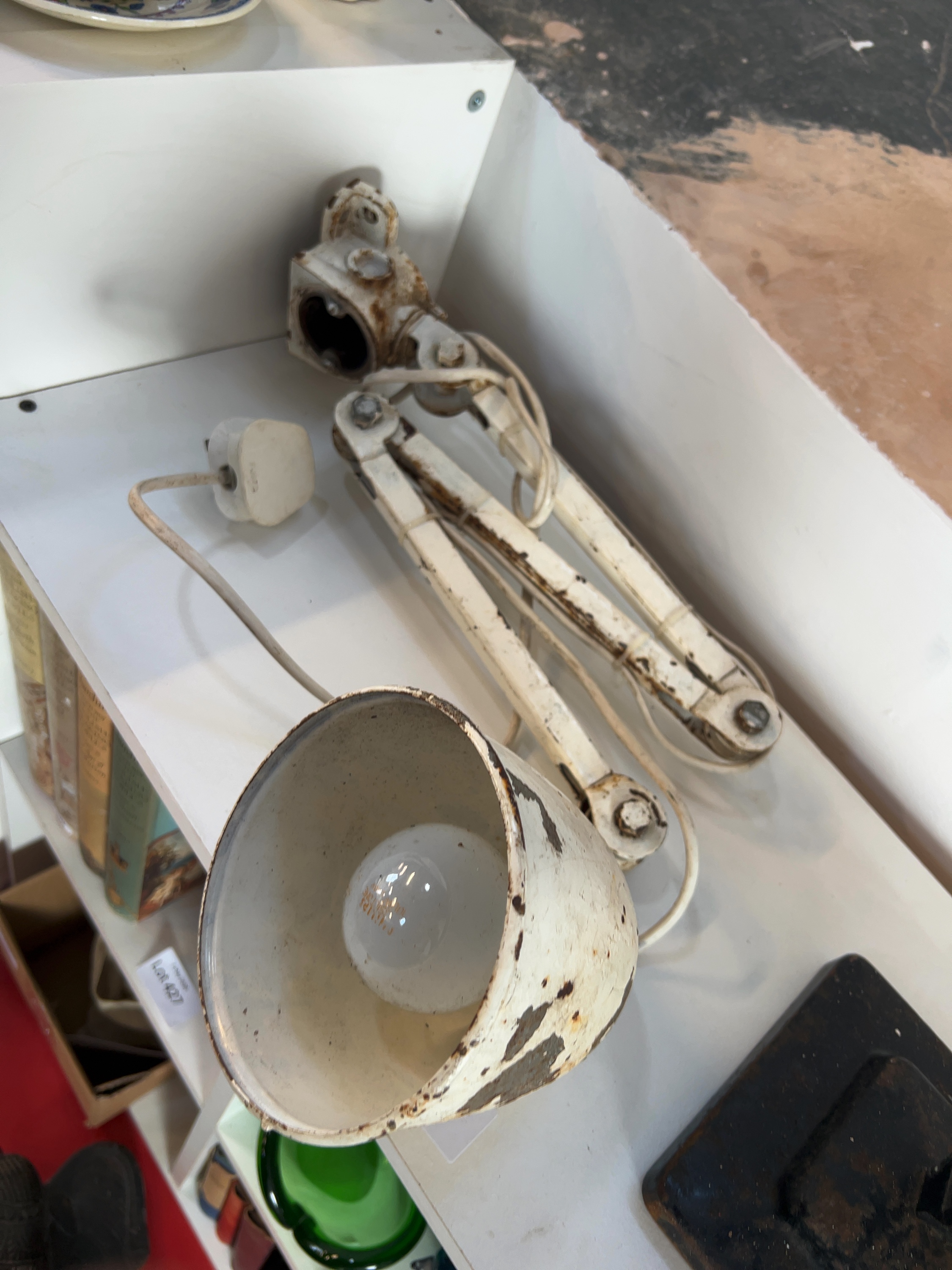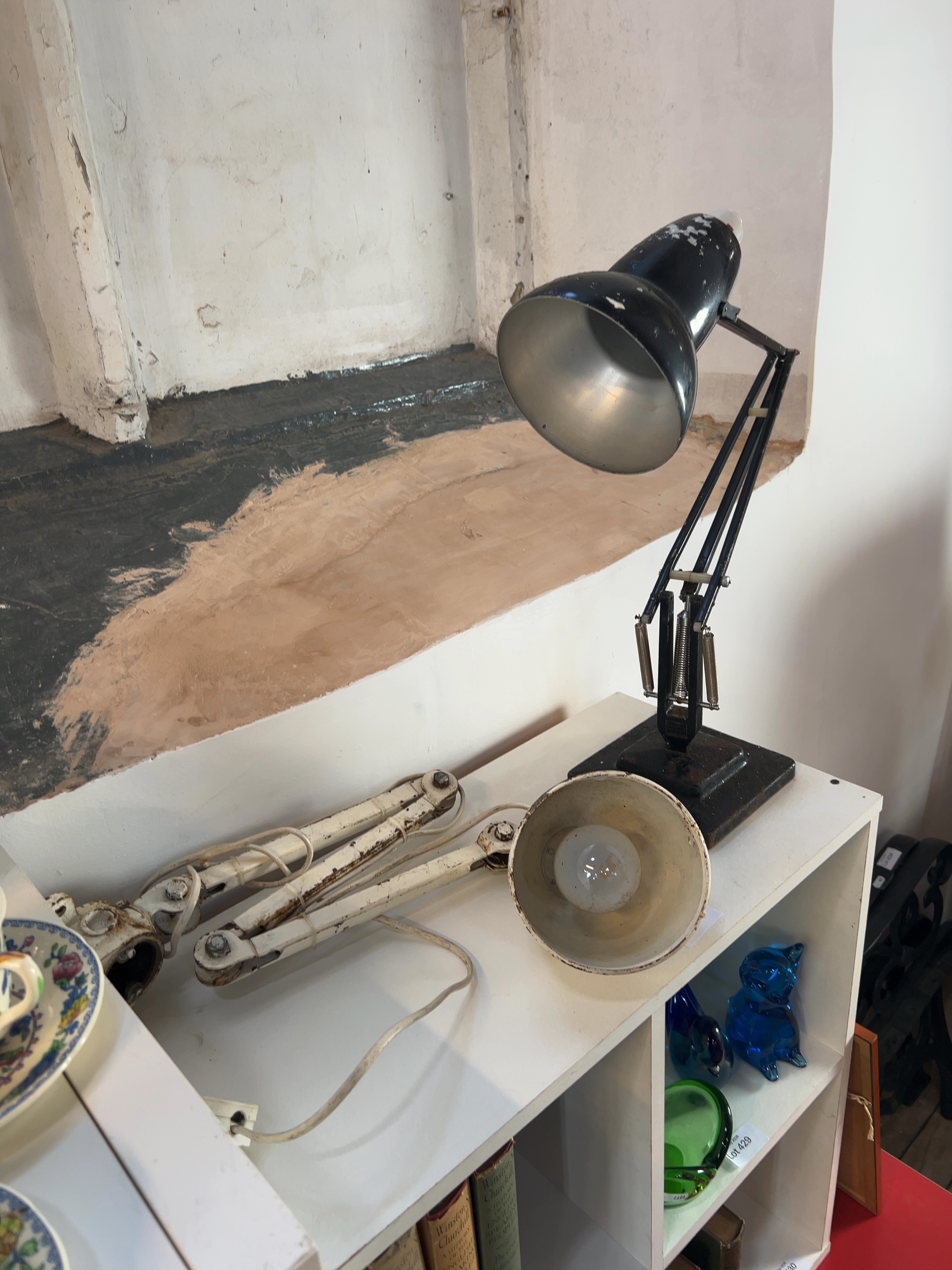 A lot comprising two articulated industrial lamps. The first is a black painted Anglepoise desk lamp, Model 1227, manufactured by Herbert Terry & Sons Ltd with plaque transcribed THE ANGLEPOISE PAT. IN Gt. BT. AND ABROAD. The second lamp is a white painted articulated workshop lamp with a conical shade, currently lacking its base or mounting bracket. Both items are fitted with white plastic cords and UK three-pin plugs.