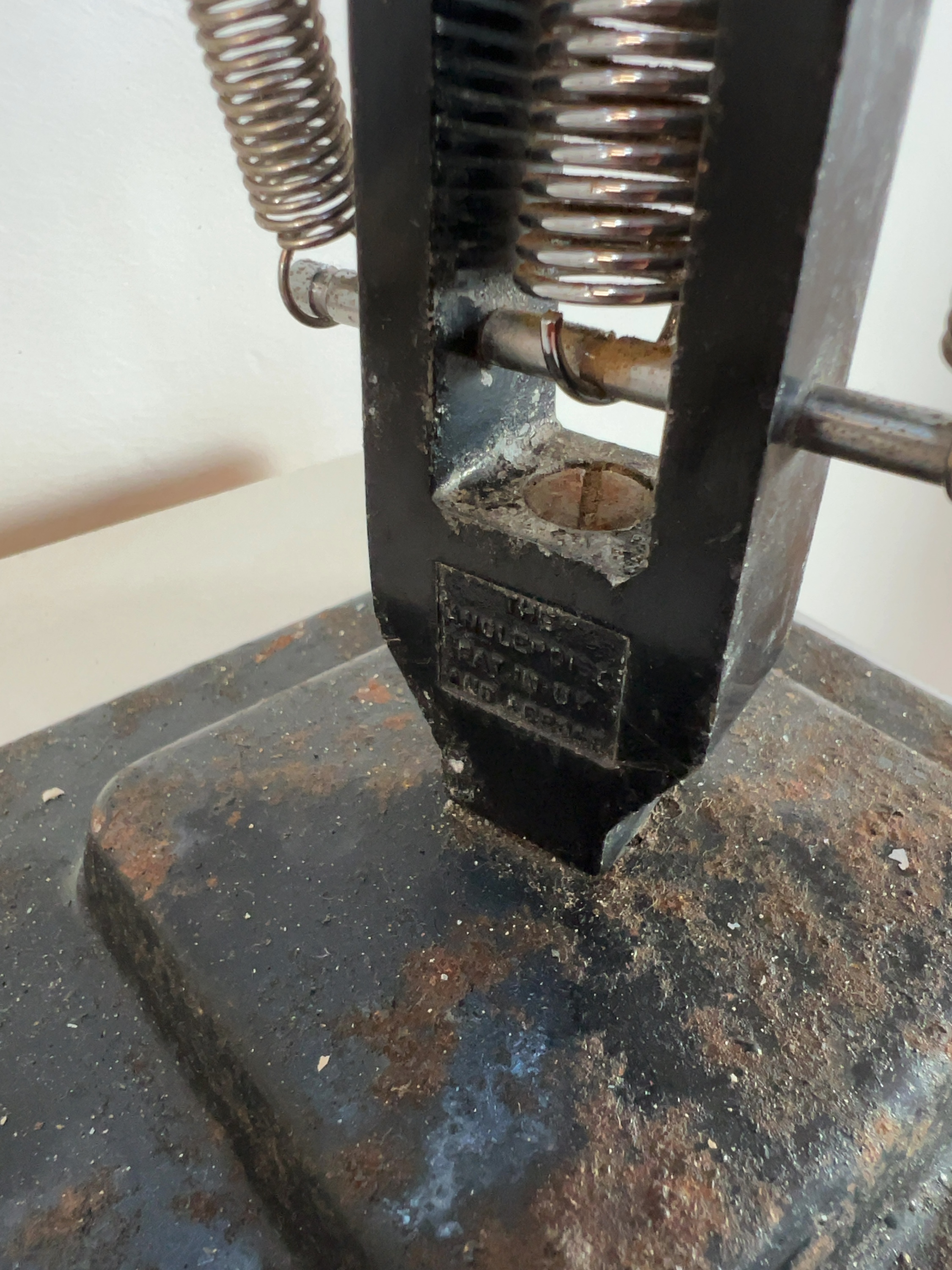 Both lamps exhibit significant wear consistent with age and industrial use. The black lamp shows heavy surface rust and pitting to the base, along with paint loss and chips to the metal arms and shade. The white lamp is in poor condition with extensive paint flaking and surface oxidation throughout, and is missing its original base. Neither lamp has been tested for electrical safety; they are sold as found and must be rewired by a qualified professional before use.