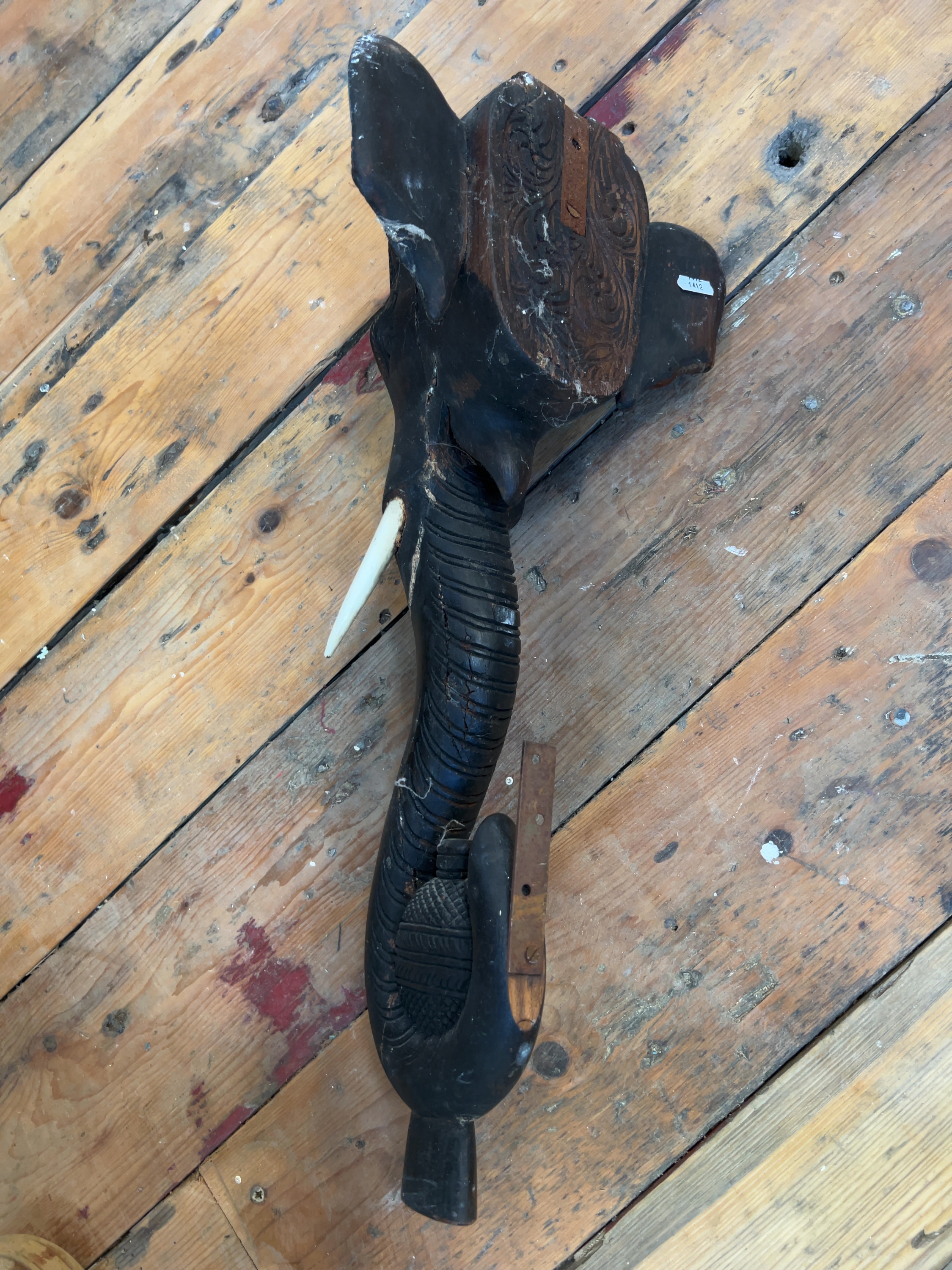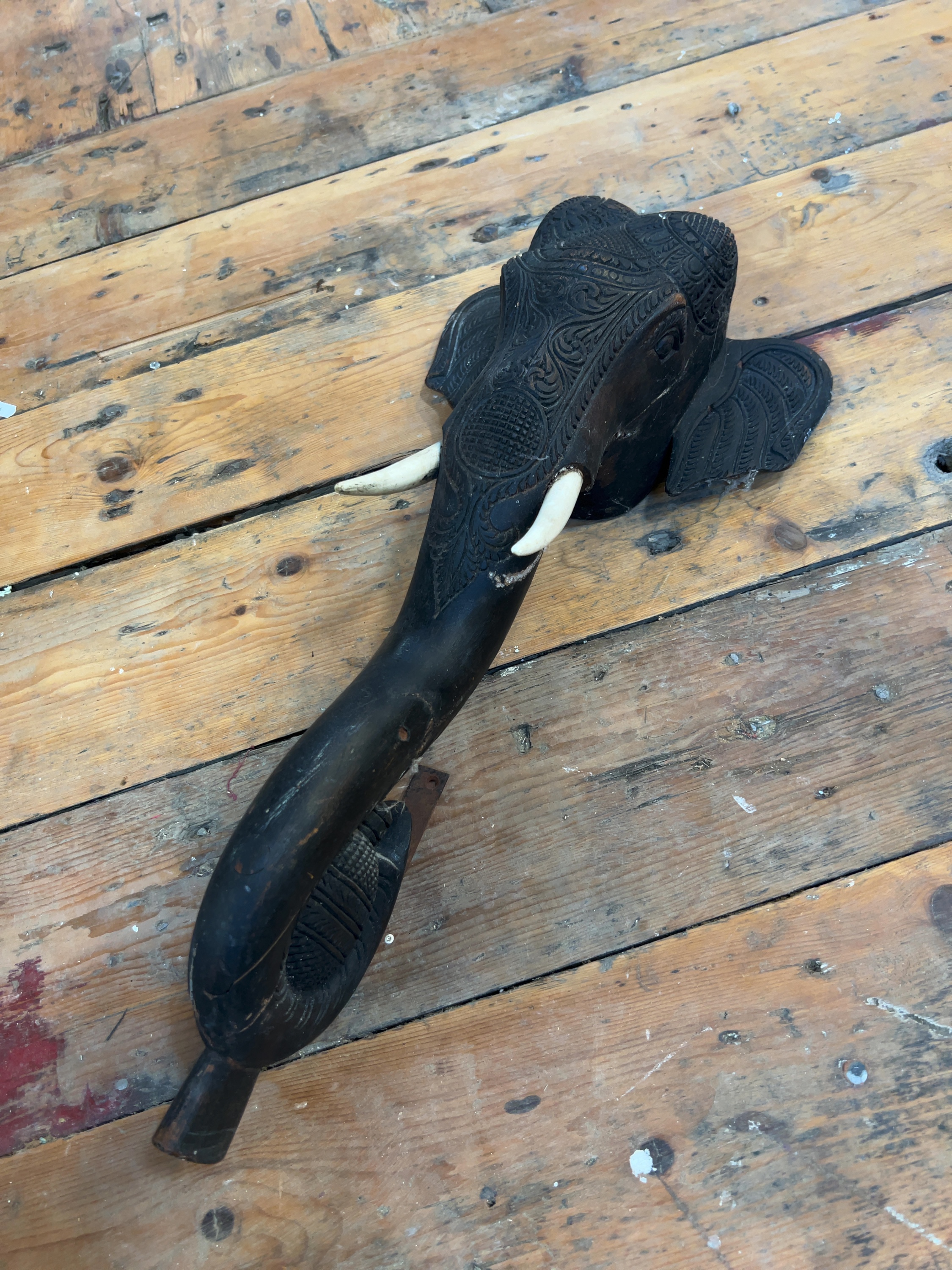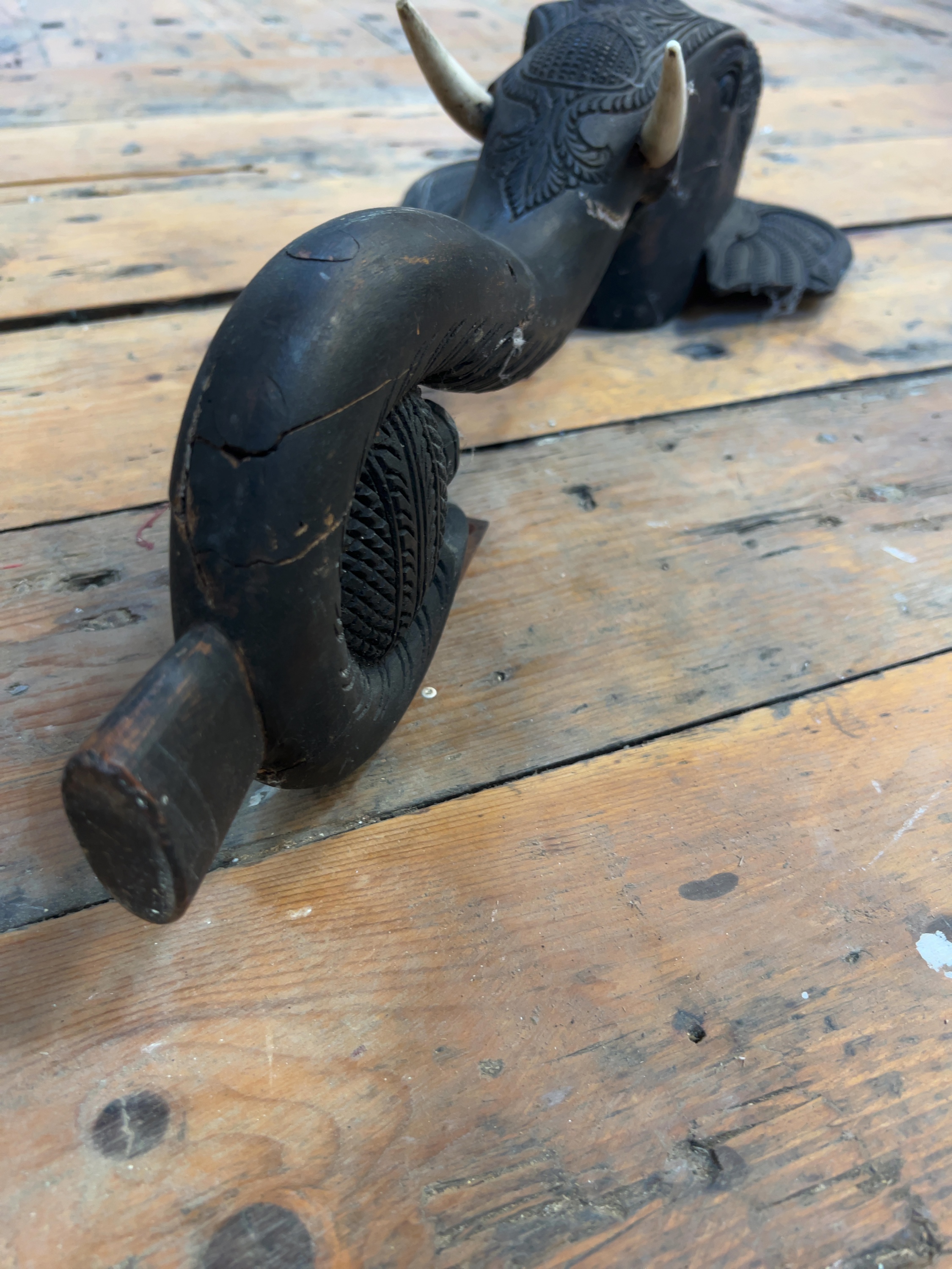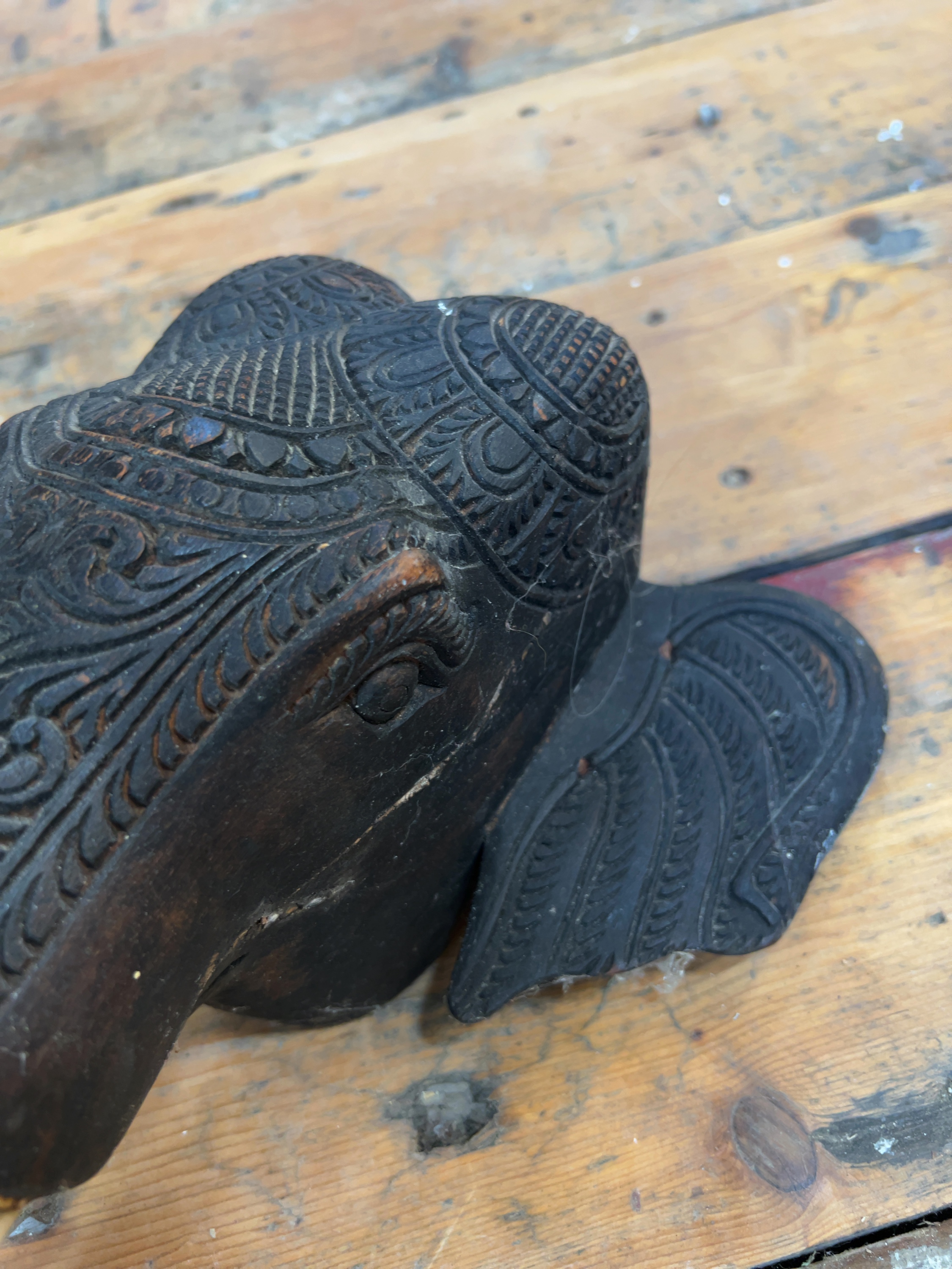 An intricately carved dark hardwood elephant head and trunk, originally serving as a leg for an Anglo-Indian occasional or coffee table.