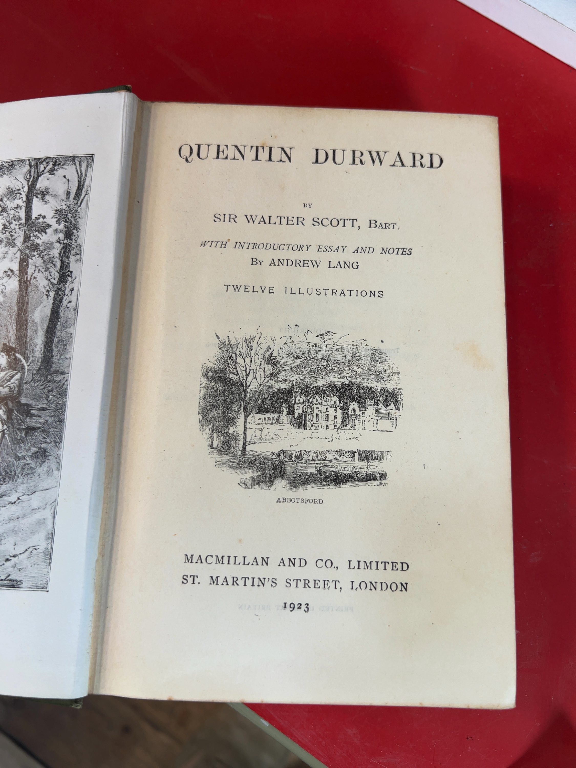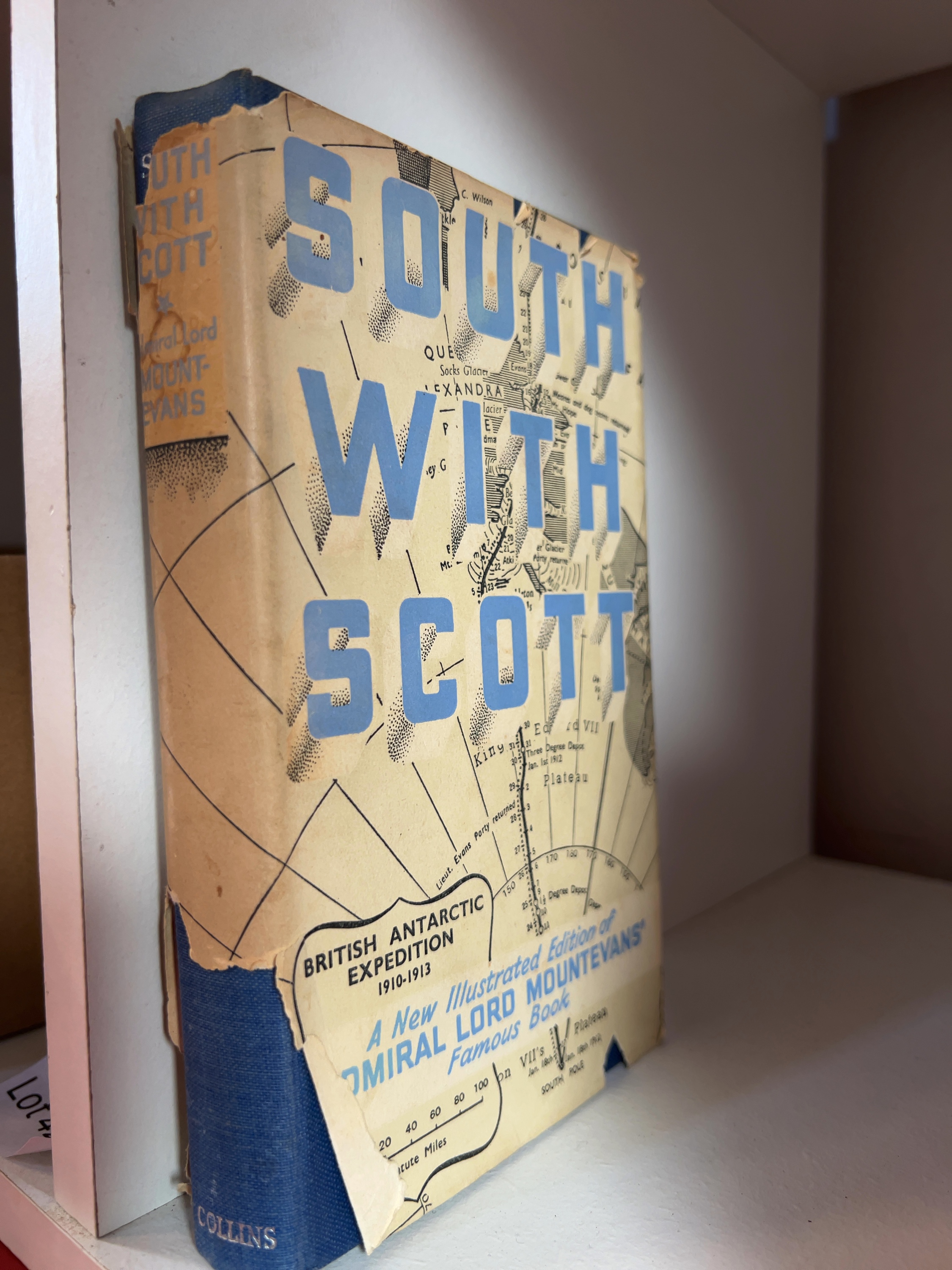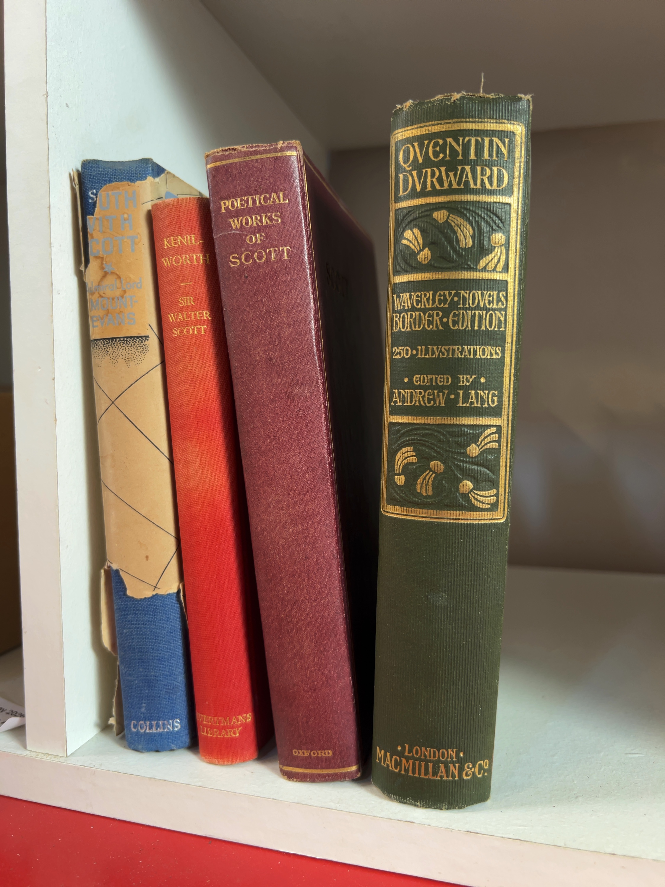 The dust jacket for South With Scott is in poor condition with substantial loss, particularly to the front panel and spine, and shows significant fragmentation and edge wear. The blue cloth binding displays minor shelf wear. The binding of Quentin Durward shows bumping to the spine ends and corners. There is visible foxing to the title page and preliminary pages of this volume. All books in the collection exhibit standard characteristics of age, including sunning to the spines, bumped extremities, and toning to the paper edges.