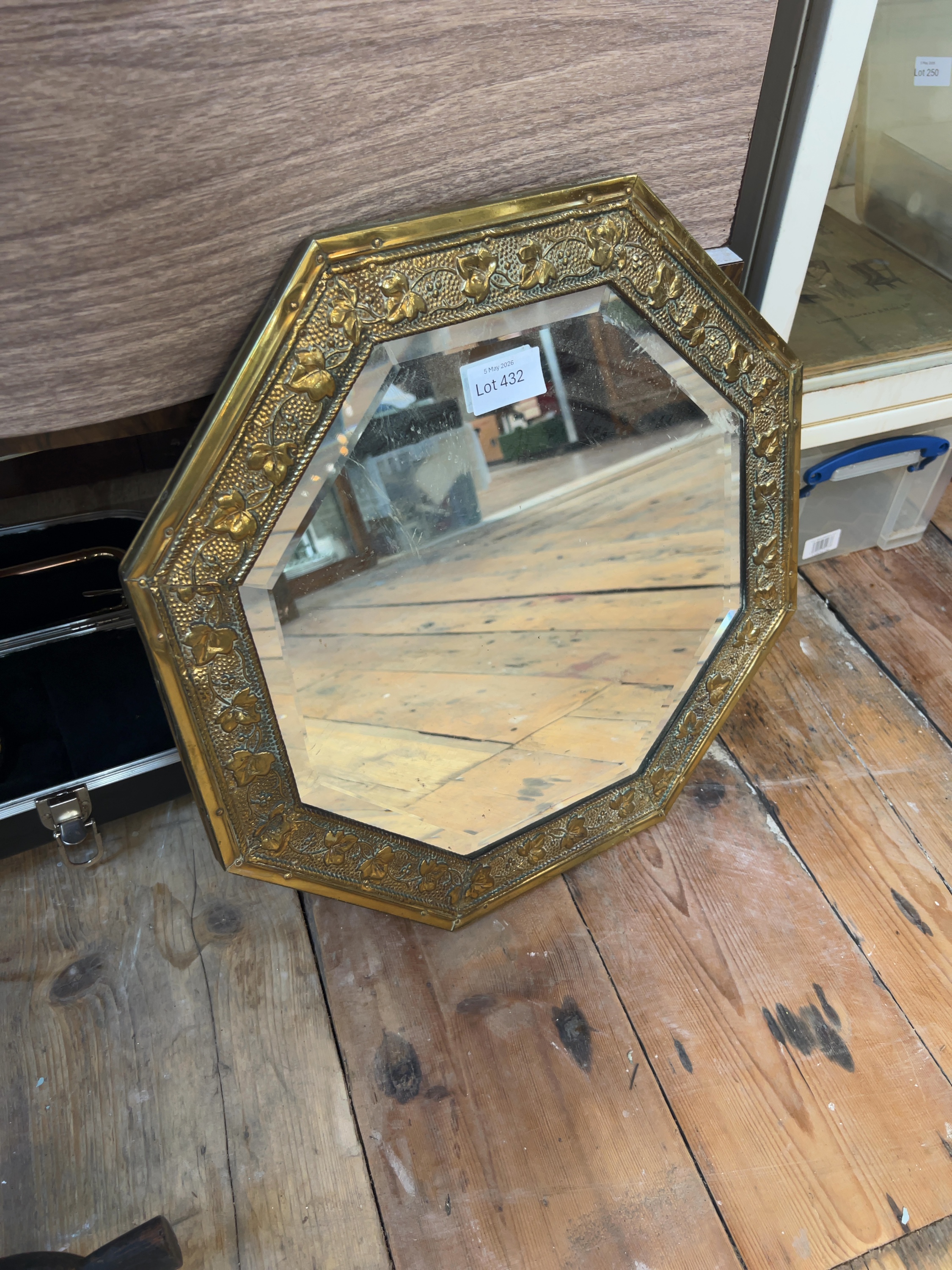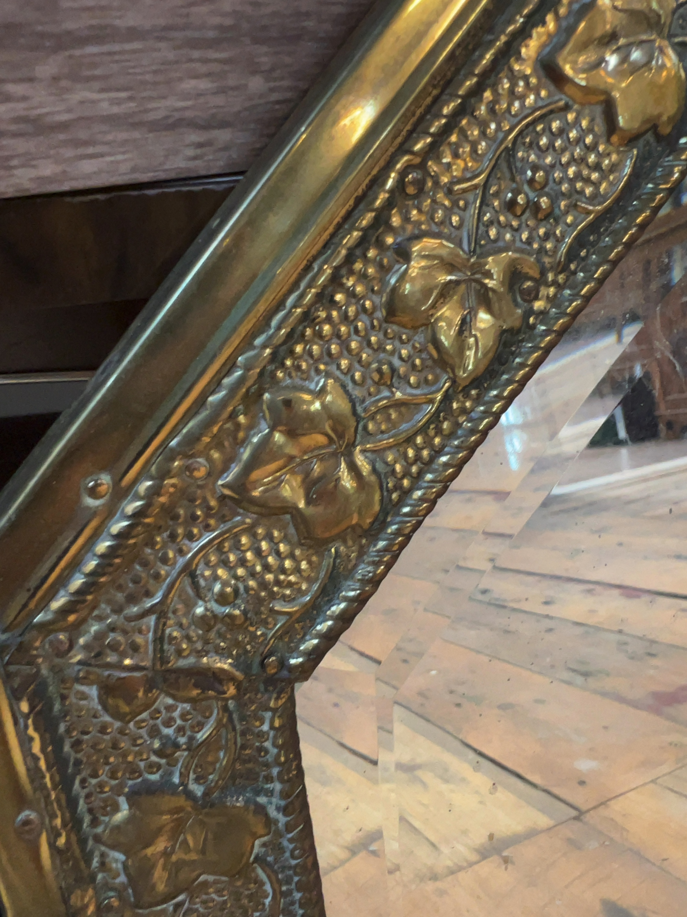 The brass frame exhibits a characteristic aged patina with visible surface tarnish and minor scuffs commensurate with its age. The bevelled mirror plate appears to be in good overall condition with no significant foxing or loss to the silvering, although the glass surface is currently dusty and requires cleaning. The wooden backing and hanging hardware remain intact.