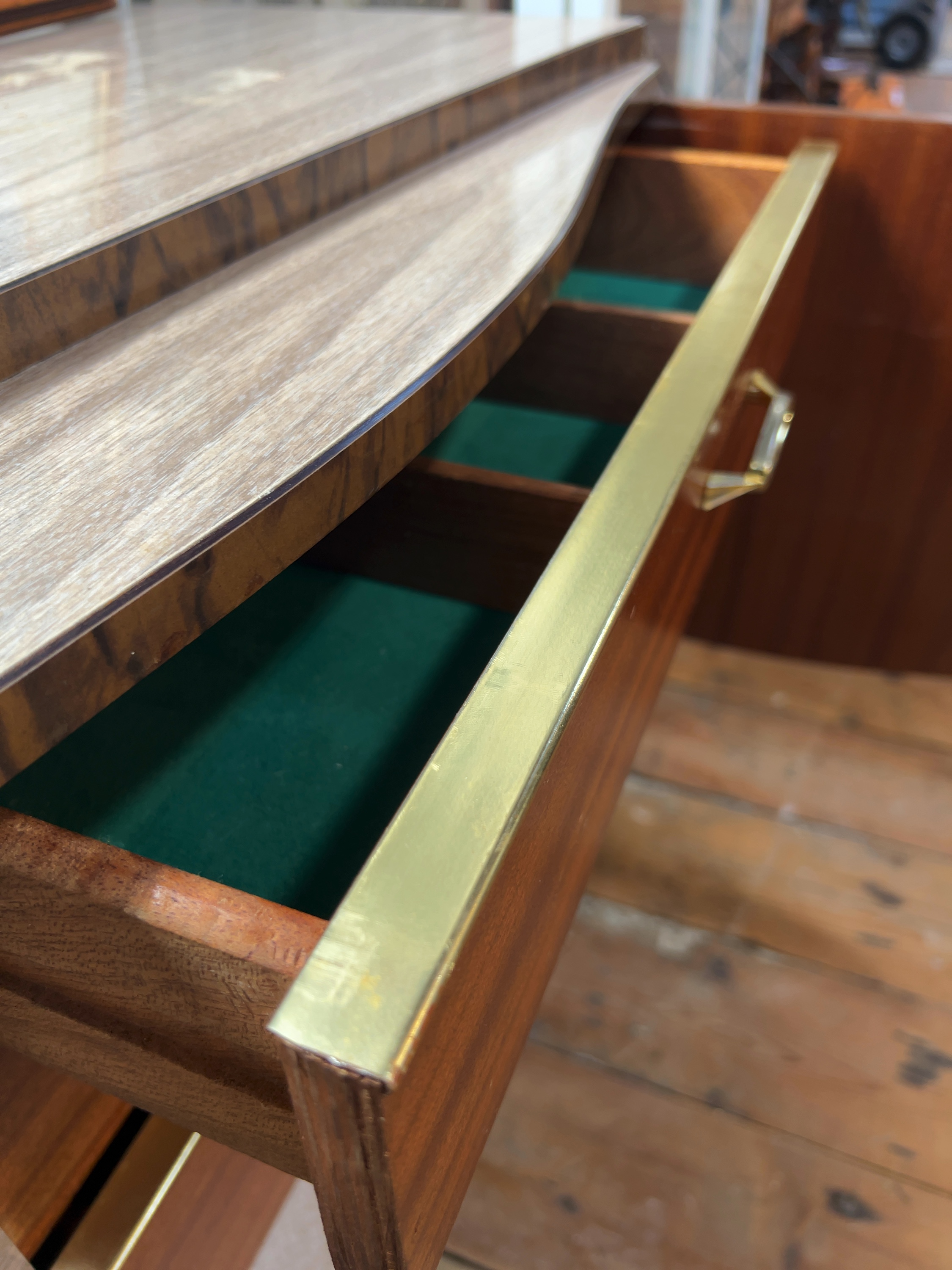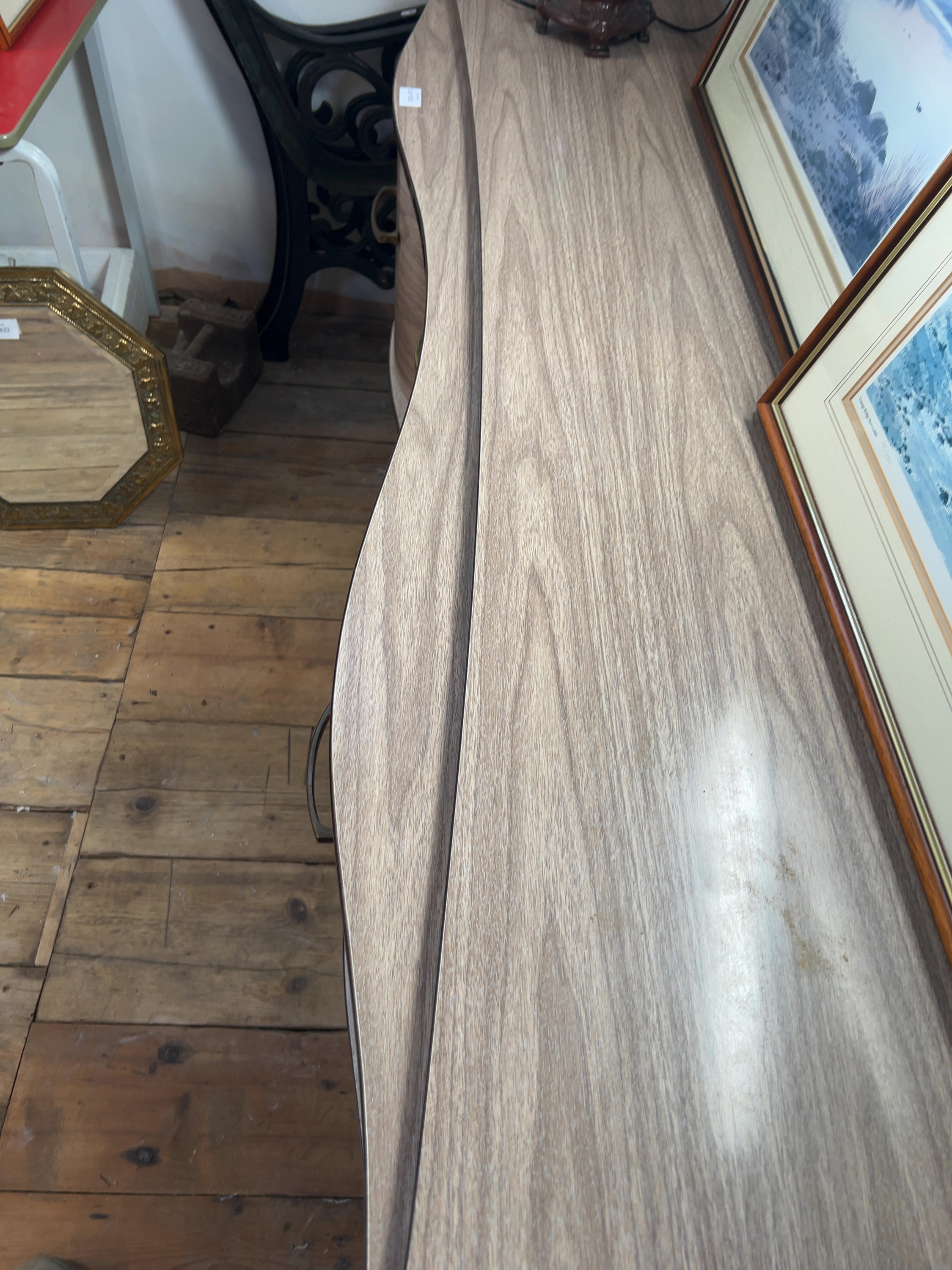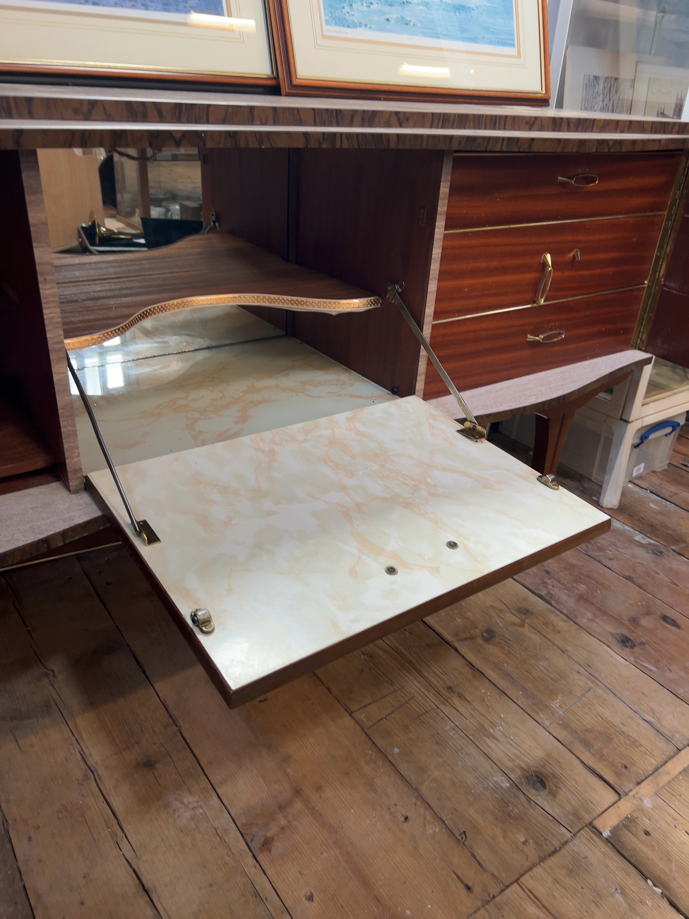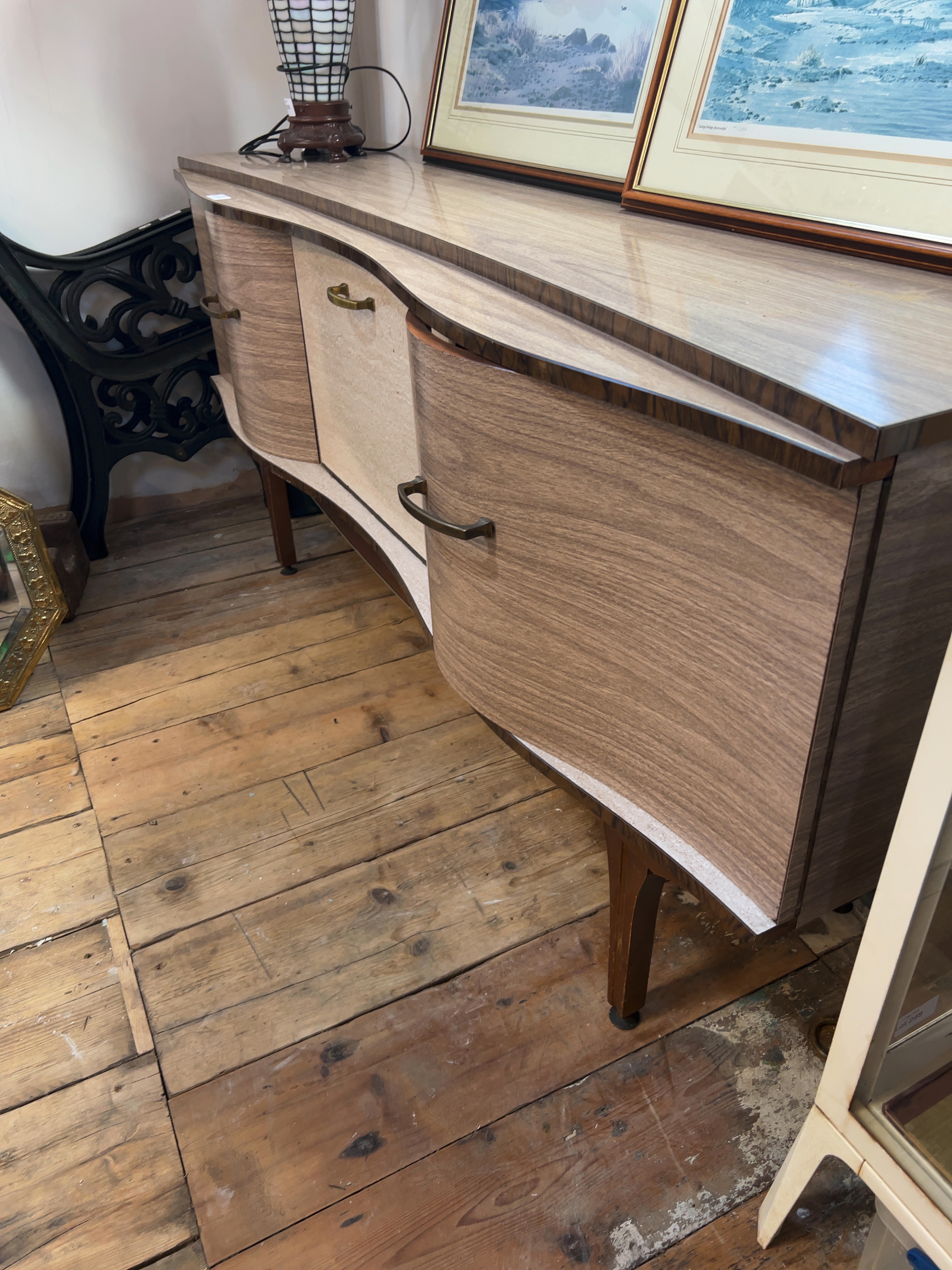 A mid-century modern cocktail sideboard dating from the circa 1950s-1960s, featuring a distinctive contoured butterfly or bow-front design. in the style of mid-century British manufacturers such as Beautility or Nathan.
