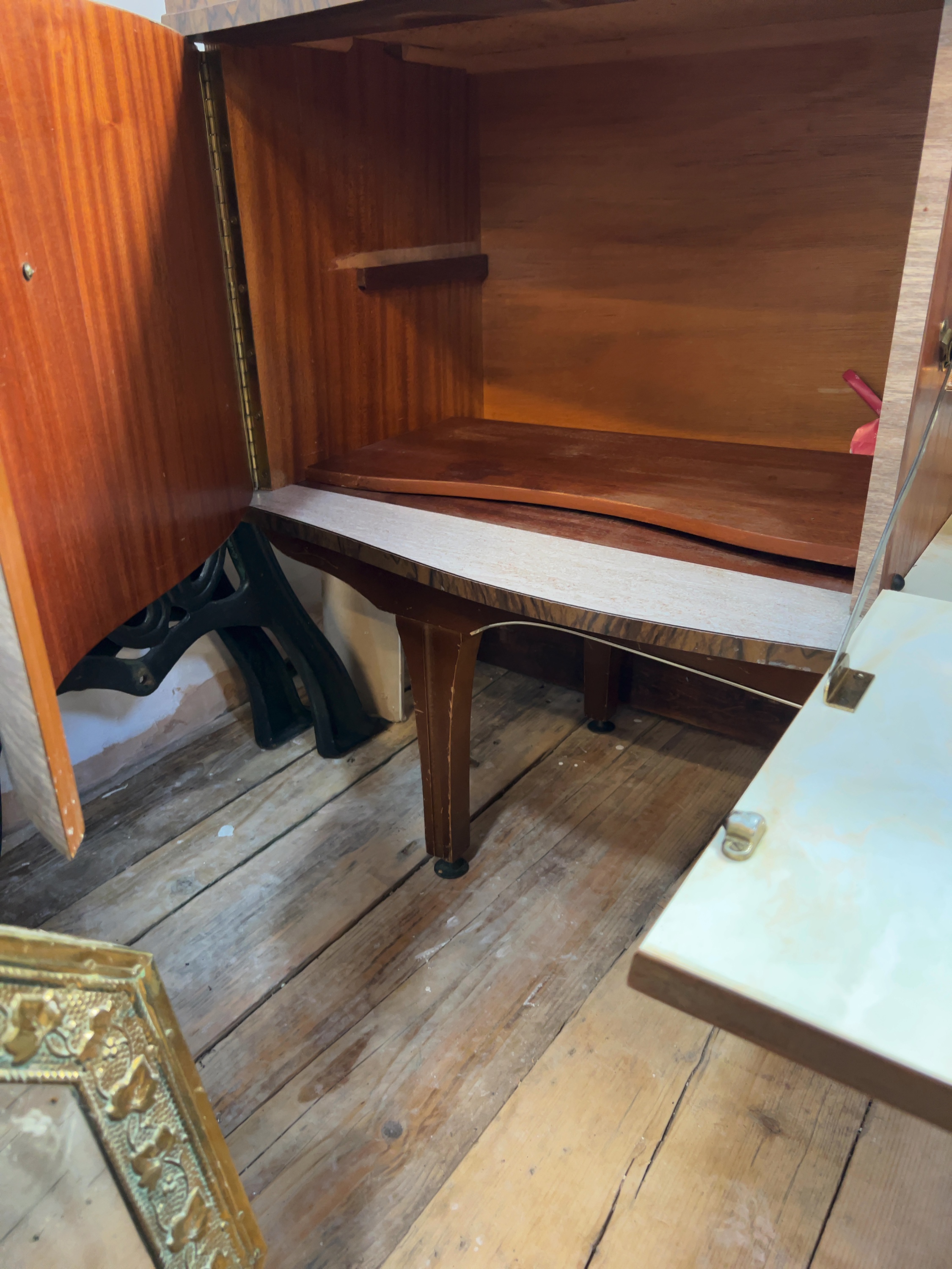 The item is in fair to good vintage condition. The top veneered surface shows visible stains and circular marks. One internal wooden shelf is currently dislodged and sagging. There is light scuffing and finish loss consistent with age and use, particularly to the tapered legs. The metal feet caps show signs of oxidation.