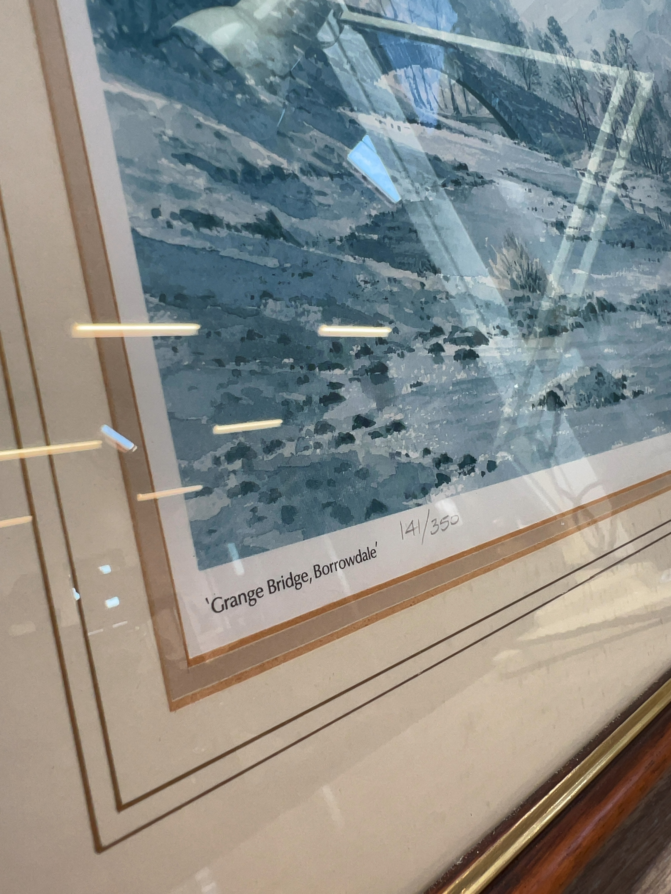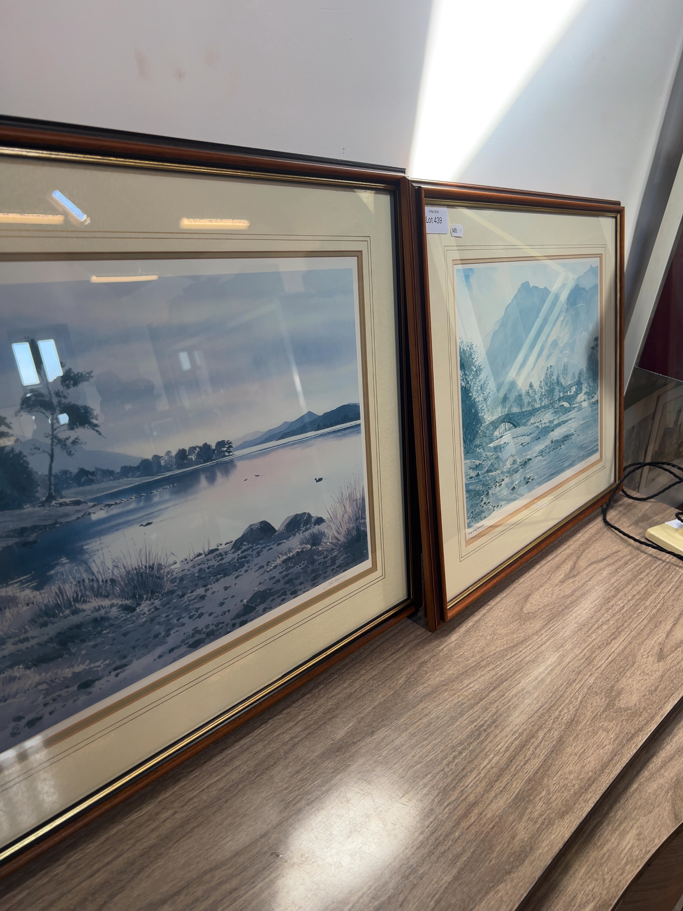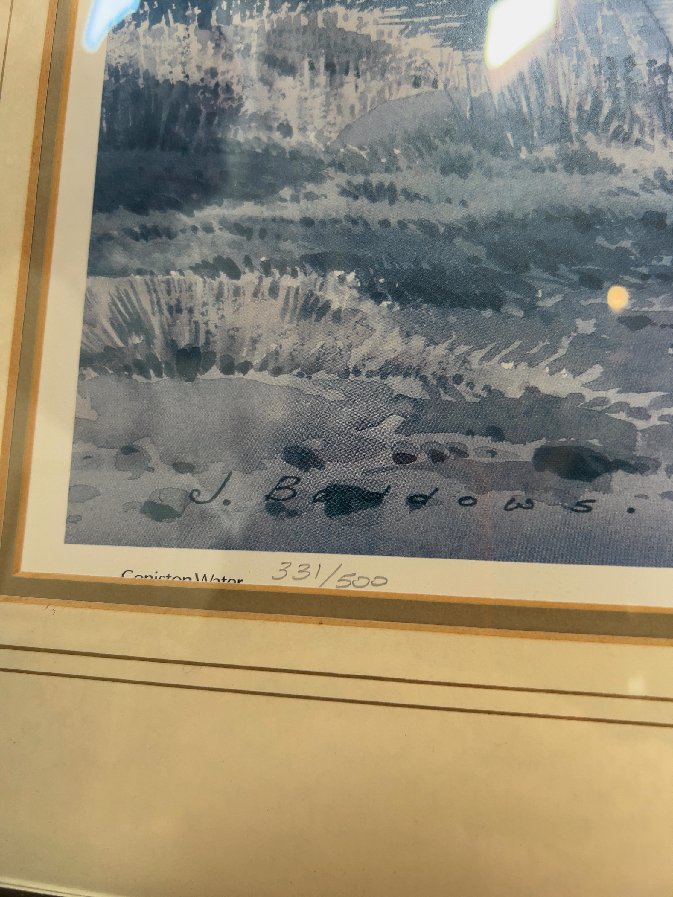 A pair of limited edition landscape prints after original watercolours by J. Baddows, depicting iconic locations in the English Lake District titled Coniston Water and numbered 331/500 in the lower margin. The second is titled Grange Bridge, Borrowdale and is numbered 141/350.