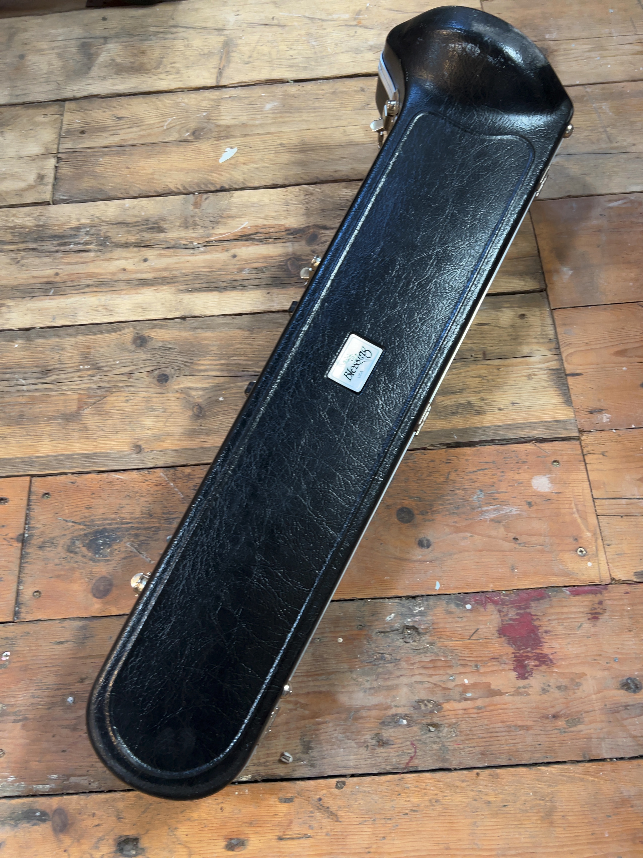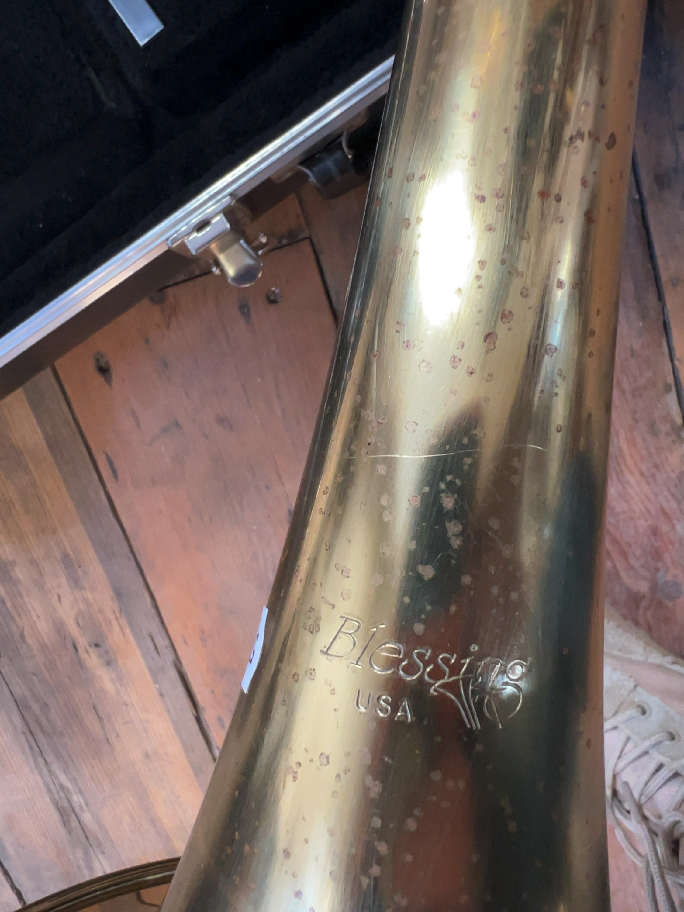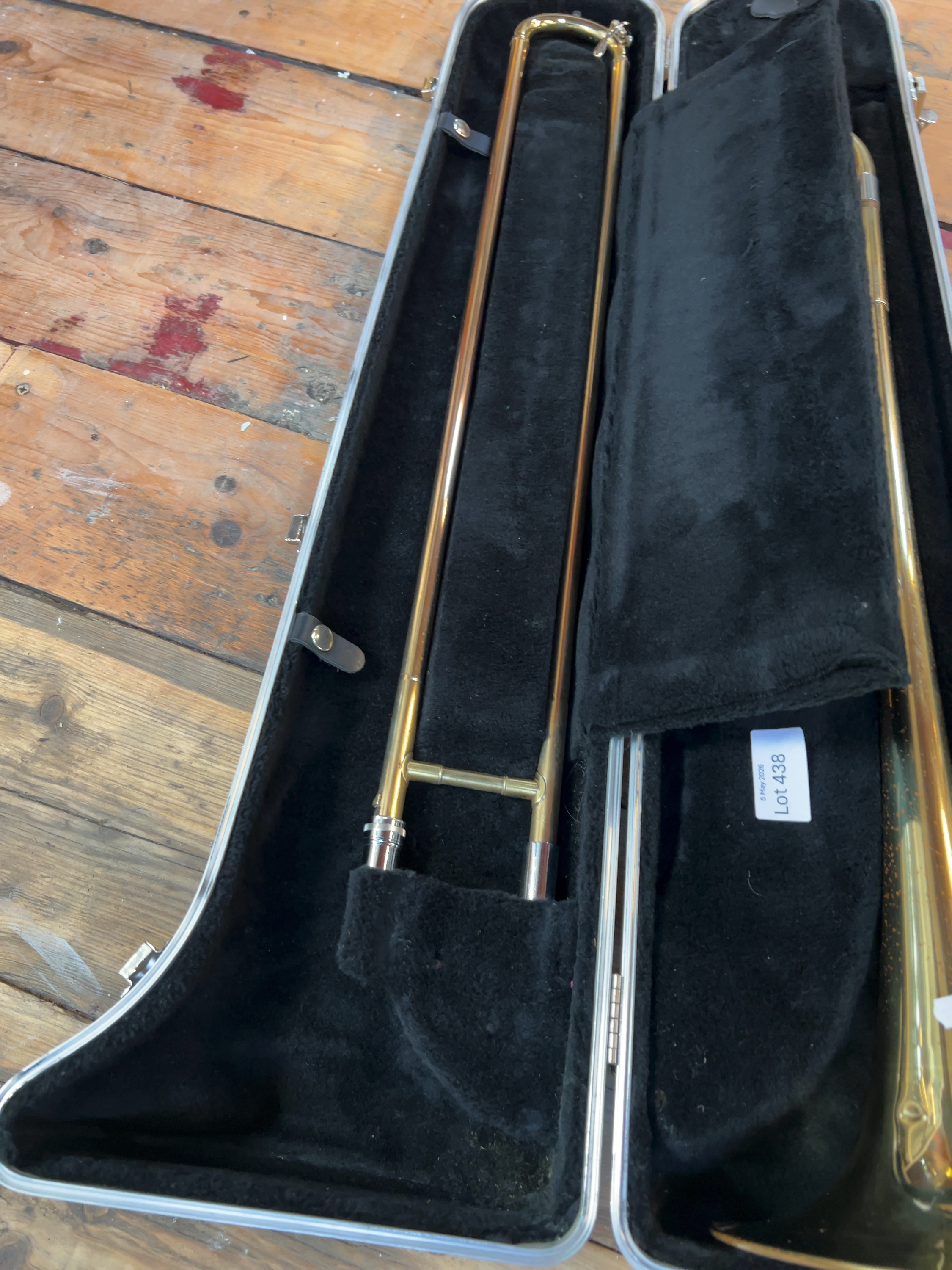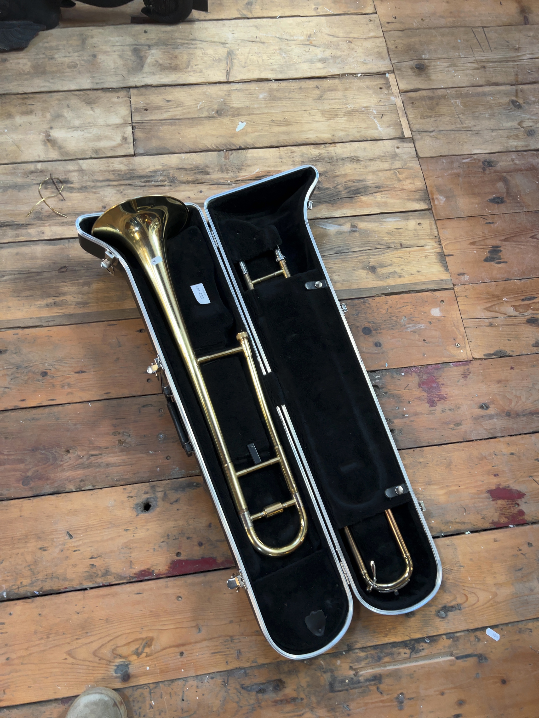 A tenor trombone manufactured by Blessing, USA. housed in its original black hard-shell case.