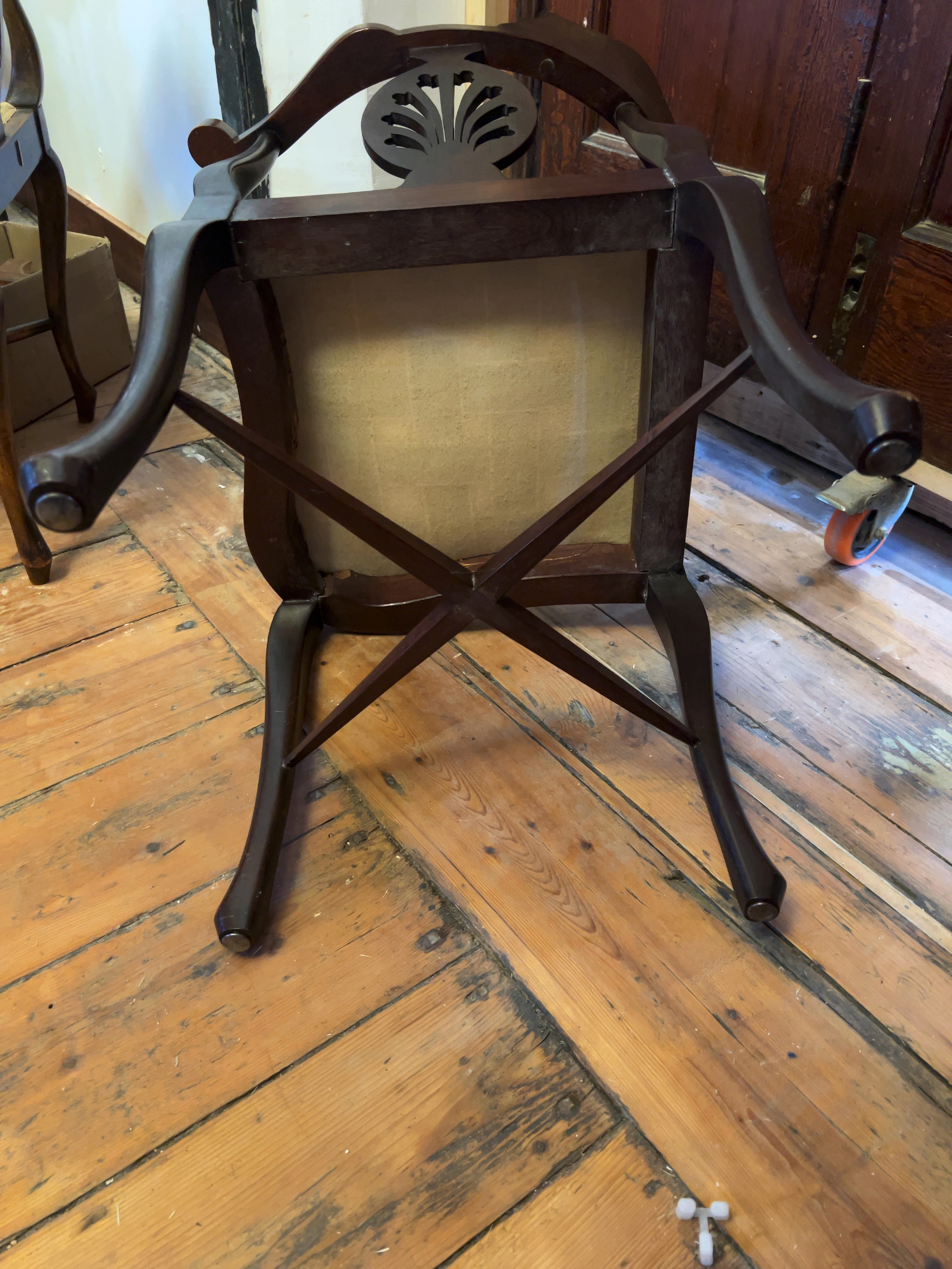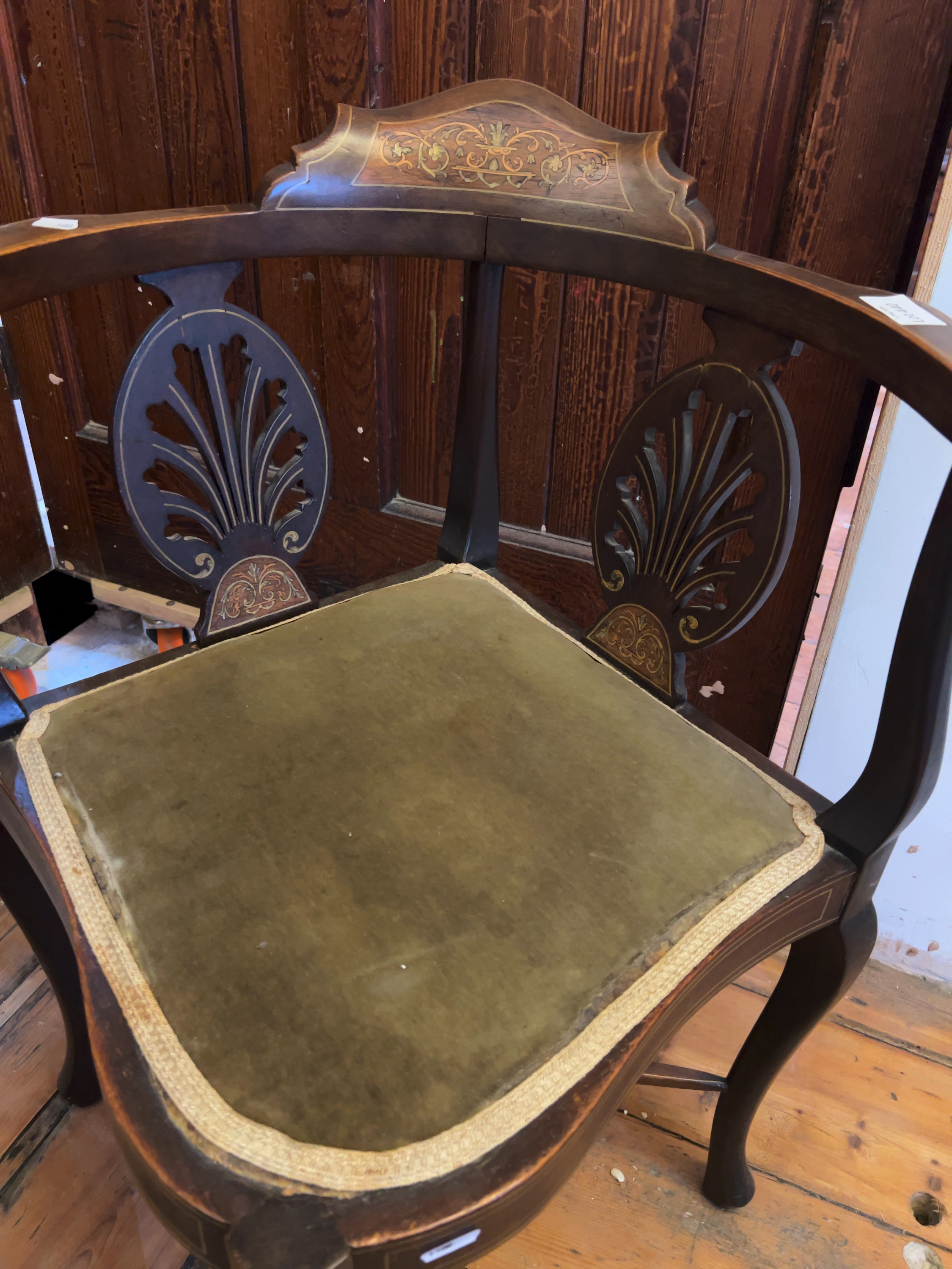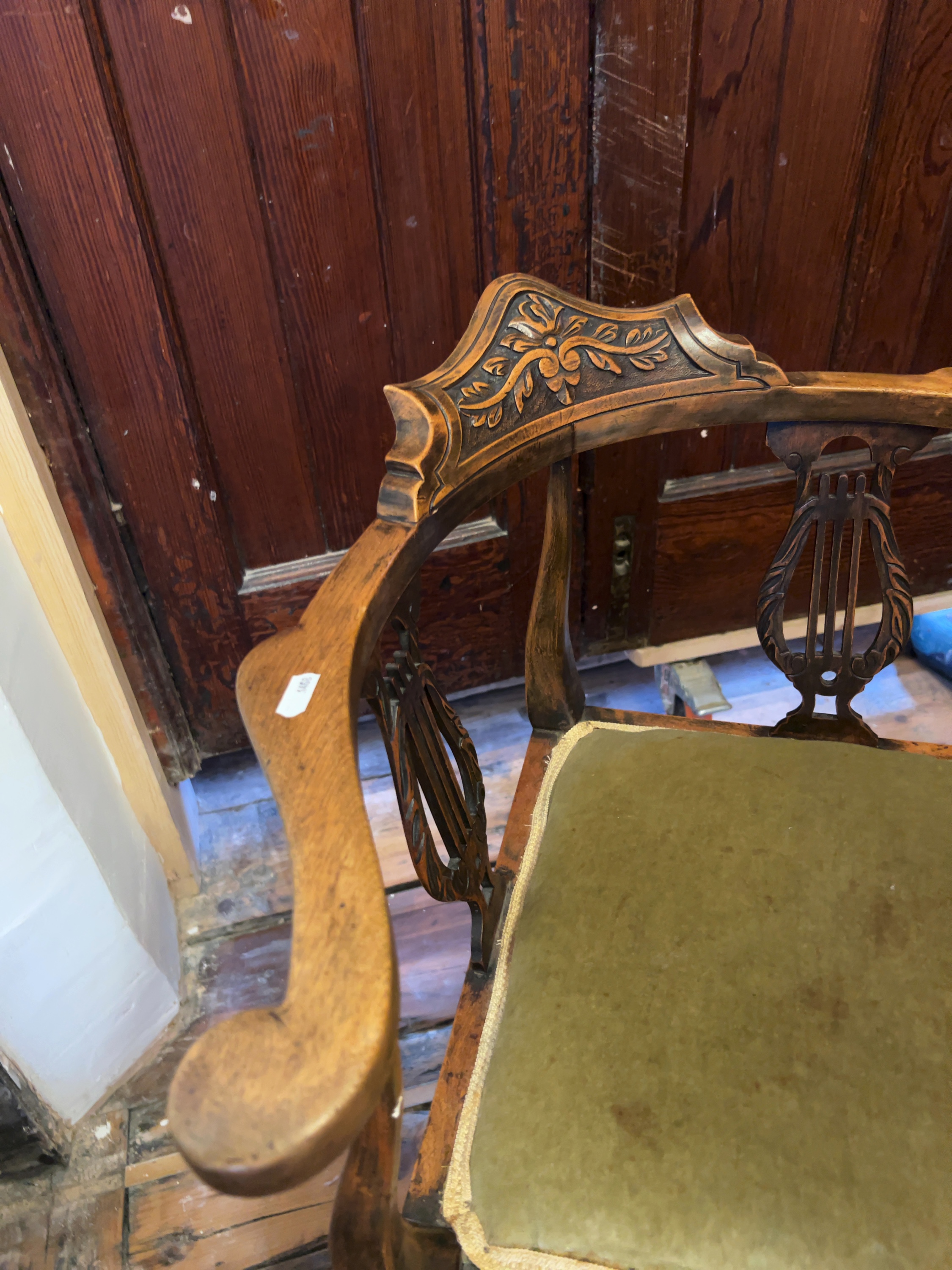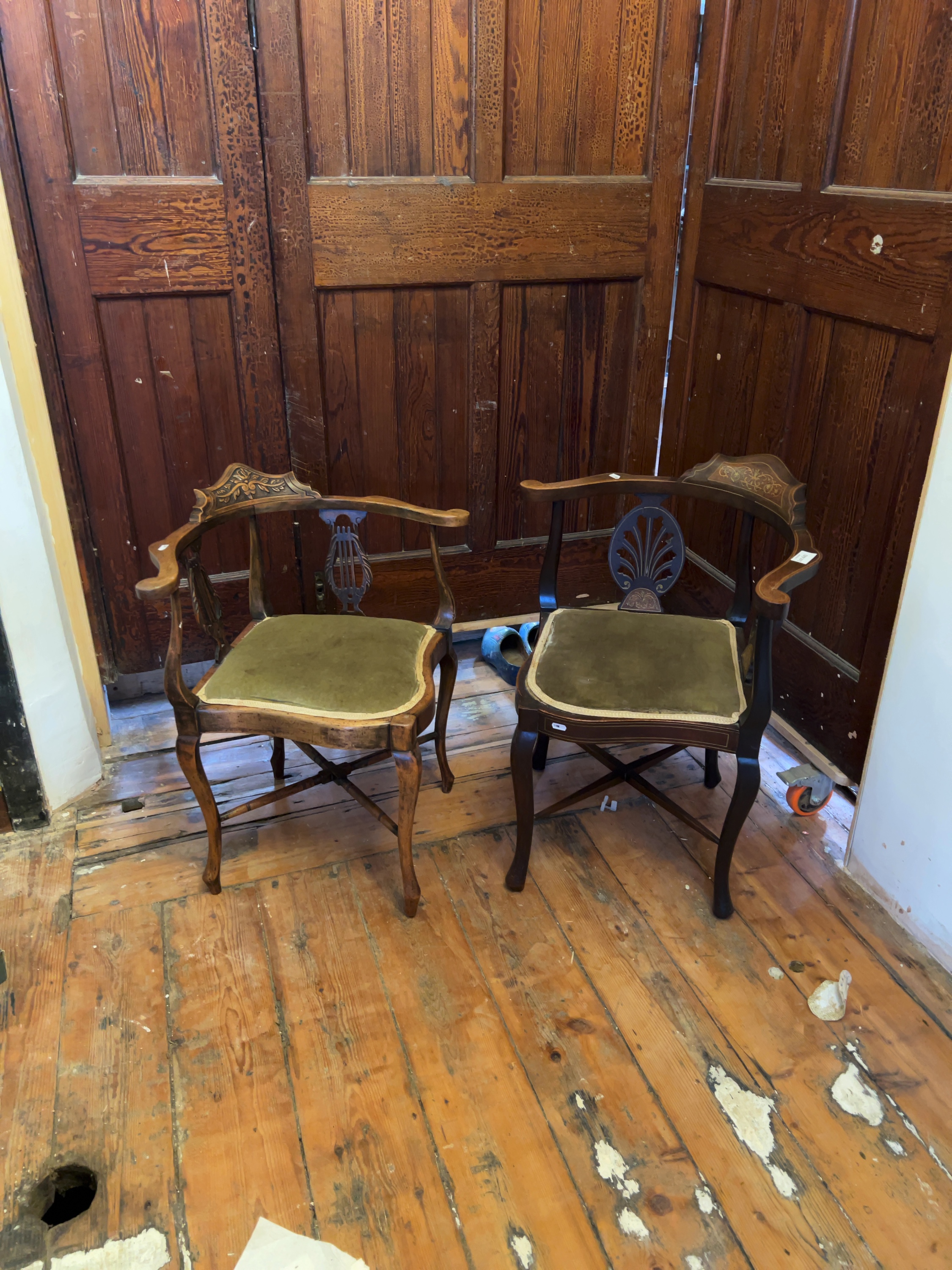A pair of non-matching Edwardian mahogany corner or roundabout chairs, dating to the late 19th or early 20th century designed in the Sheraton Revival style, featuring curved armrests with raised central cresting rails.