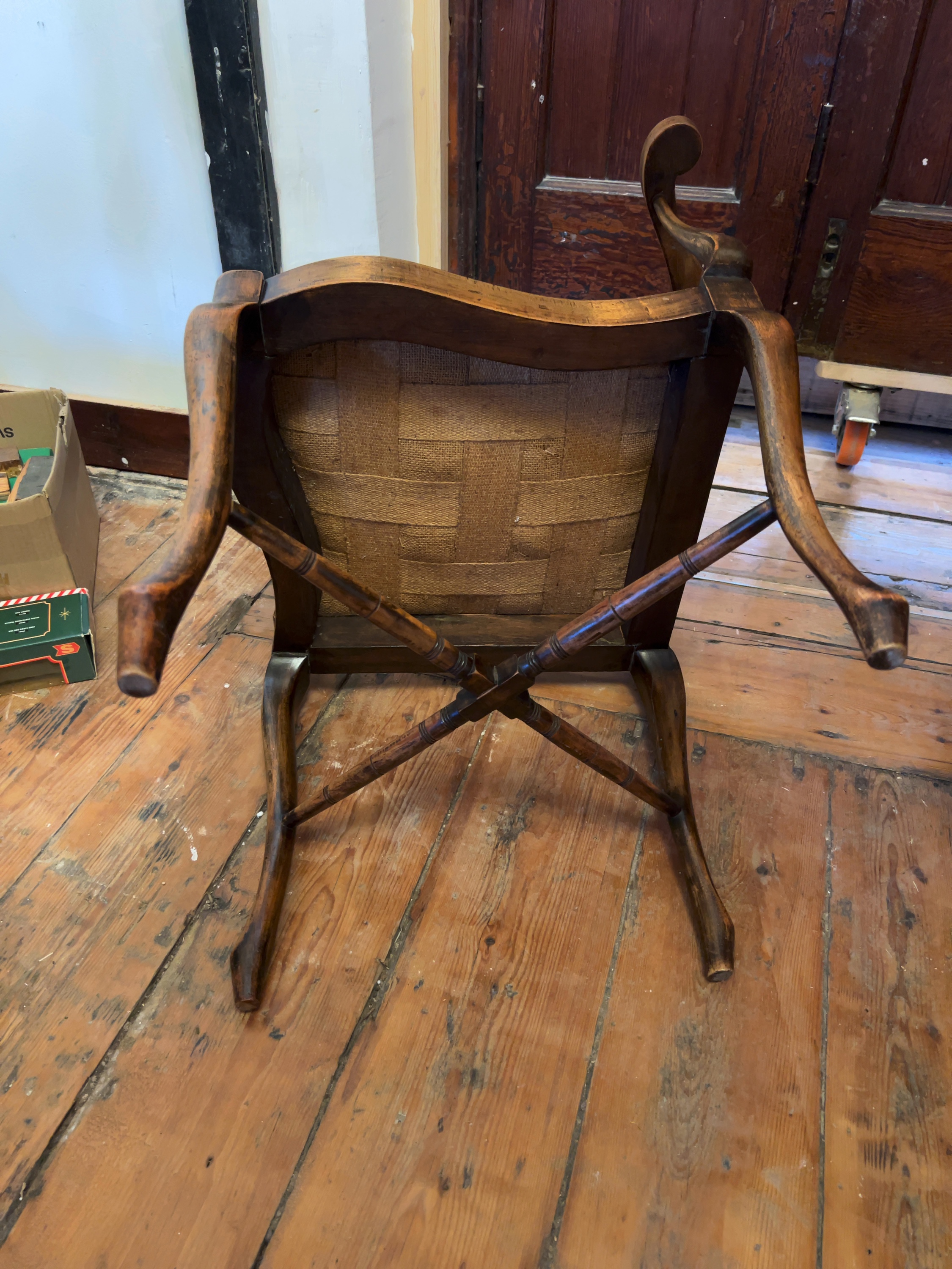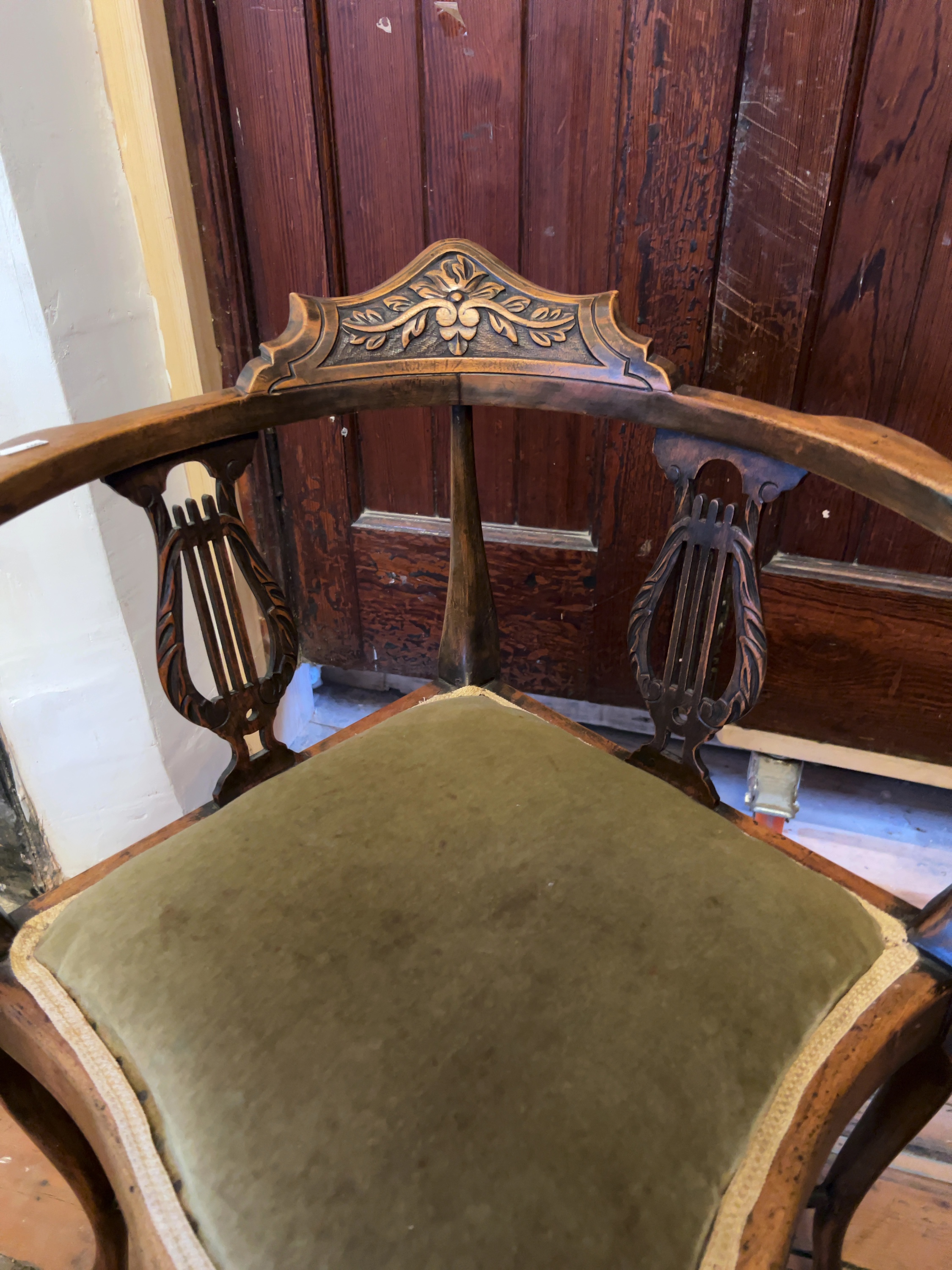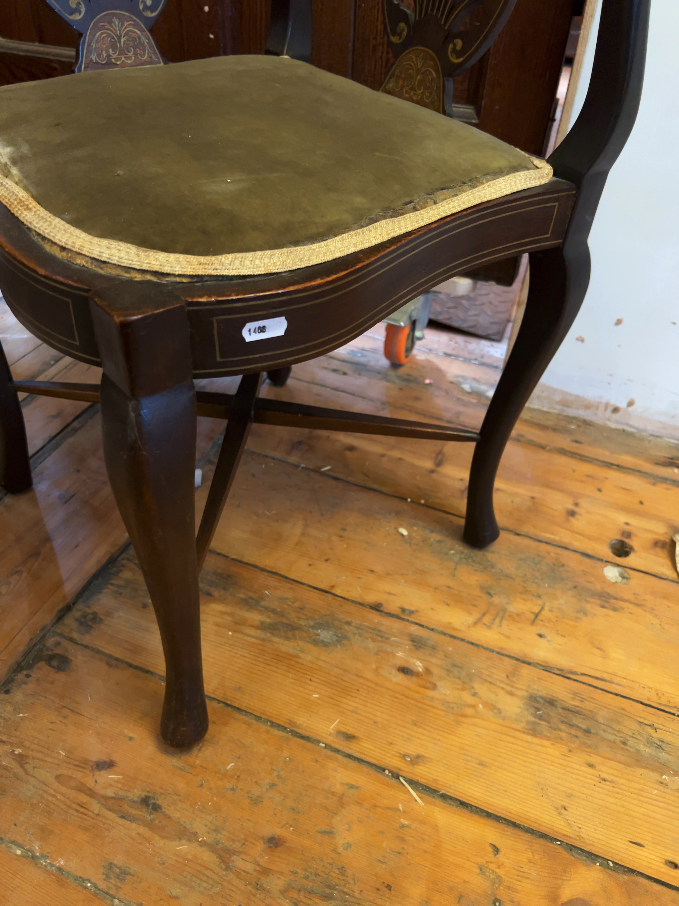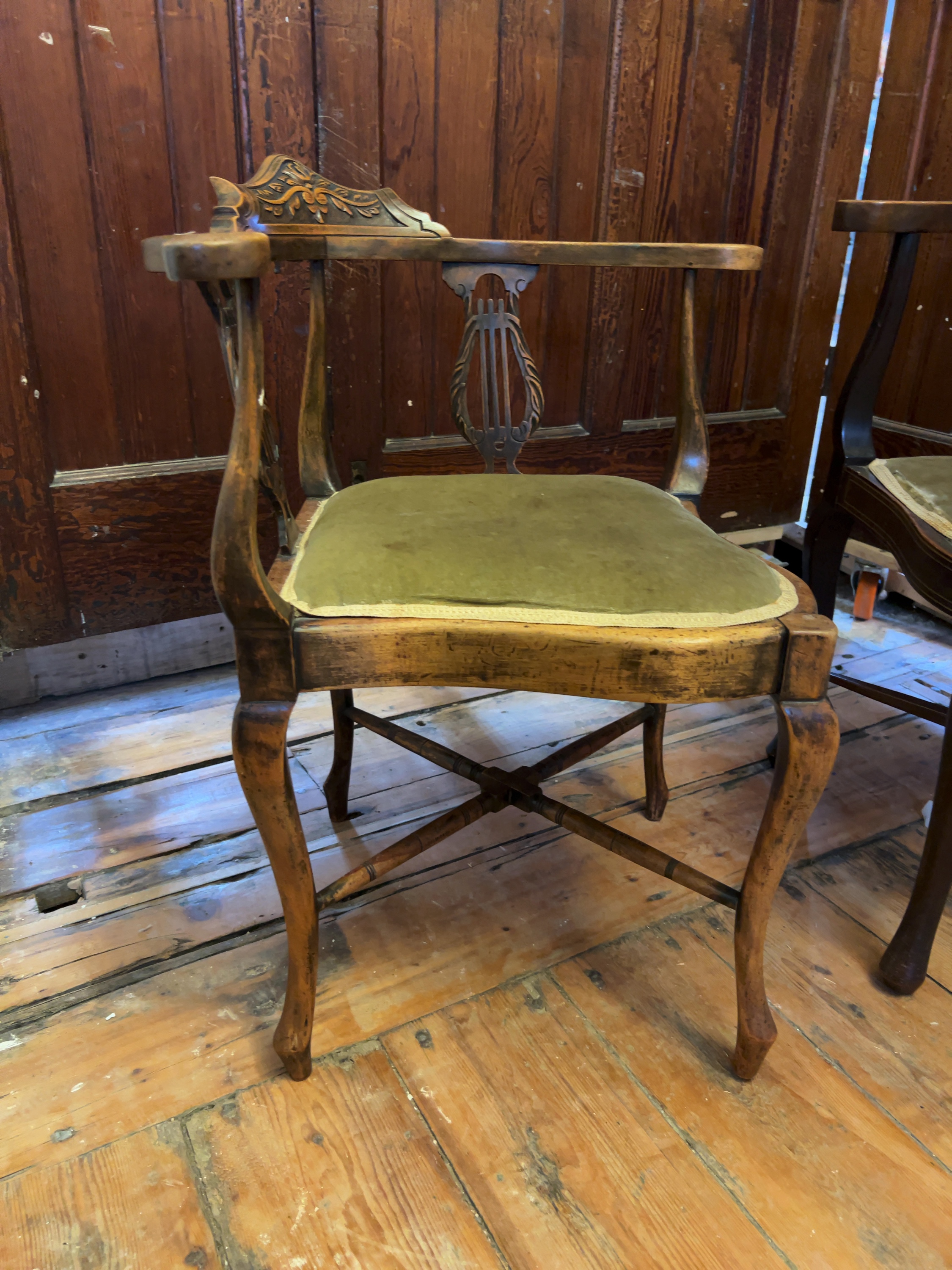 Both chairs are in used, worn condition and require restoration. The lighter-finished chair exhibits significant wear and loss to the original polish and surface finish throughout the frame. The darker chair has a more consistent finish but shows minor scuffs and scratches commensurate with age. The green velvet upholstery on both seats is heavily worn, faded, and marked, with frayed edges to the piping. The webbing on the underside of the lighter chair is aged and requires replacement. The frames appear structurally sound.