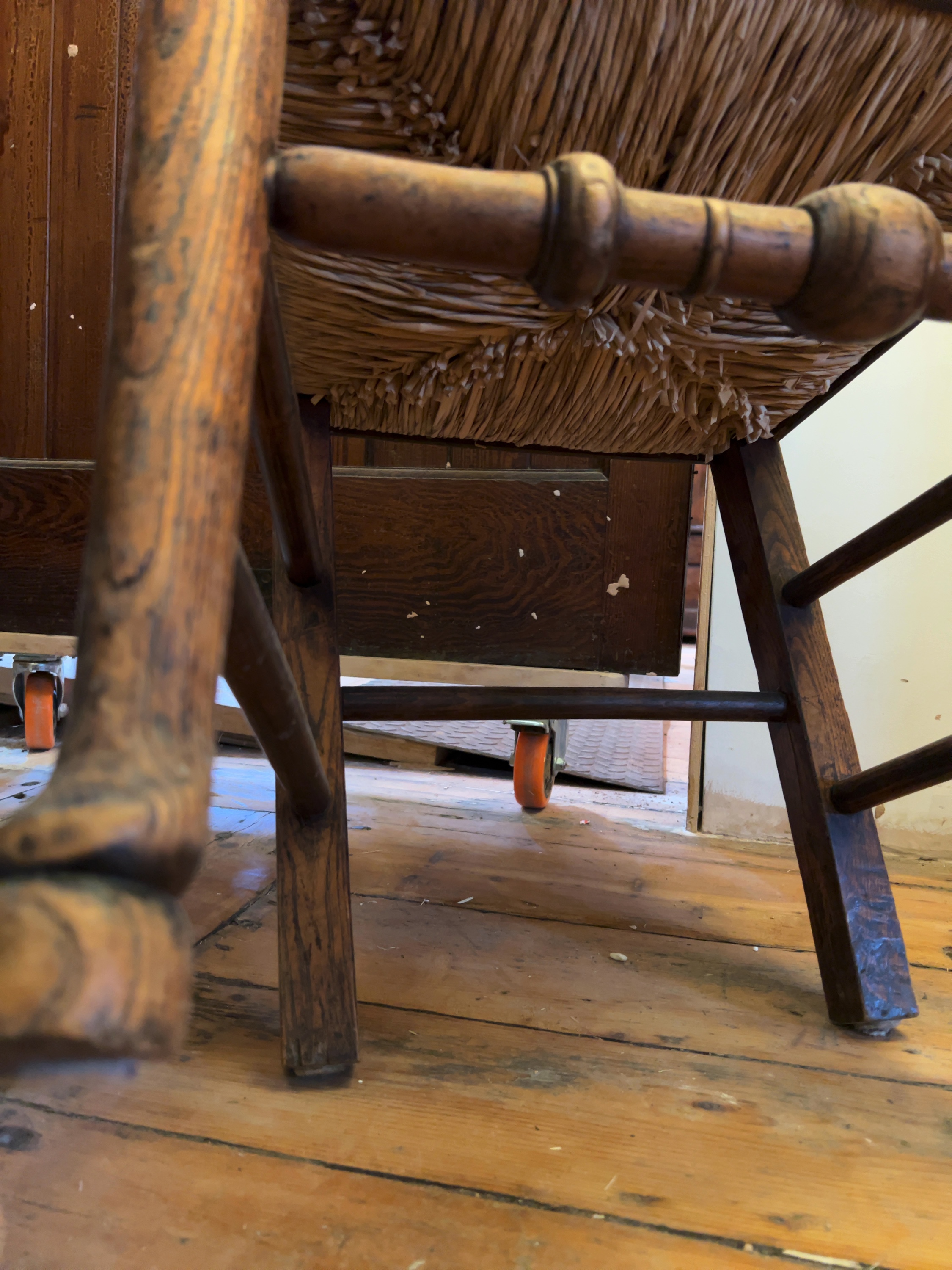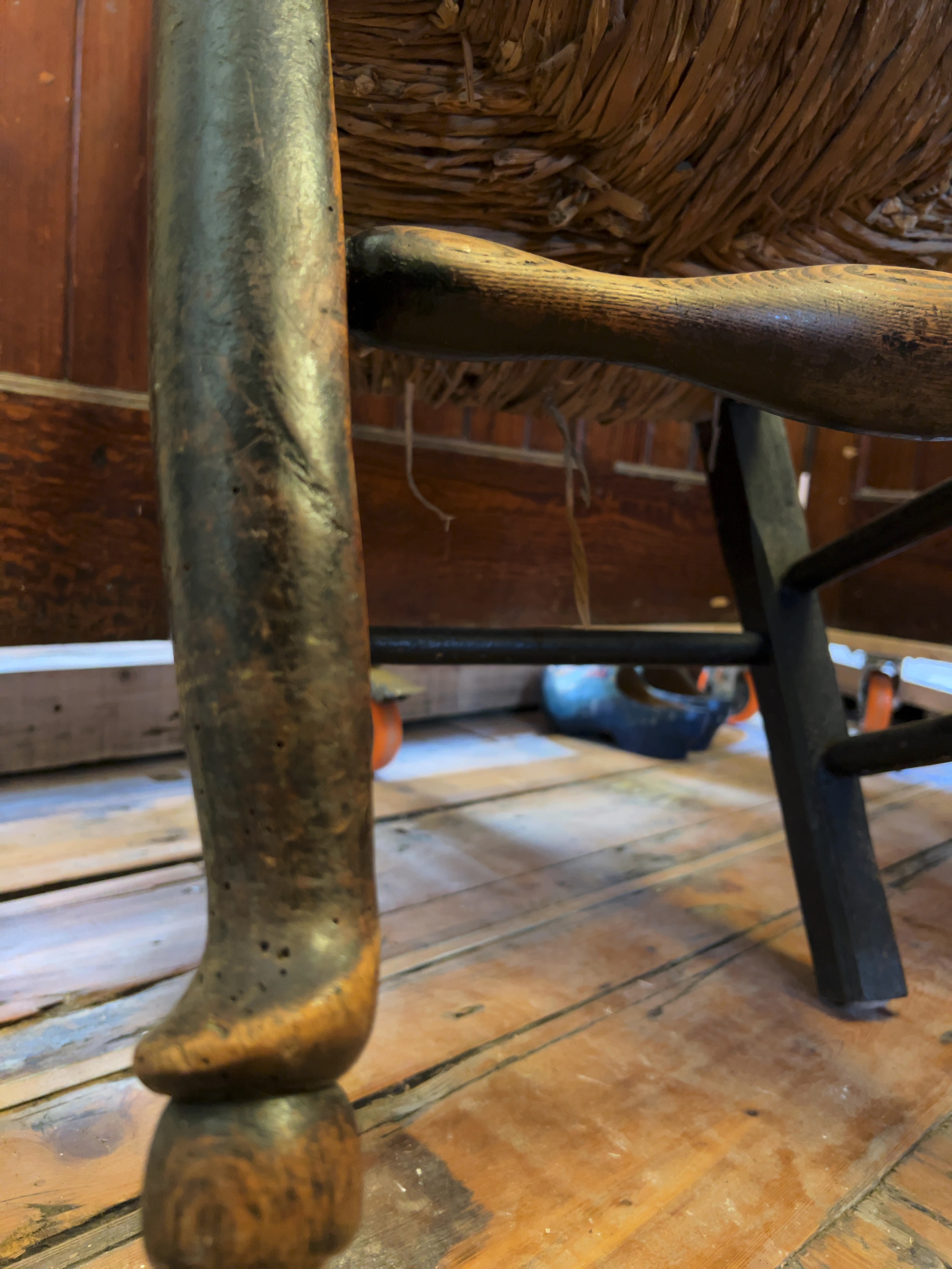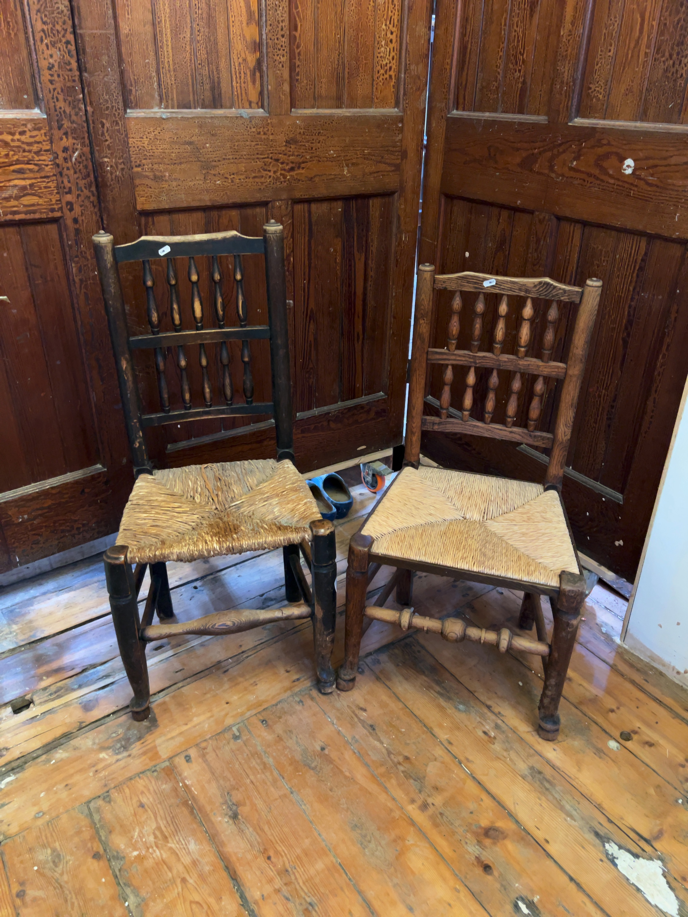 Both chairs exhibit significant wear consistent with age and domestic use. The rush seat of the dark-stained chair is heavily damaged and broken through the centre, requiring replacement. The oak chair\'s seat shows overall wear and discolouration. There is prominent loss to the surface finish on both frames, particularly on the rails, stretchers, and feet. Multiple small holes from historical woodworm infestation are visible throughout the legs and stretchers.