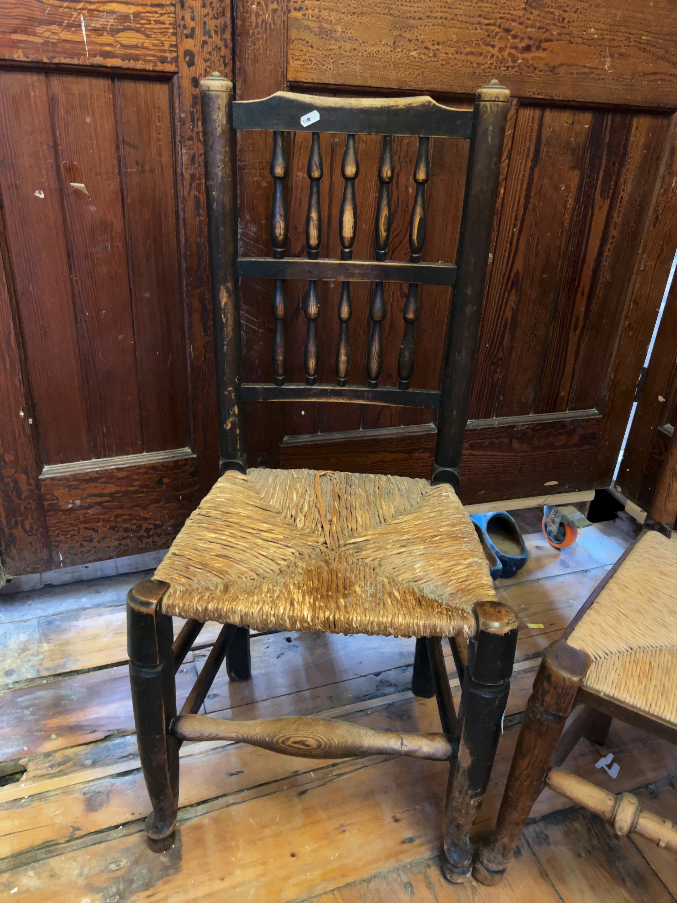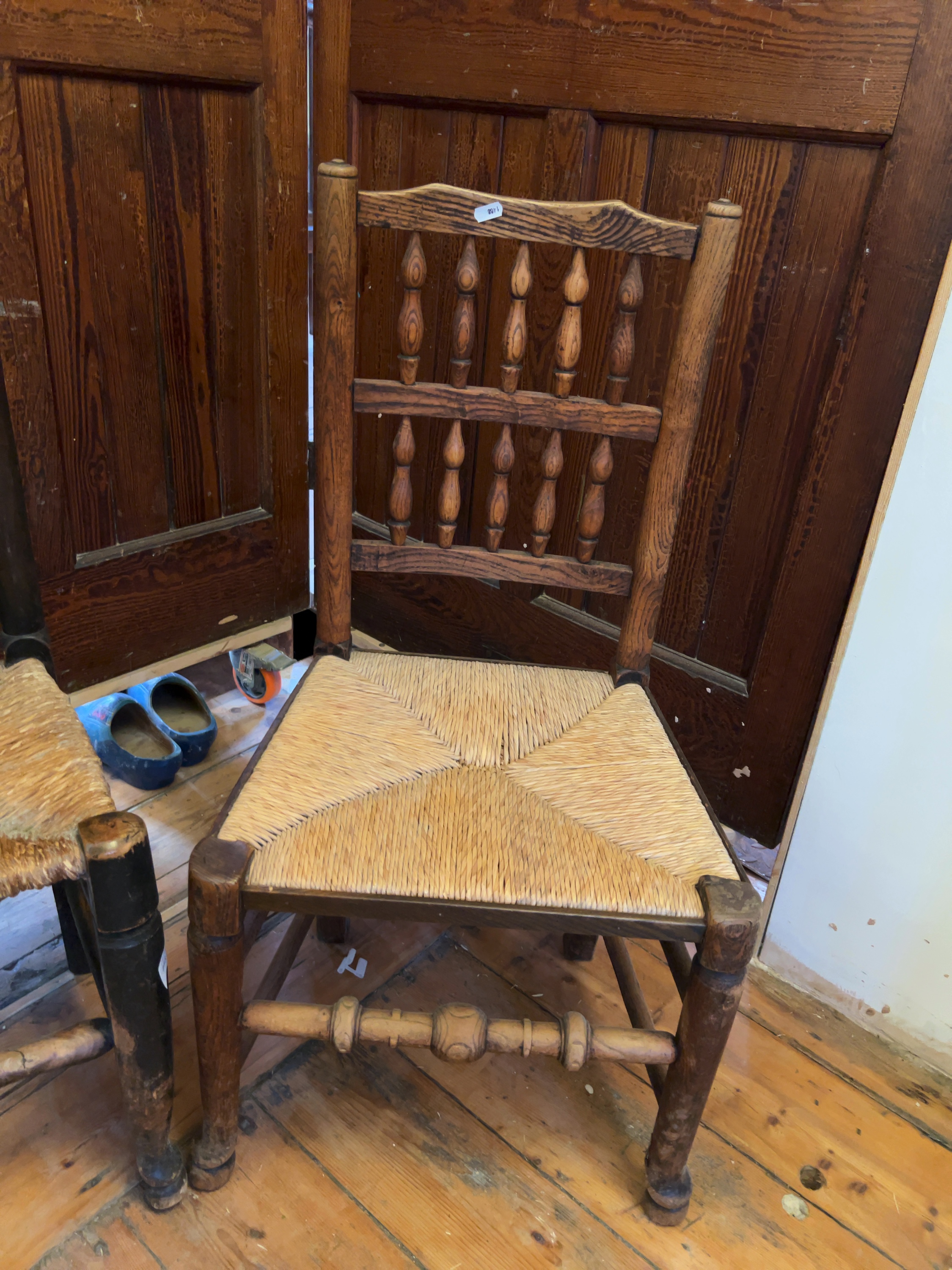 A near-pair of late 19th or early 20th-century side chairs in the English vernacular style, specifically identified as Lancashire spindle-backs. No maker’s marks or stamps are visible on either piece.