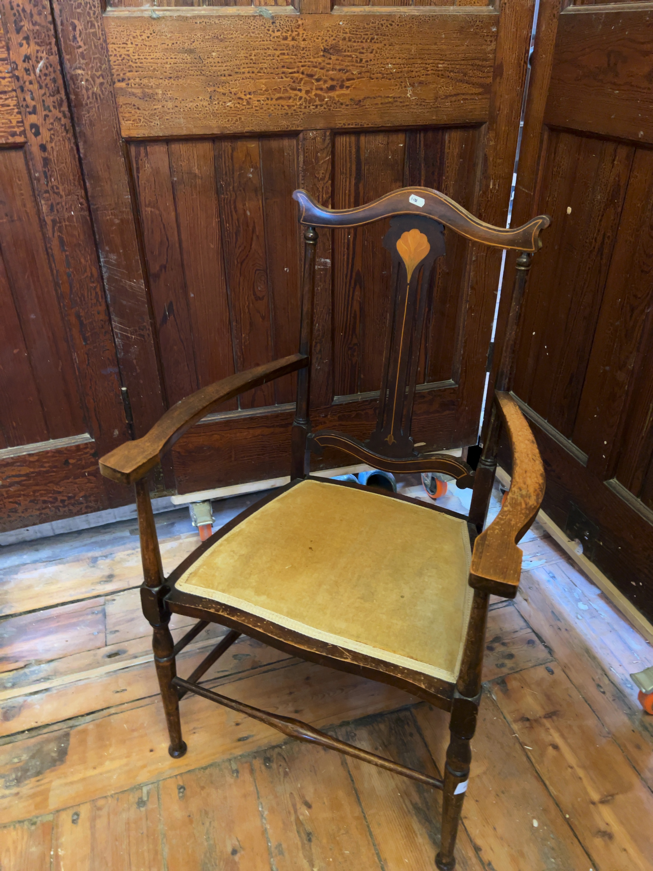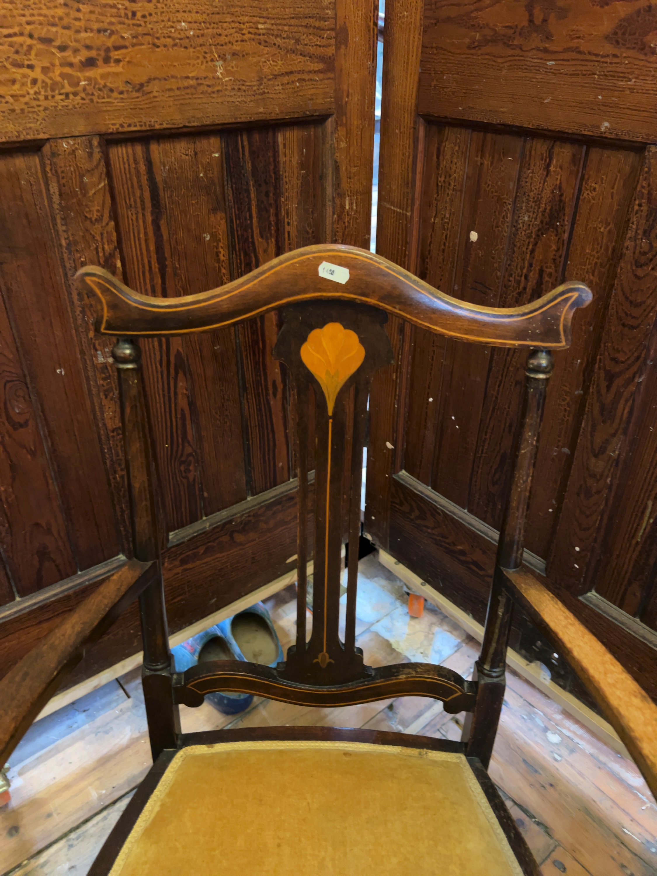An Edwardian mahogany armchair featuring Art Nouveau design influences, constructed with a mahogany frame accented by satinwood stringing and marquetry.