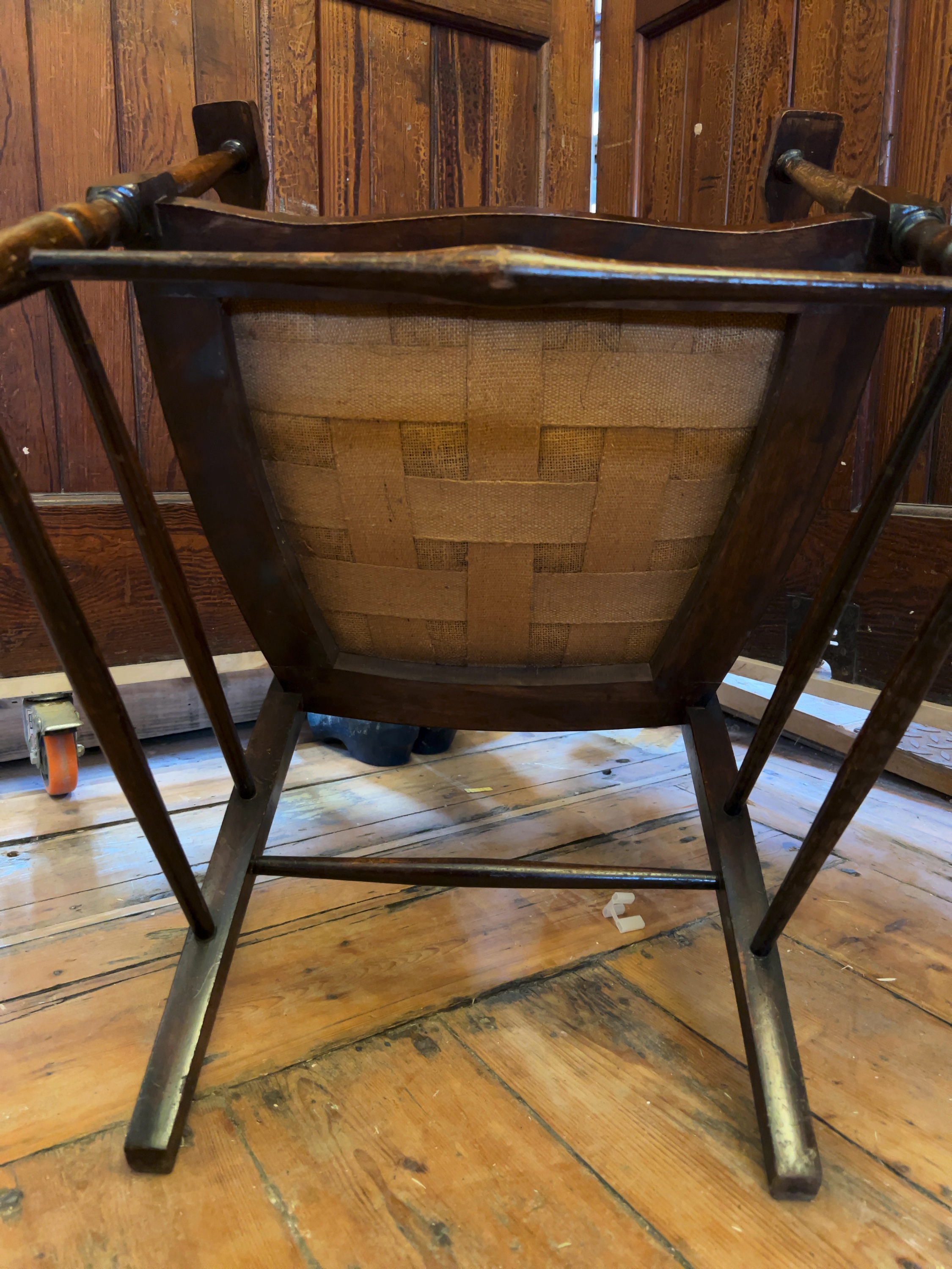 The chair is in a well-used condition consistent with its age. There is significant wear to the original finish, particularly on the upper surfaces of the arms where the polish has worn through to the base wood. The frame exhibits various scuffs, small indentations, and scratches throughout, notably on the legs. The velvet upholstery shows surface wear and ageing but remains intact. The structure remains sound, although the jute webbing on the underside shows signs of age.
