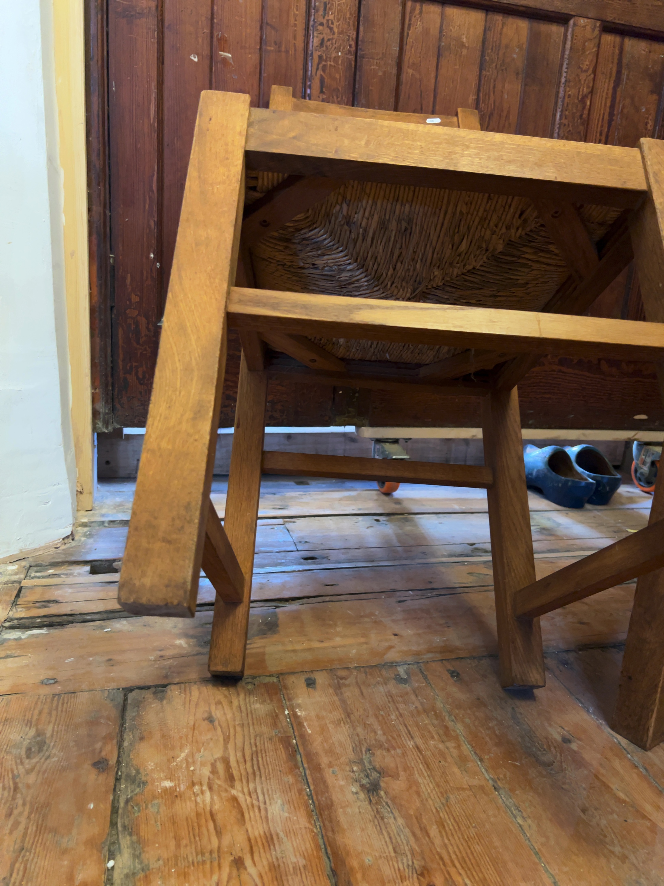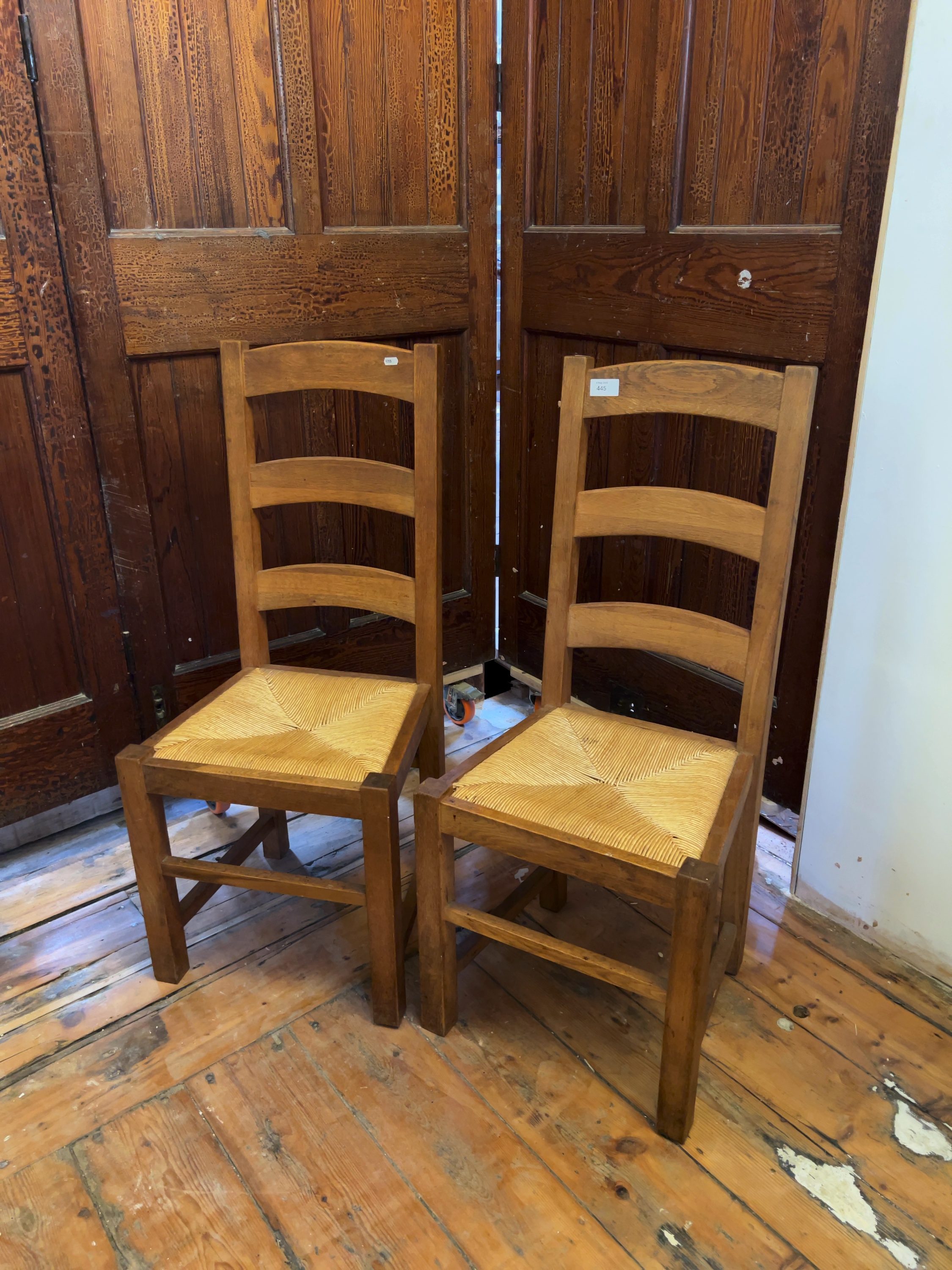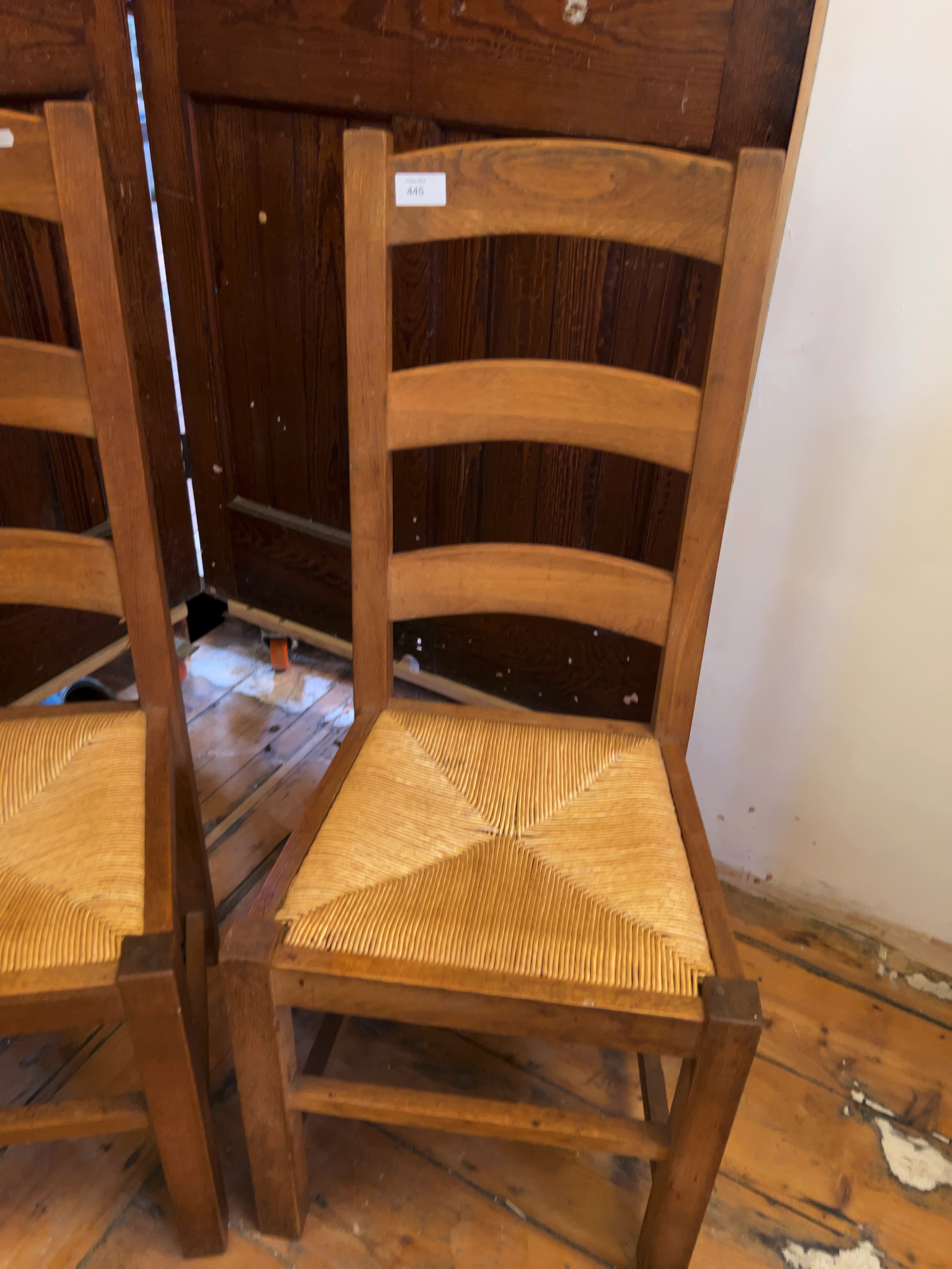 The chairs are in good, sturdy condition. There are minor surface scuffs and light wear to the finish on the legs and stretchers, consistent with age and domestic use. The rush seats appear well-maintained and are tight with no significant fraying or breakage visible.