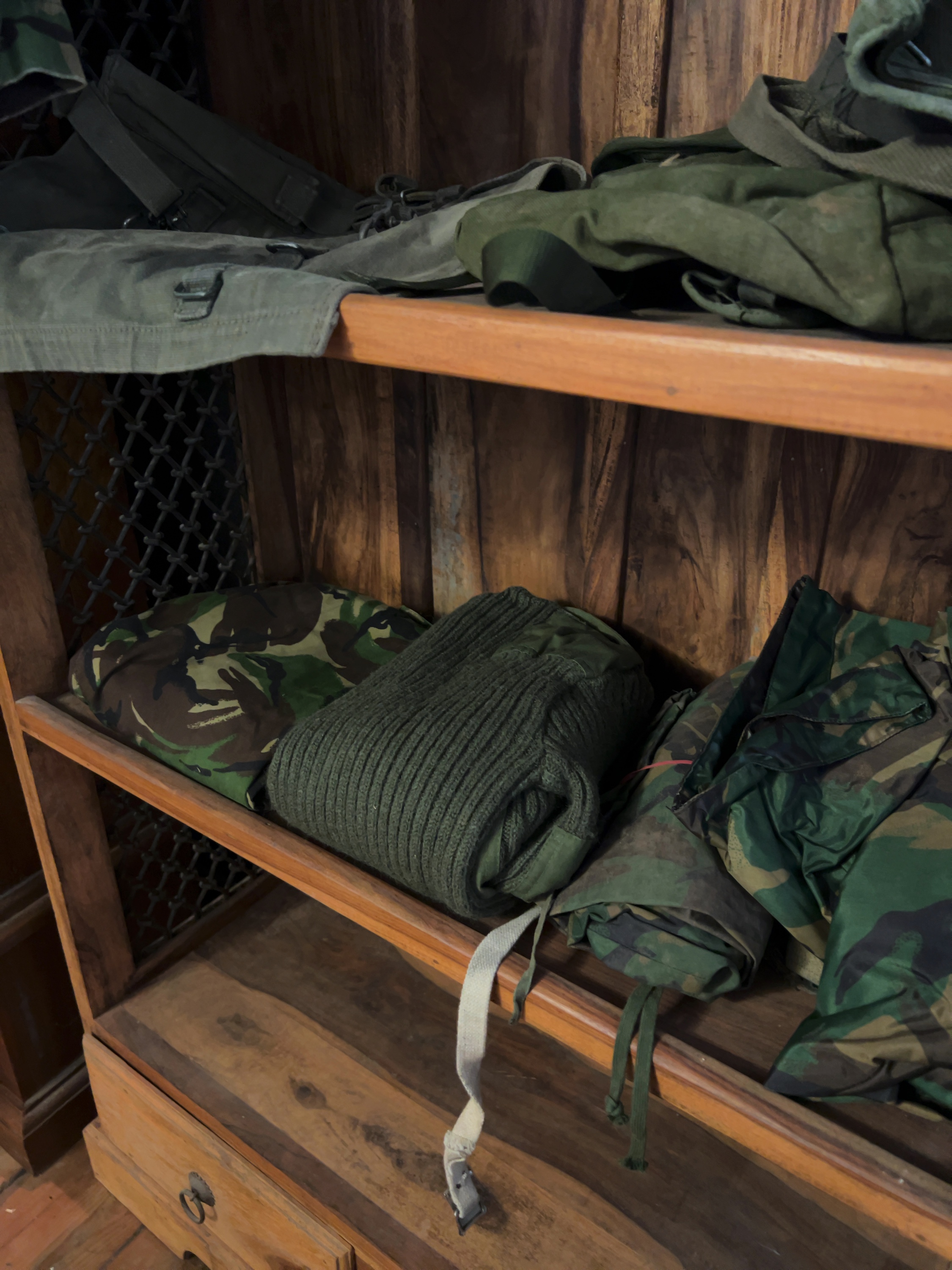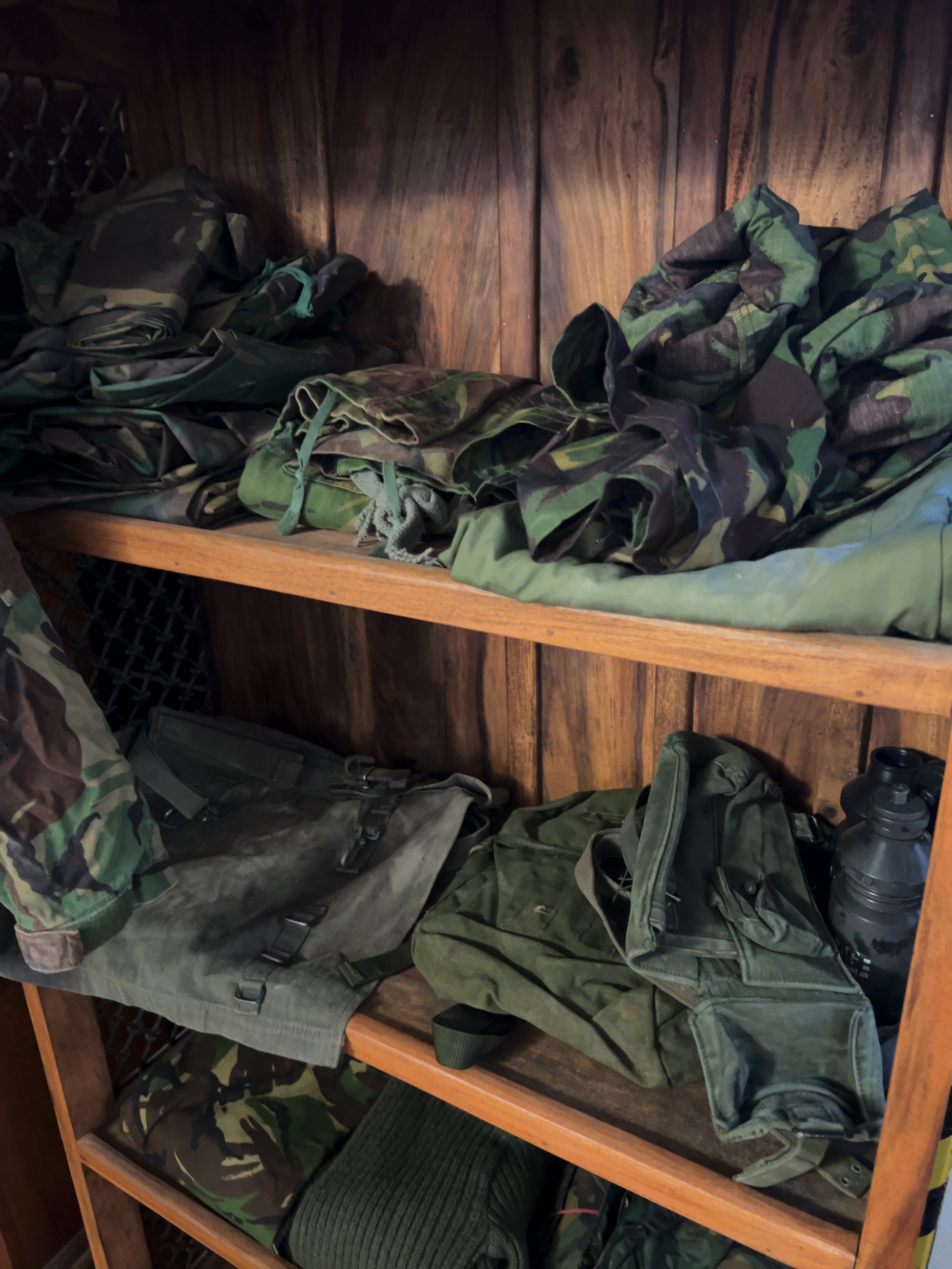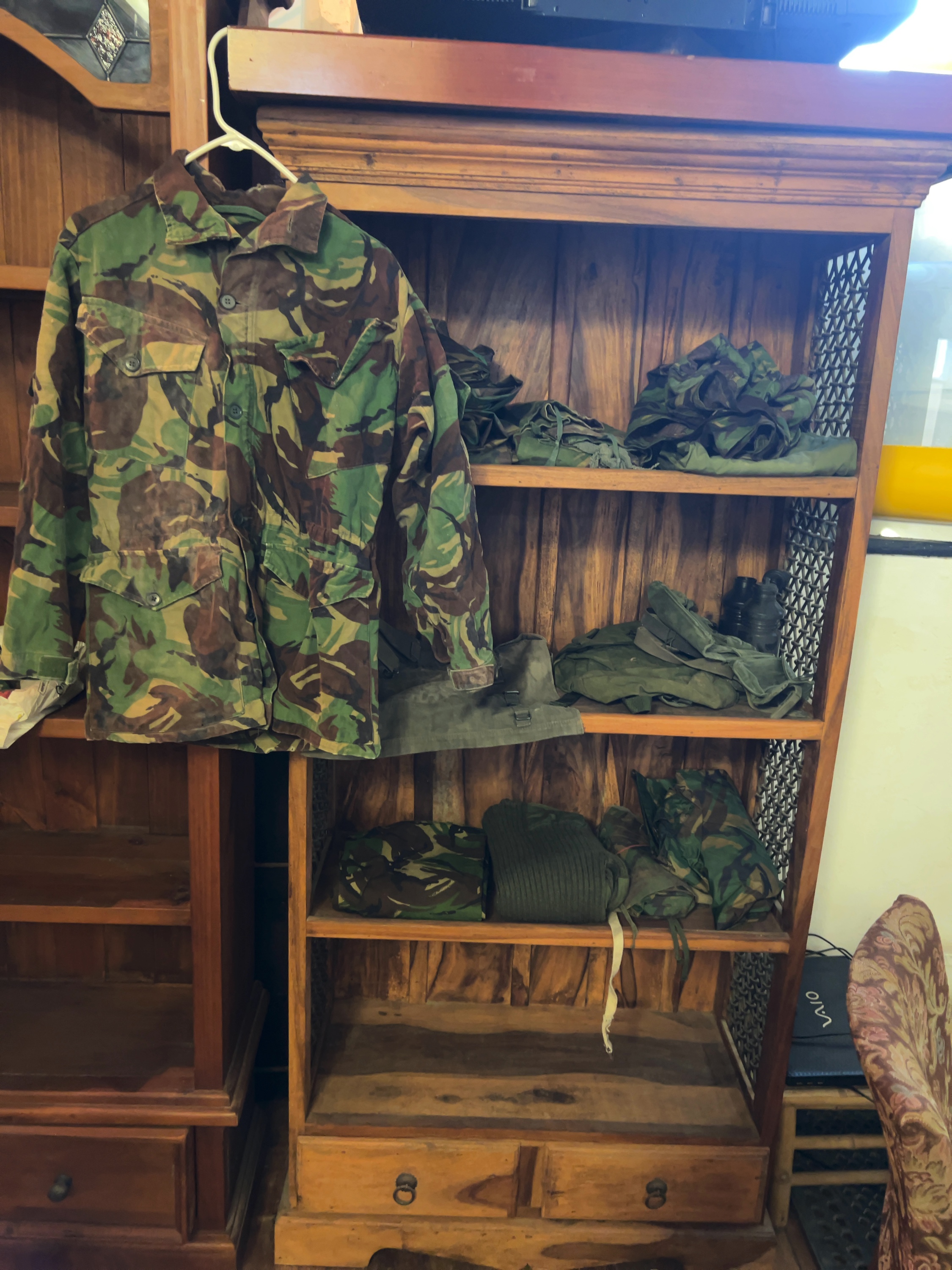 A collection of British Army uniforms and personal field equipment from the mid-to-late 20th century.