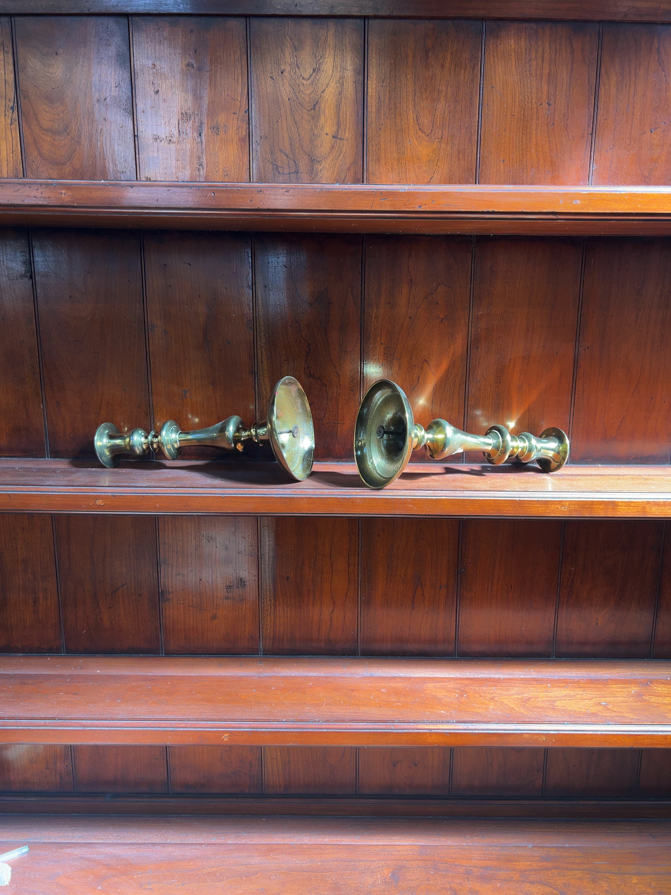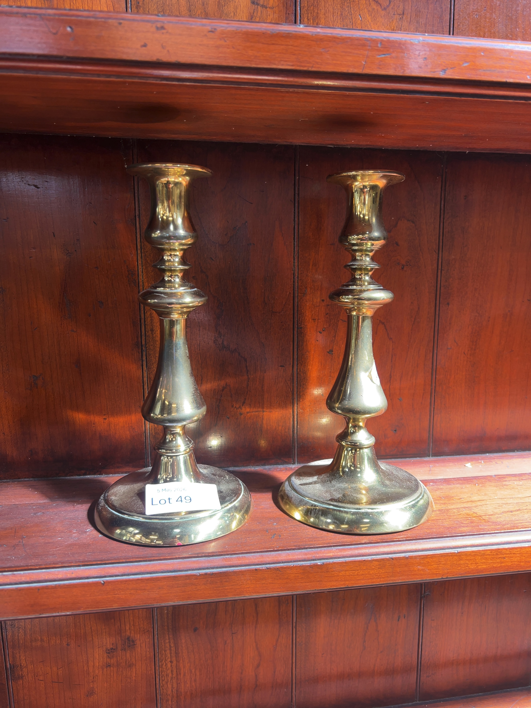 A pair of brass candlesticks in the Georgian style, likely dating from the late 19th or early 20th century.
