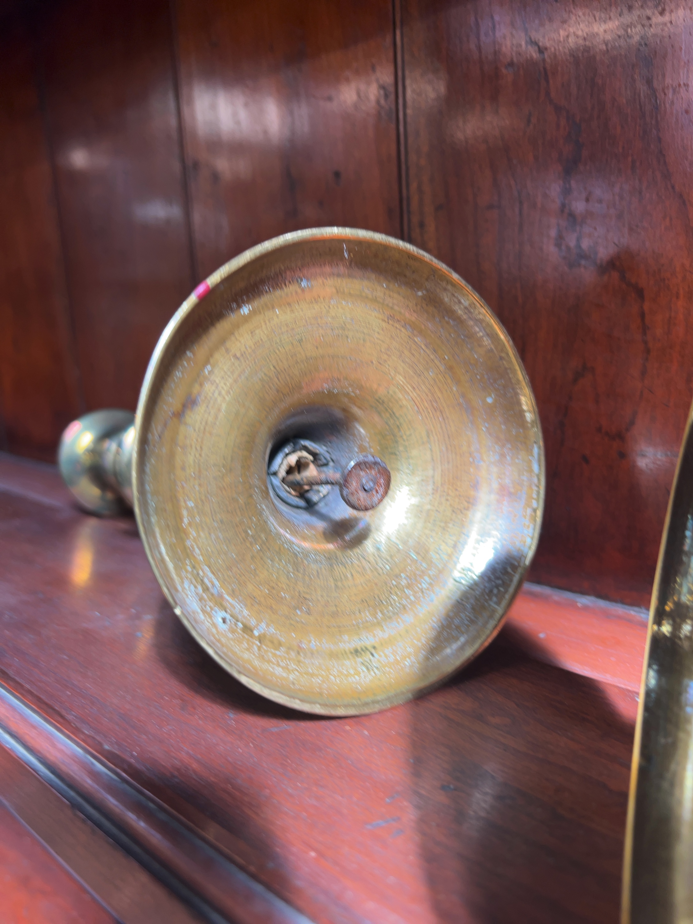 The pair is in good overall condition with a general patina of age and use. Visible surface scratches, minor indentations, and areas of tarnishing and oxidation are present throughout. The central iron rods visible on the undersides show heavy surface rust.