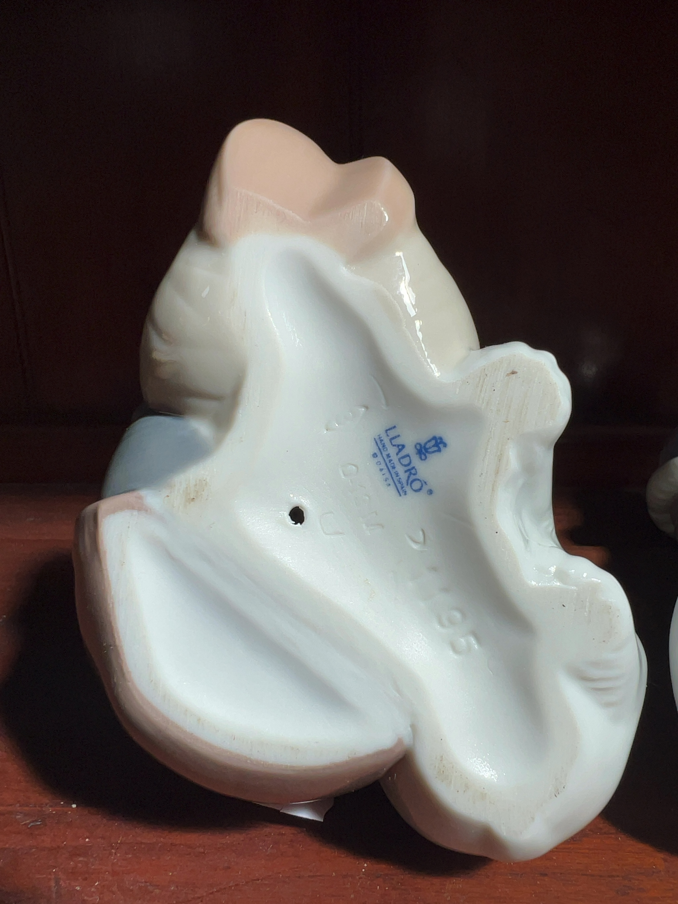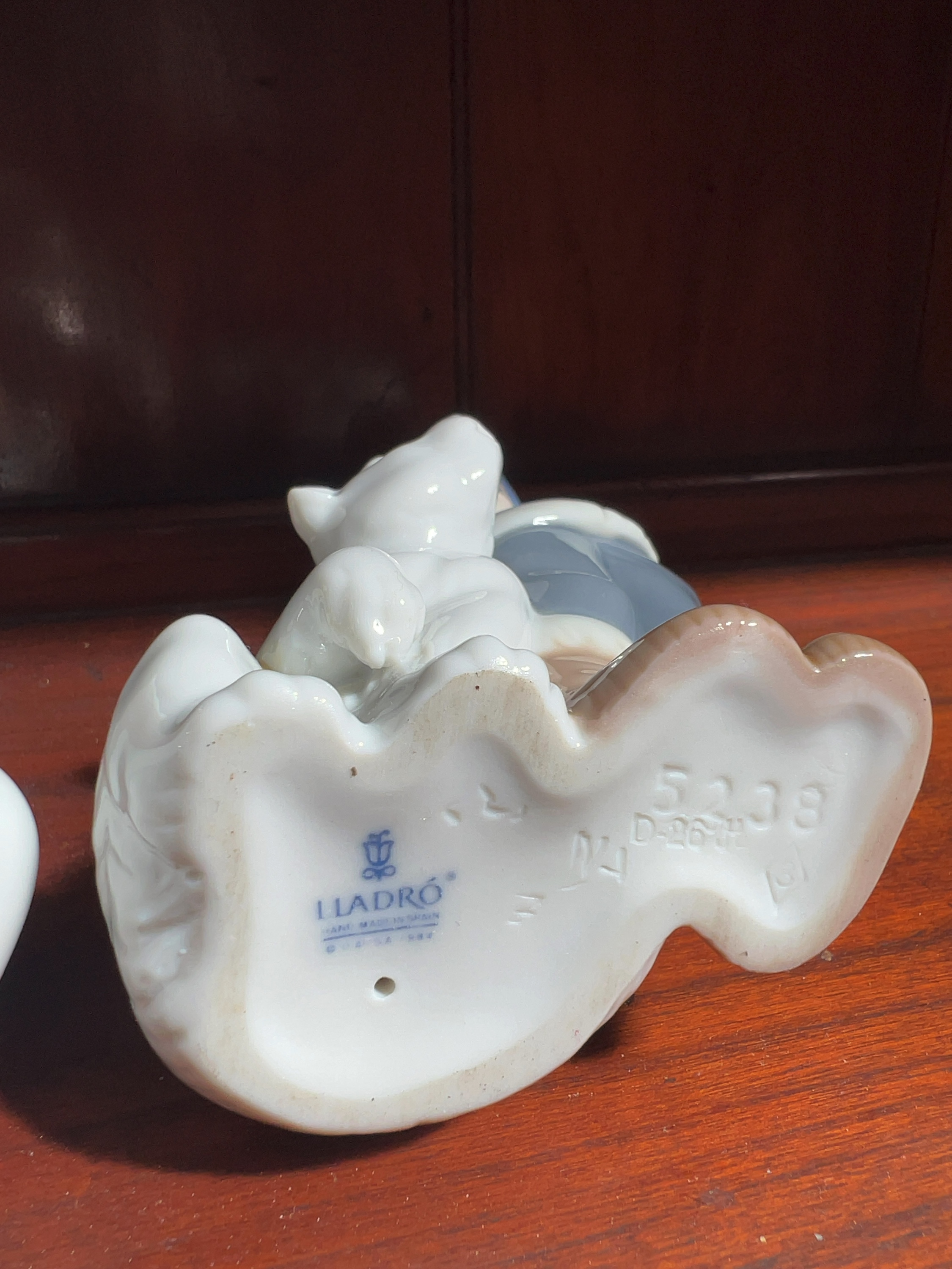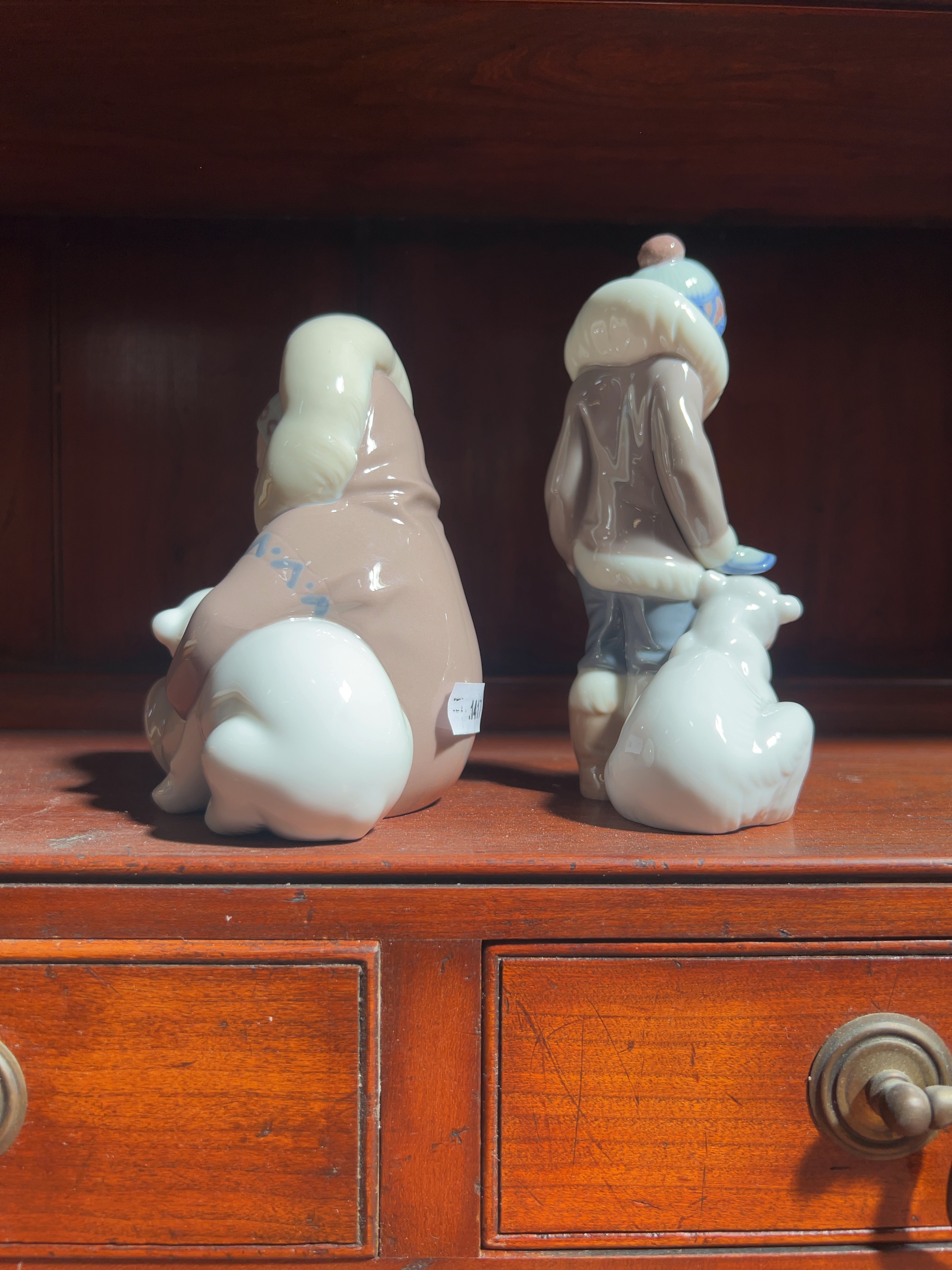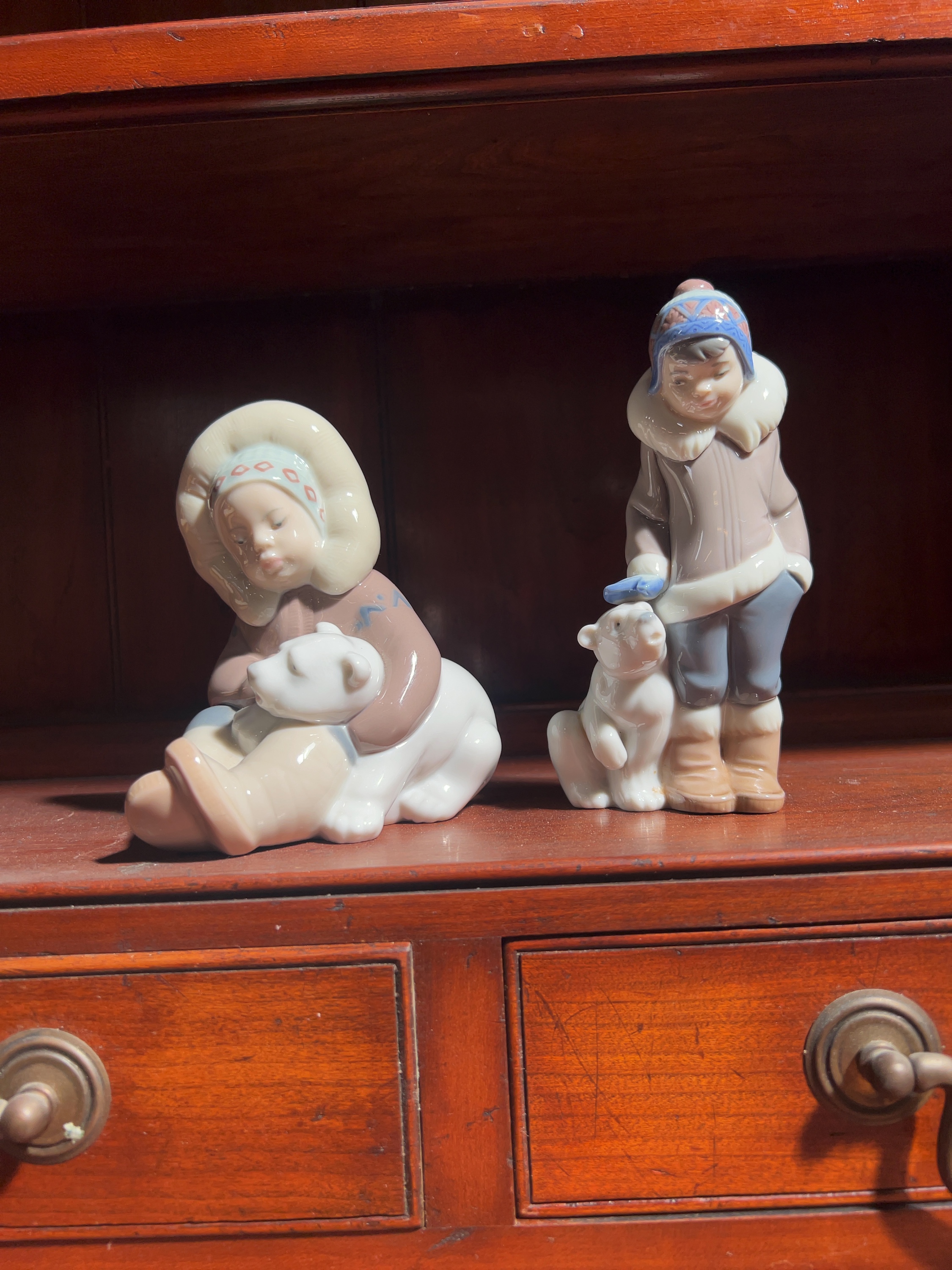 A pair of glazed porcelain figurines manufactured by Lladró in Spain, both designed by Juan Huerta and depicting Inuit children with polar bear cubs. The first figurine is model number 5195, titled Eskimo with Bear, shoulder. The second figurine, model number 5238, titled Eskimo Boy with Polar Bear Cub.
