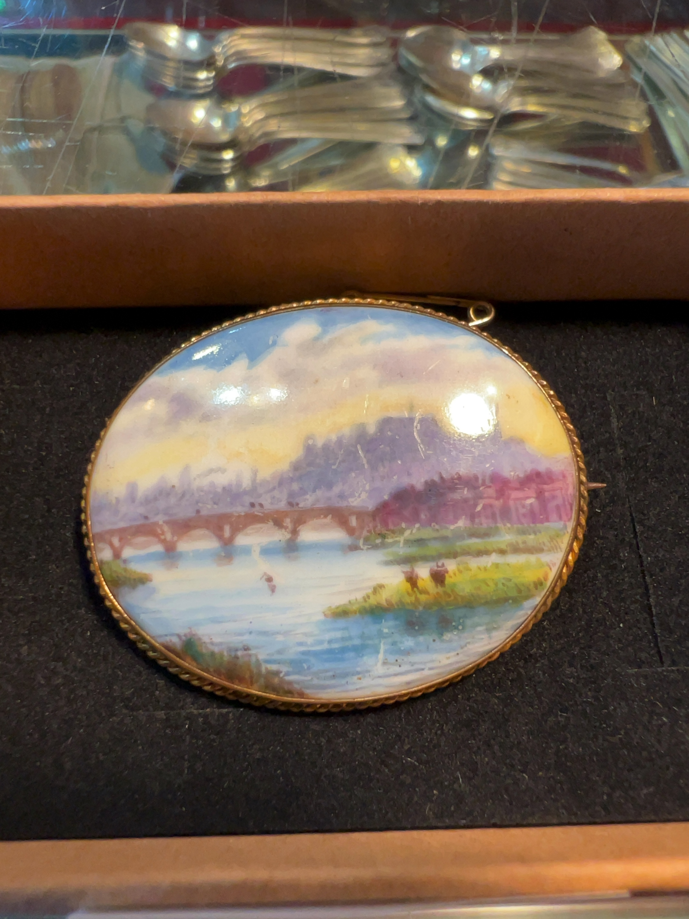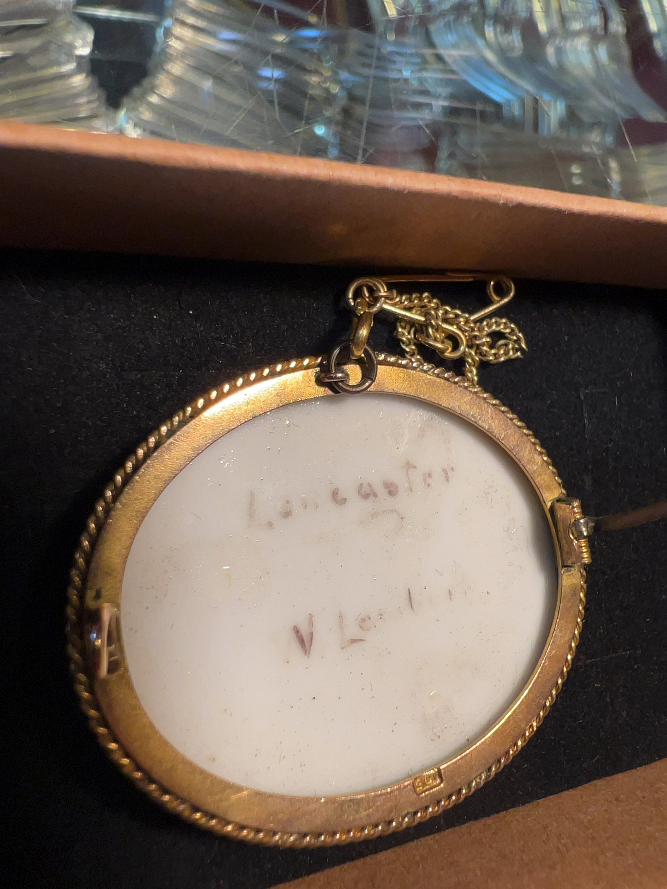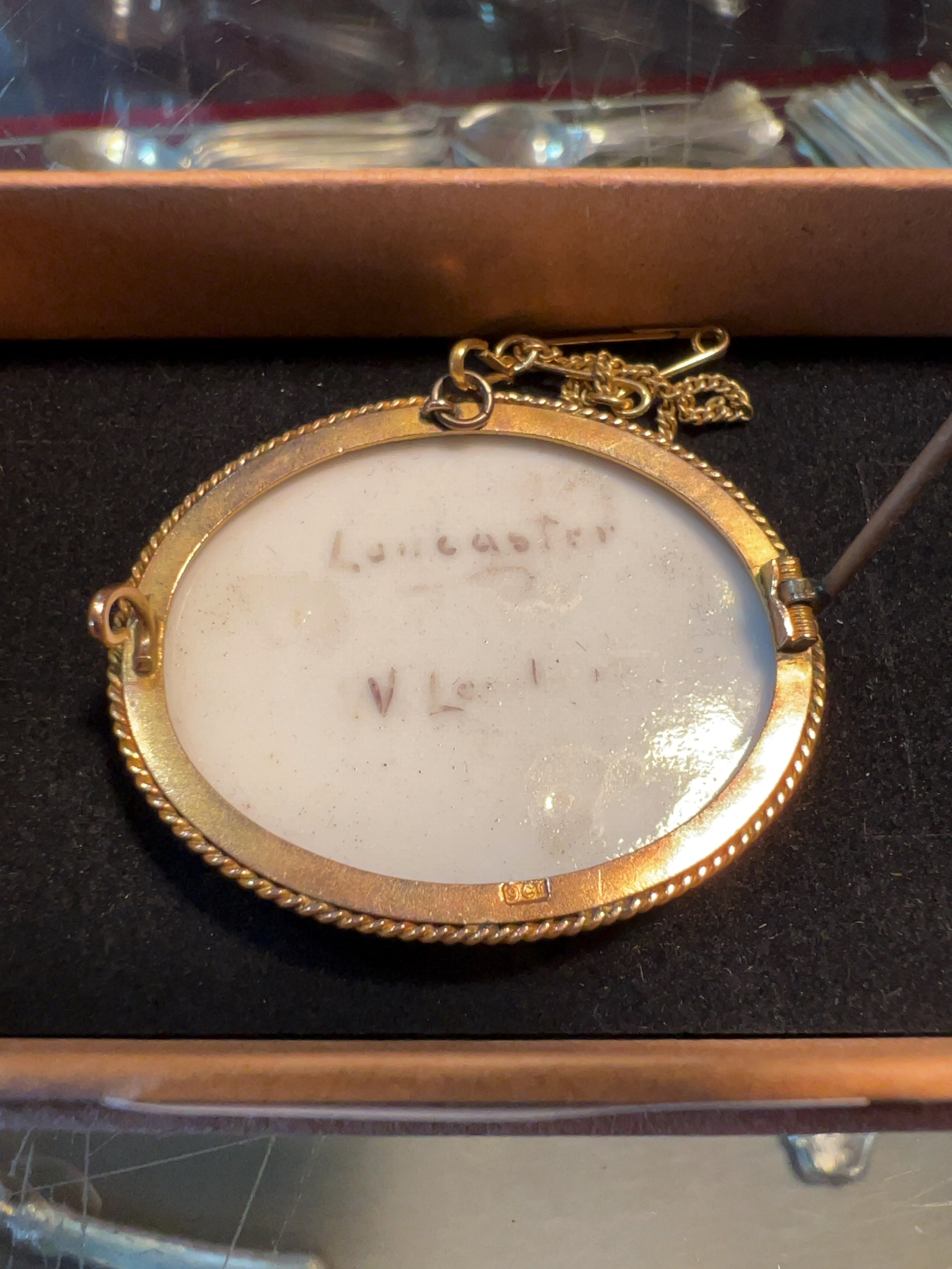 The painted porcelain plaque displays some fine surface scratches and light wear visible under magnification and direct light. No chips or cracks are apparent. The 9ct gold frame exhibits minor surface wear and light tarnishing consistent with age. The pin mechanism, pendant loop, and safety chain are all in functional condition.