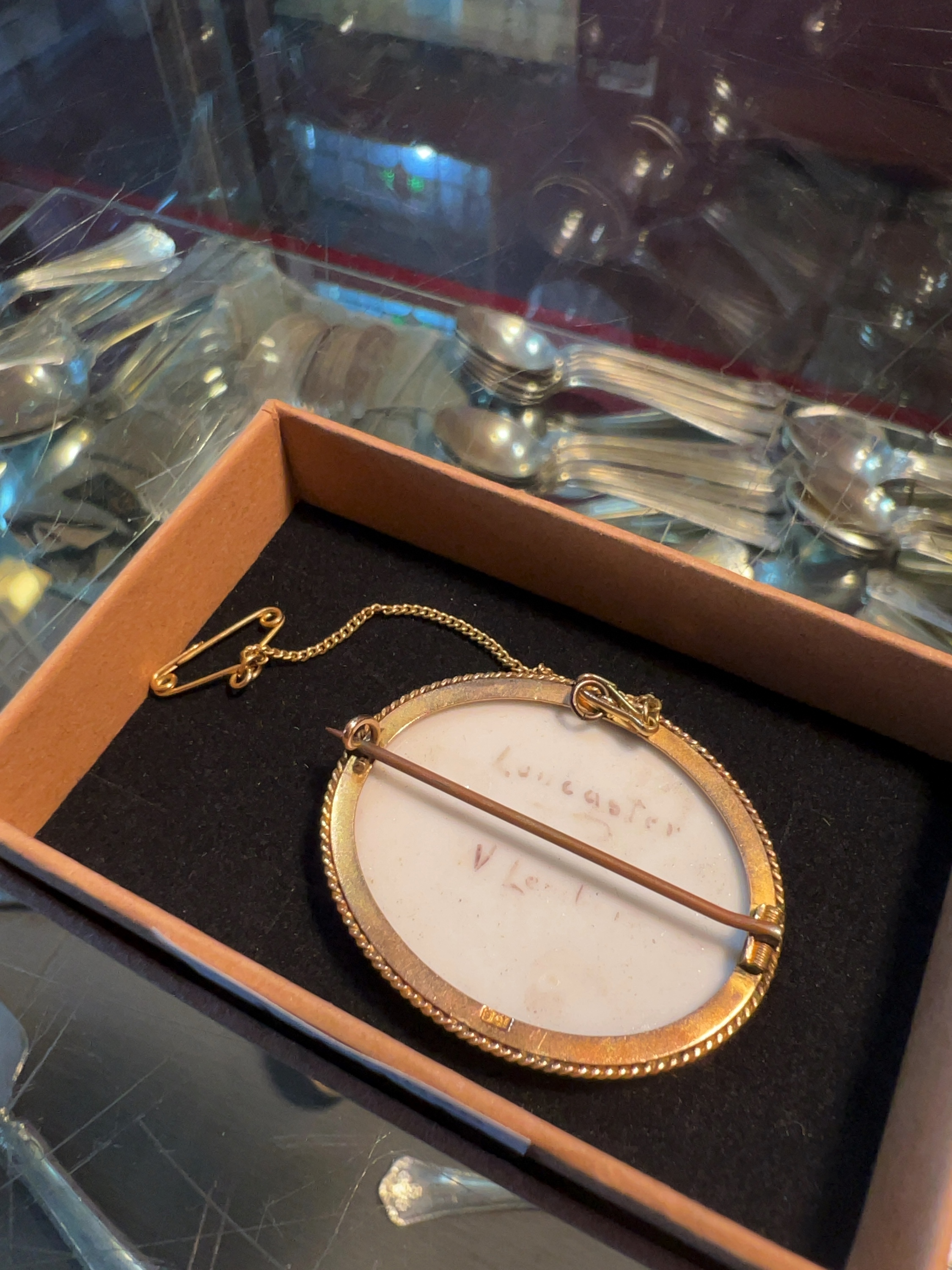 This antique jewellery item comprises an oval porcelain plaque set within a 9ct yellow gold frame. The plaque features a hand-painted topographical scene of Lancaster city, England, showing Skerton Bridge crossing the River Lune with Lancaster Castle and the Priory Church visible on the skyline. The gold frame is finished with a decorative twisted rope-work border. The reverse of the porcelain is inscribed in reddish-brown pigment with the location Lancaster and signed by the artist W. Lambert (c.1840–c.1920). The metal is stamped 9ct on the lower edge of the frame. The brooch is equipped with a hinged pin and a C-clasp, alongside a small bale at the top for use as a pendant. A safety chain with a safety pin is also attached.