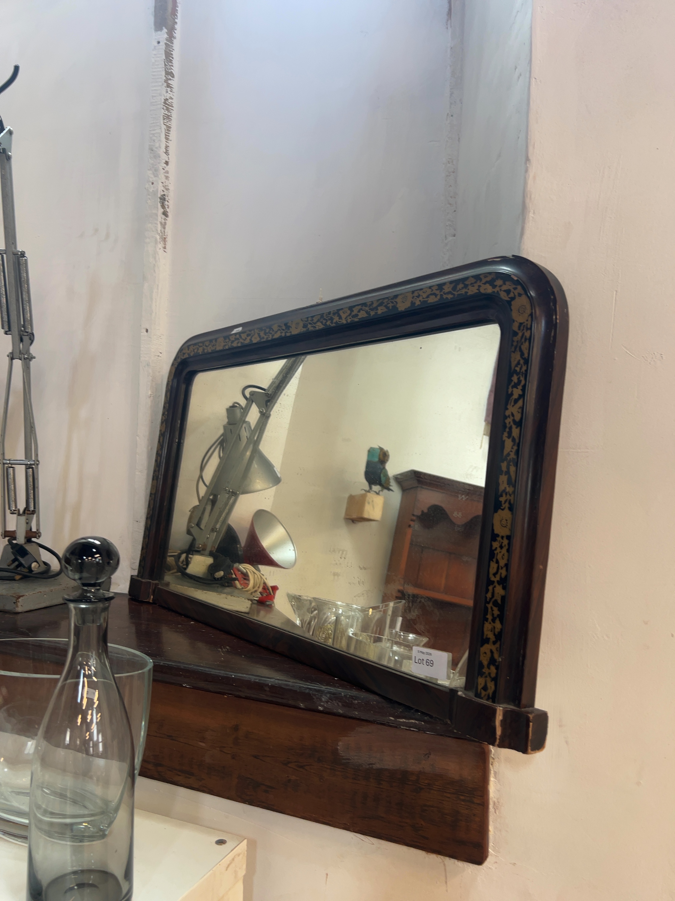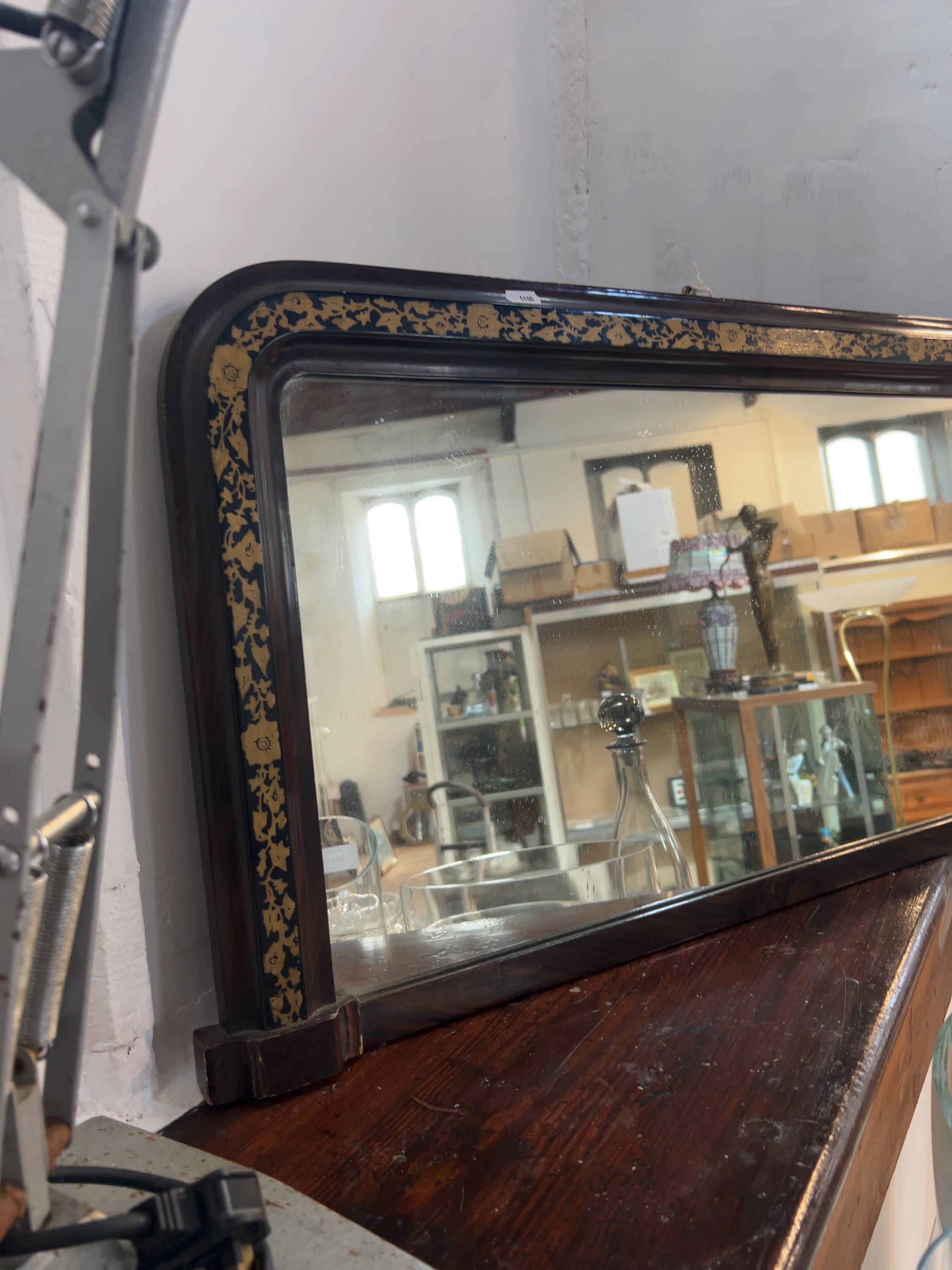 This late 19th or early 20th century overmantel mirror features a dark-stained wood frame with an arched top profile in the Louis Philippe style anddecorated with a gilt-stencilled foliate and floral border characteristic of the Aesthetic Movement.