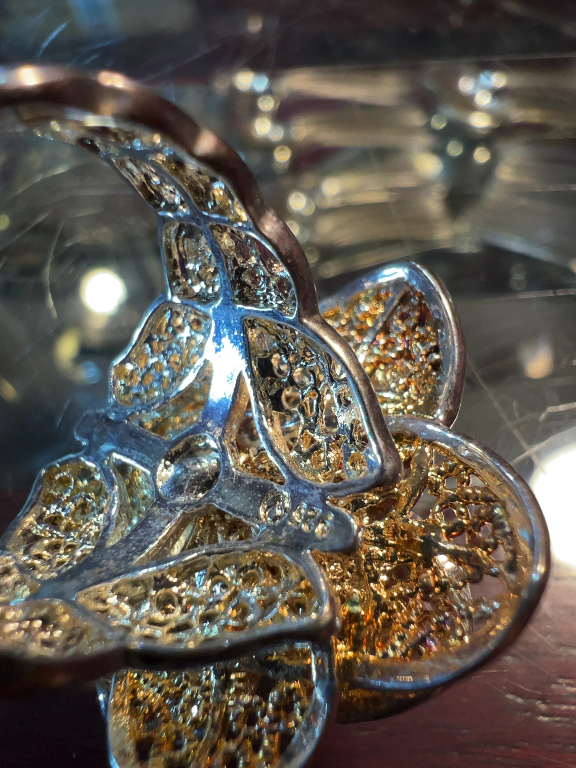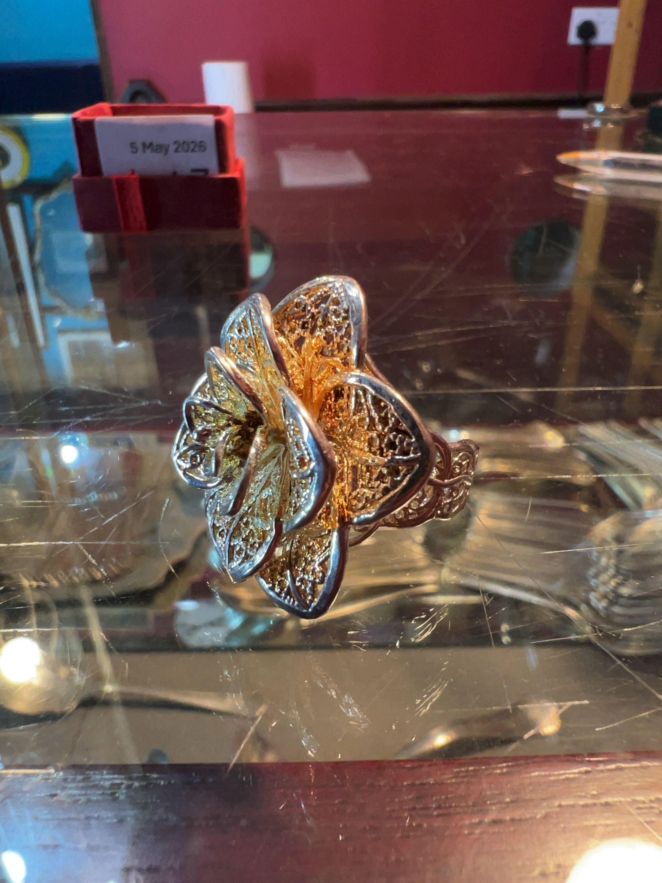 A large sterling silver statement cocktail ring designed as a multi-petalled rose or flower head. The piece features intricate open-work filigree within each petal, finished with a golden-yellow wash to create a two-tone effect against the polished silver-toned petal edges. The decorative shank continues the open-work theme with a scroll-like pattern and features a bypass or open-ended design. The underside of the flower head bears a stamped mark within a circular cartouche featuring the characters 925, indicating the item is made of Silver 925. The construction is indicative of gold vermeil application over sterling silver.