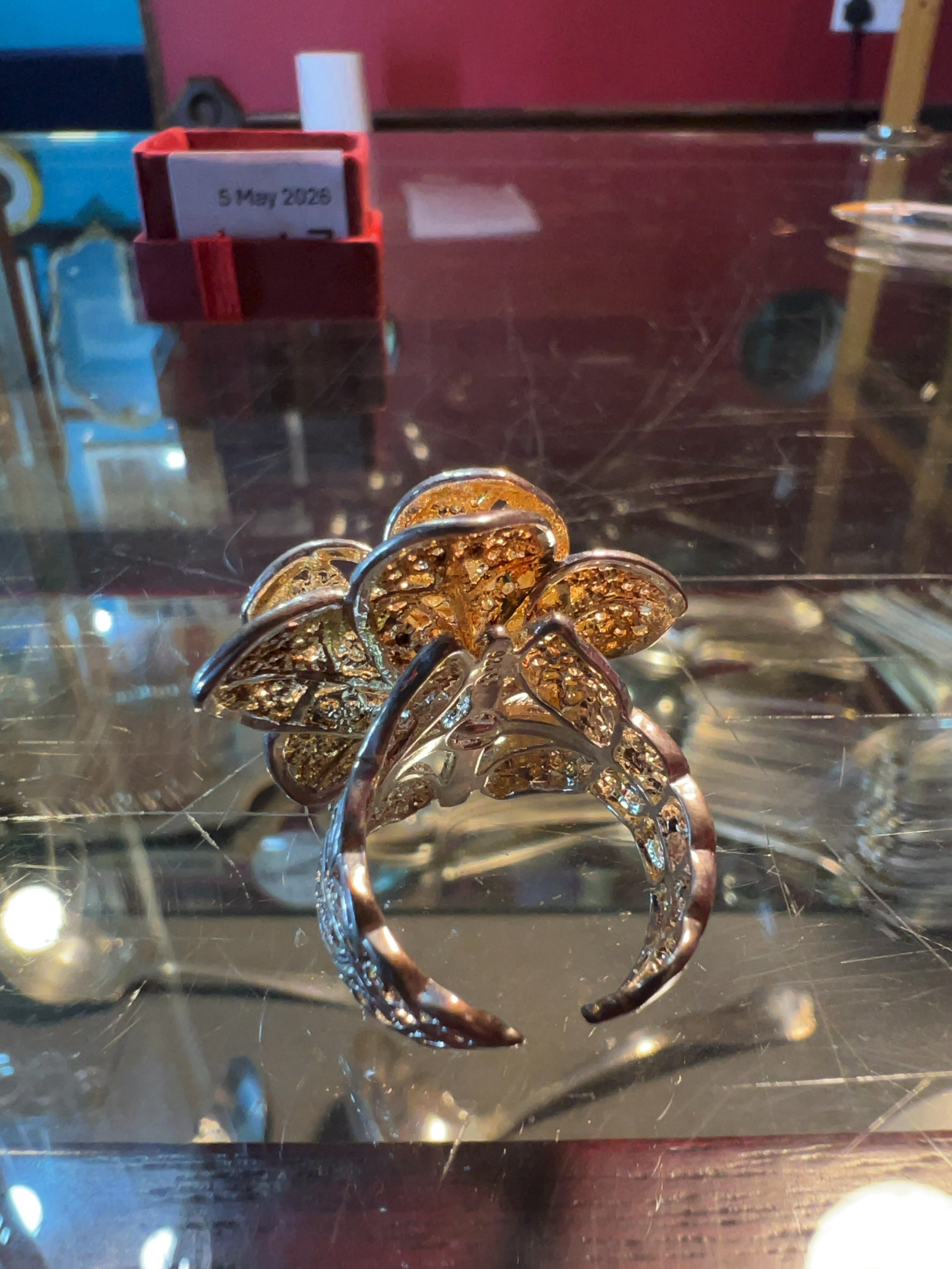 The ring is in good condition. The two-tone finish is largely intact, providing a high-contrast decorative effect. There is minor surface wear and light tarnishing consistent with a pre-owned jewellery item.