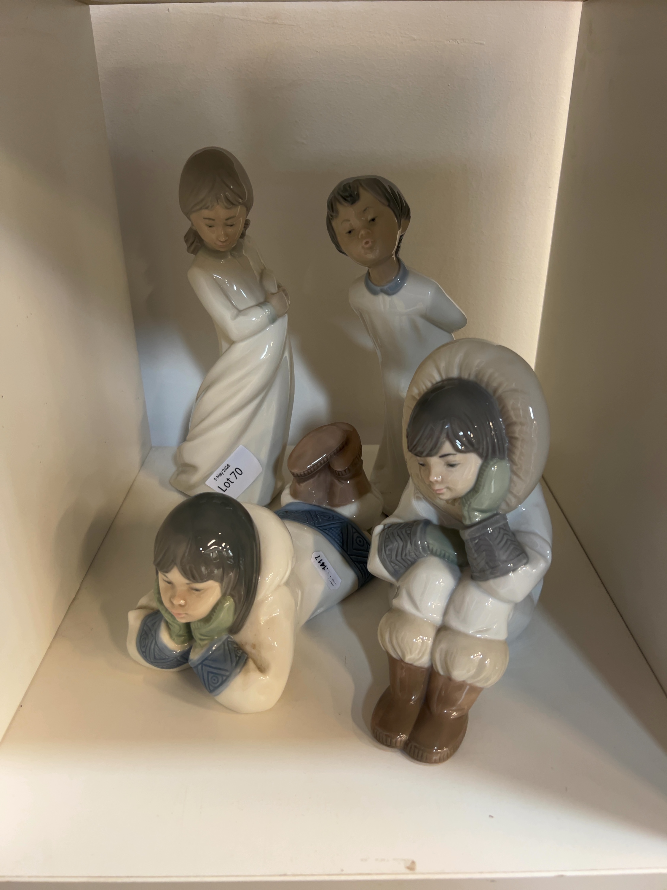 Four glazed porcelain figurines produced by the Nao factory in Spain. The group includes two Inuit-themed figures: one depicting a child in a white parka with a fur-lined hood in a seated position (model number 1397), and a second depicting a child lying on their front wearing a parka with blue patterned trim and green mittens (model number 1417). The collection also features two figures in nightwear: a girl in a long, flowing white nightdress with clasped hands, and a child in a white smock with a blue collar in a whistling pose.