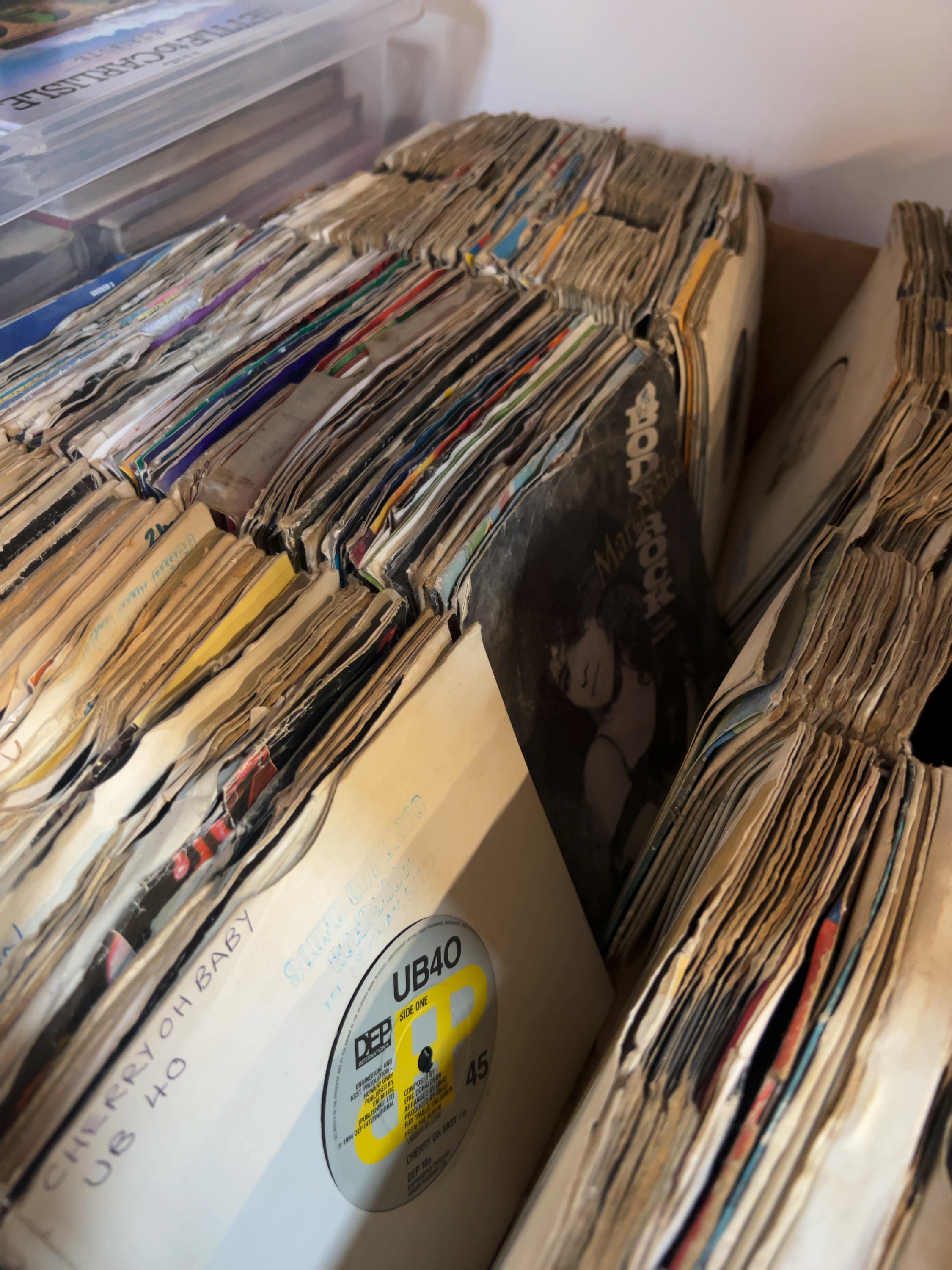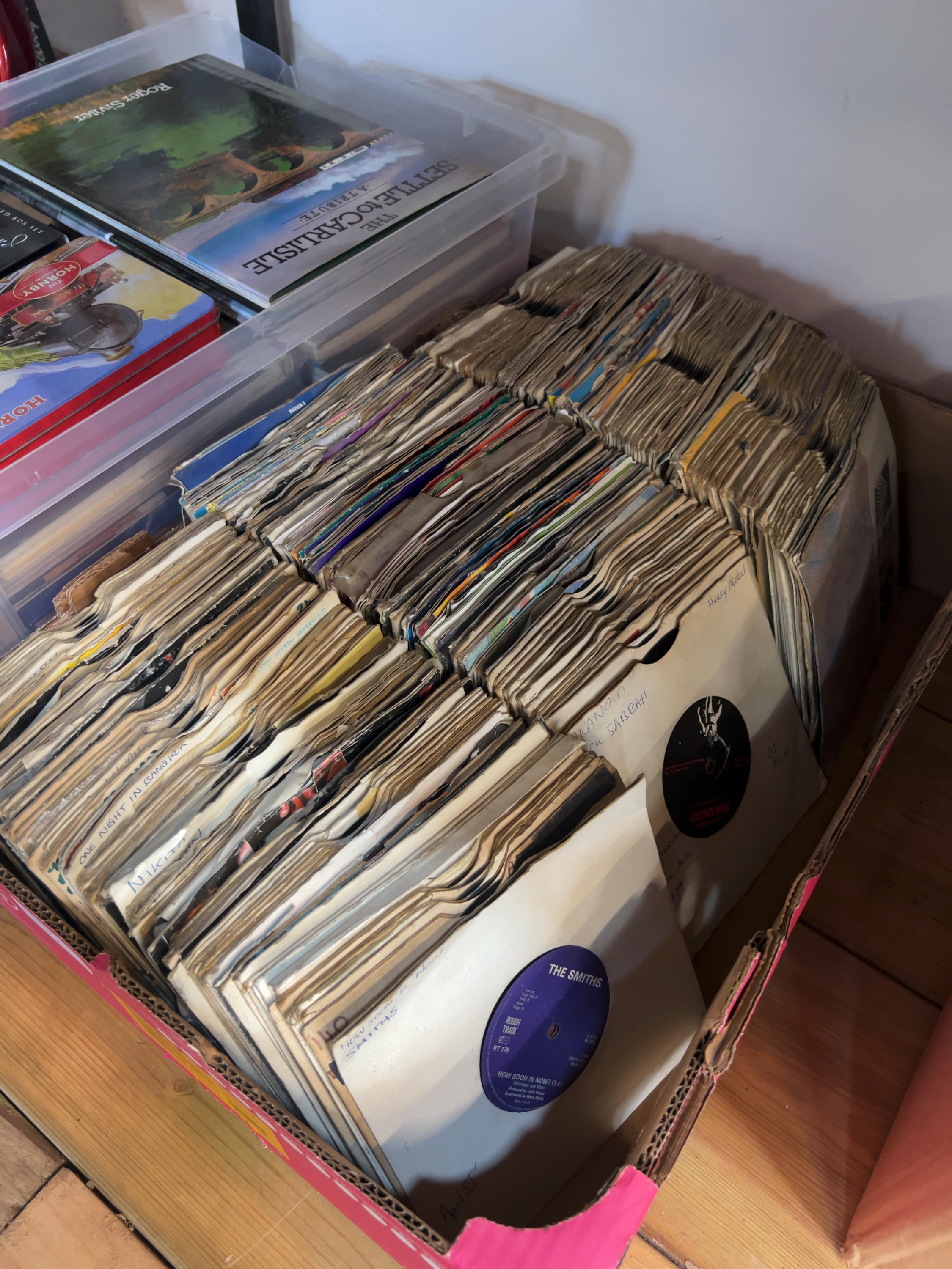 A large collection of approximately 200–300 vinyl 7-inch 45 rpm singles, predominantly dating from the 1970s and 1980s. The lot includes a wide variety of artists and genres characteristic of the UK music scene of the period. Notable visible items include The Smiths “How Soon Is Now?” on the Rough Trade label (RT 176) with a purple label, and UB40 “Cherry Oh Baby” on DEP International (DEP 10). Other artists and titles identified through handwritten annotations on plain sleeves include Black Sabbath (“Paranoid”), Murray Head (“One Night in Bangkok”), and Elton John (“Nikita”). The collection features a mix of original picture sleeves, including one appearing to be Mari Wilson, alongside generic or plain paper sleeves. Various labels are represented throughout the lot, including Rough Trade and DEP International. The records are housed in a cardboard fruit crate.