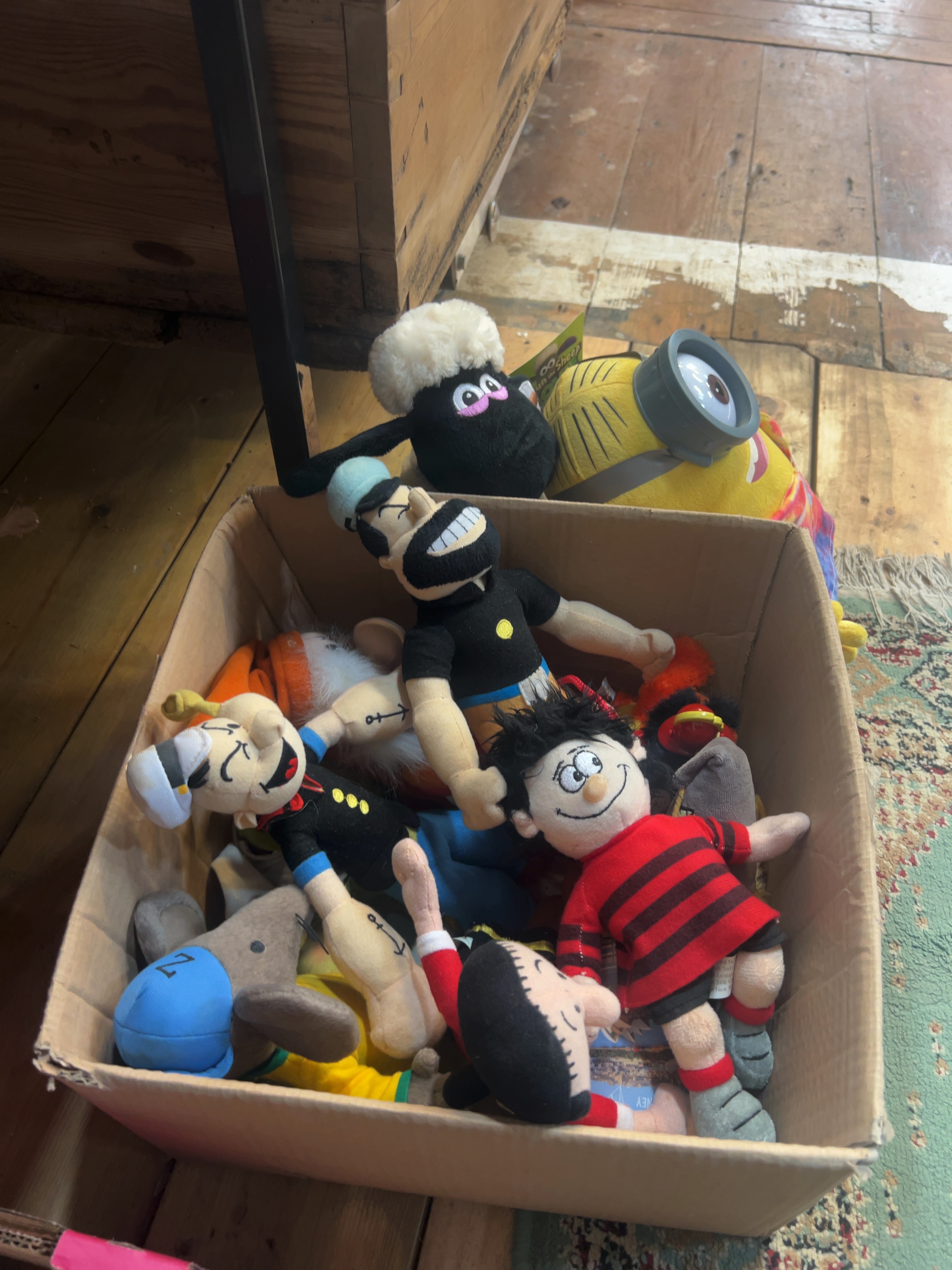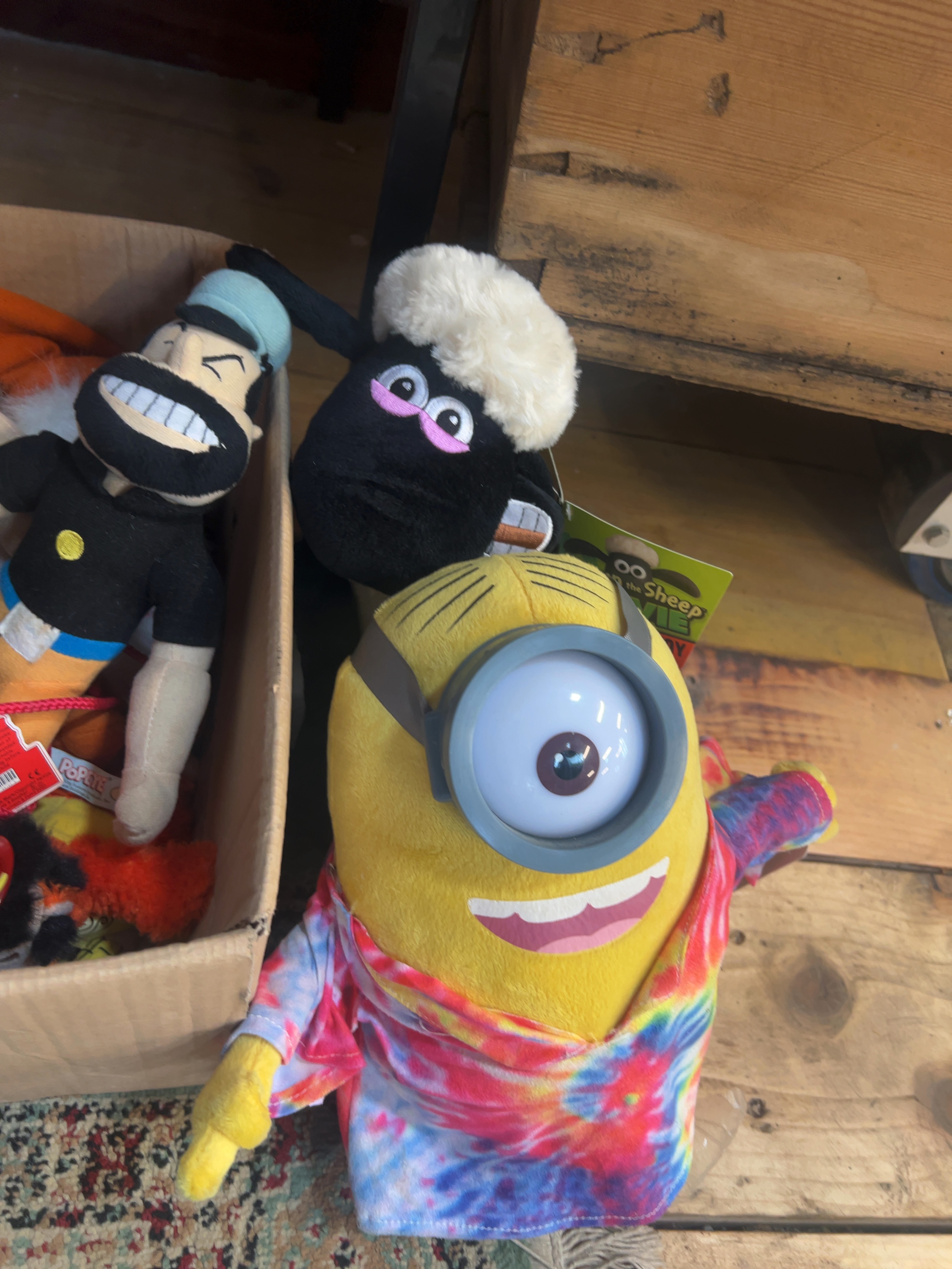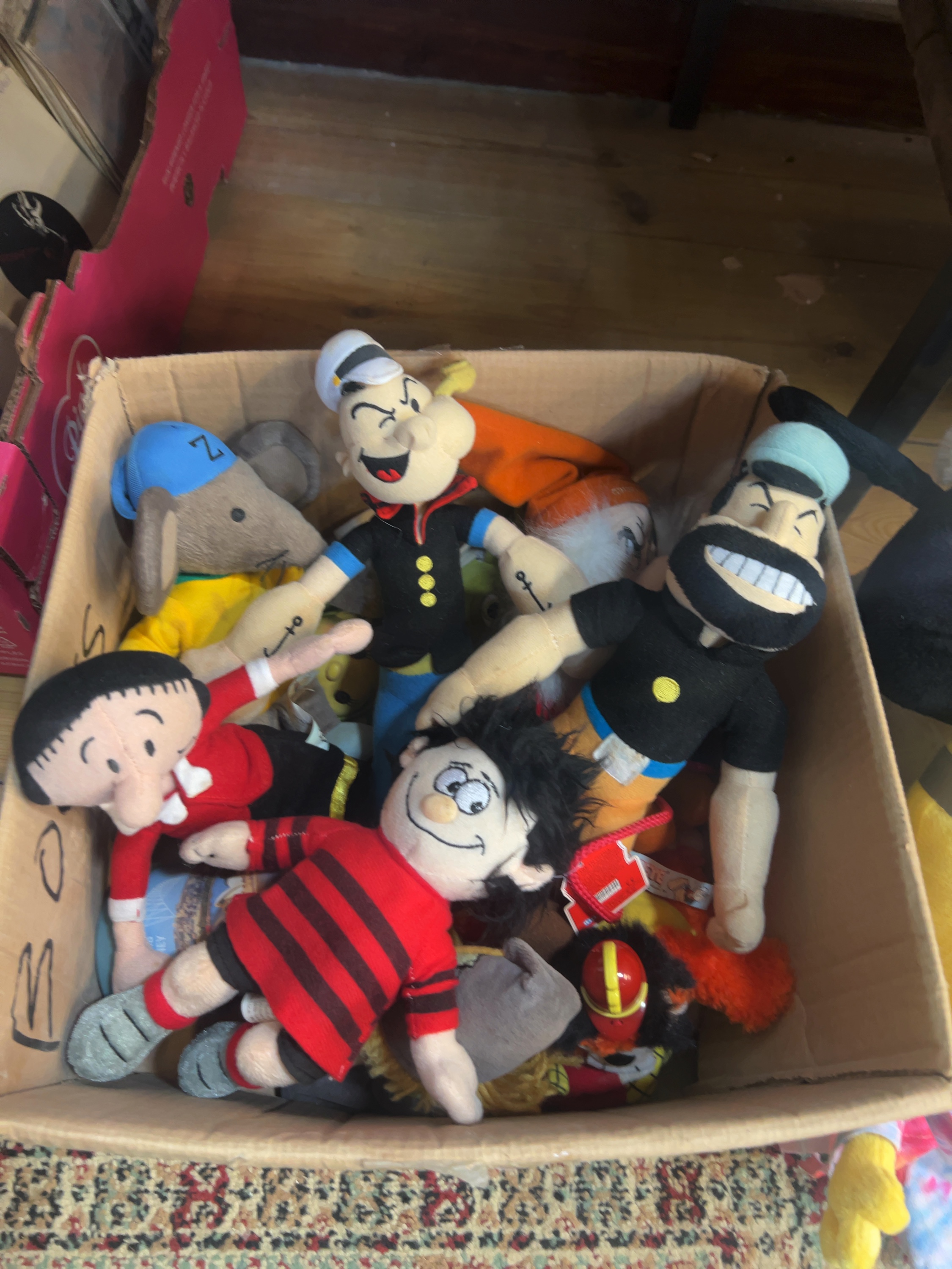 An assortment of soft plush toys featuring characters from various comic strips and animated films.