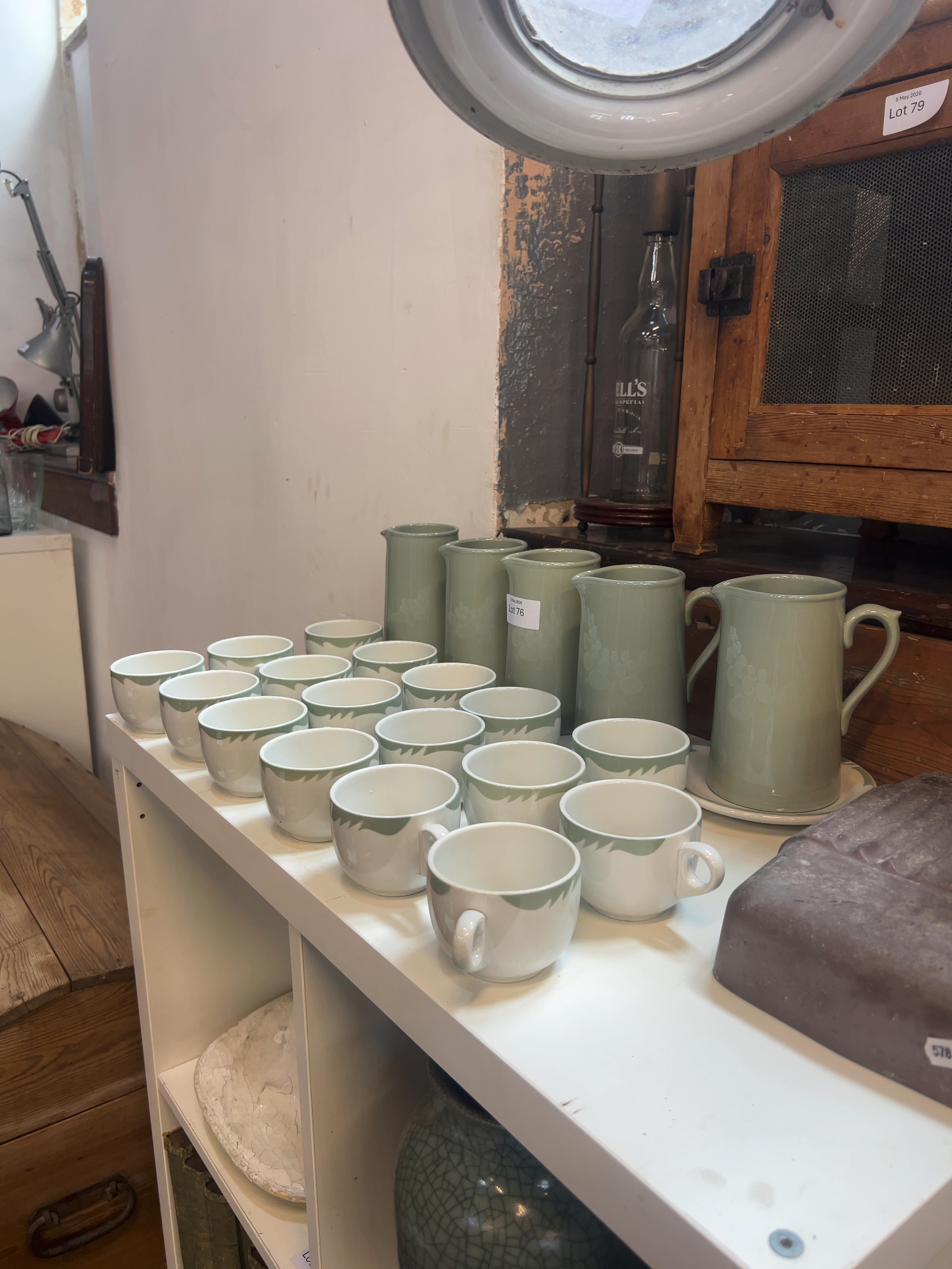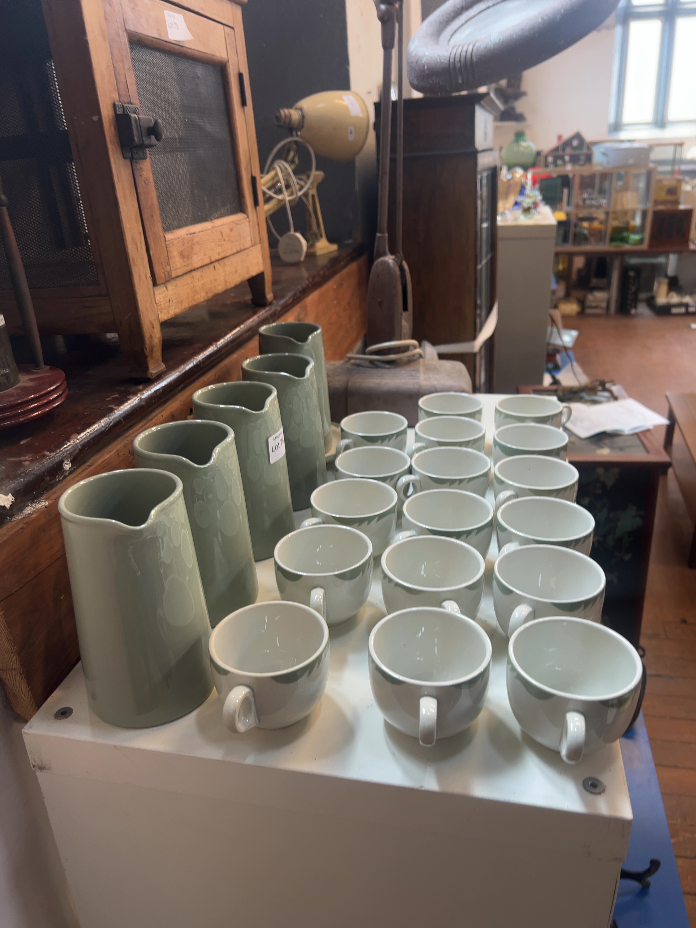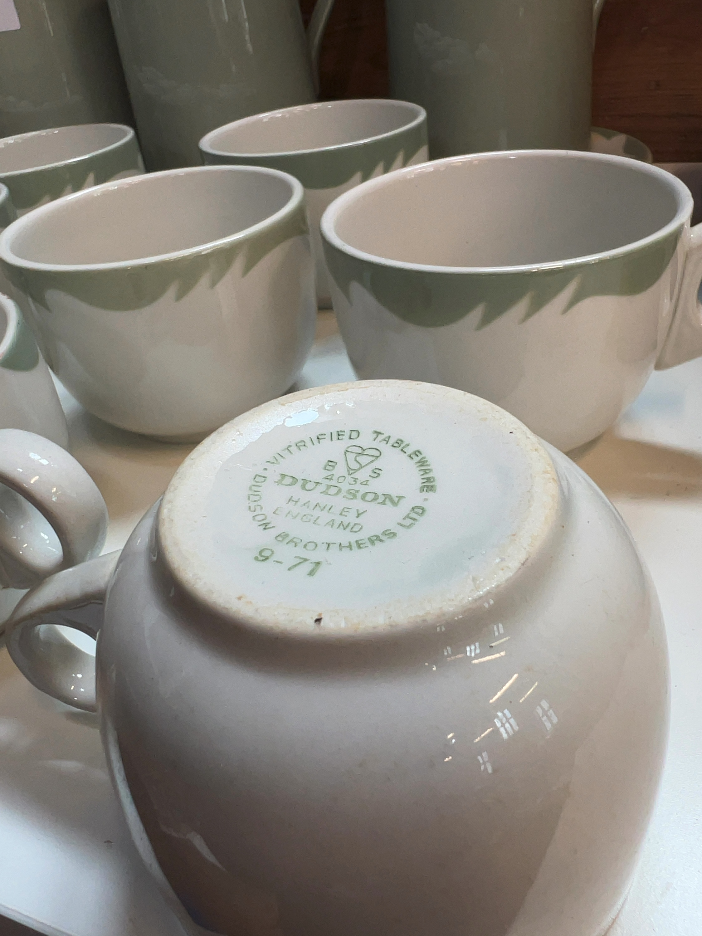 A collection of mid-20th-century English commercial-grade vitrified tableware manufactured by Dudson Brothers Ltd of Hanley, England. This part-service is crafted from high-fired, durable stoneware designed for the catering and hospitality industries. The set includes several pitchers, group of wide, bowl-shaped cups with single loop handles. Backstamped VITRIFIED TABLEWARE, B S 4034, DUDSON, HANLEY ENGLAND, DUDSON BROTHERS LTD. The mark includes the numerical code 9-71, indicating a production date of September 1971.