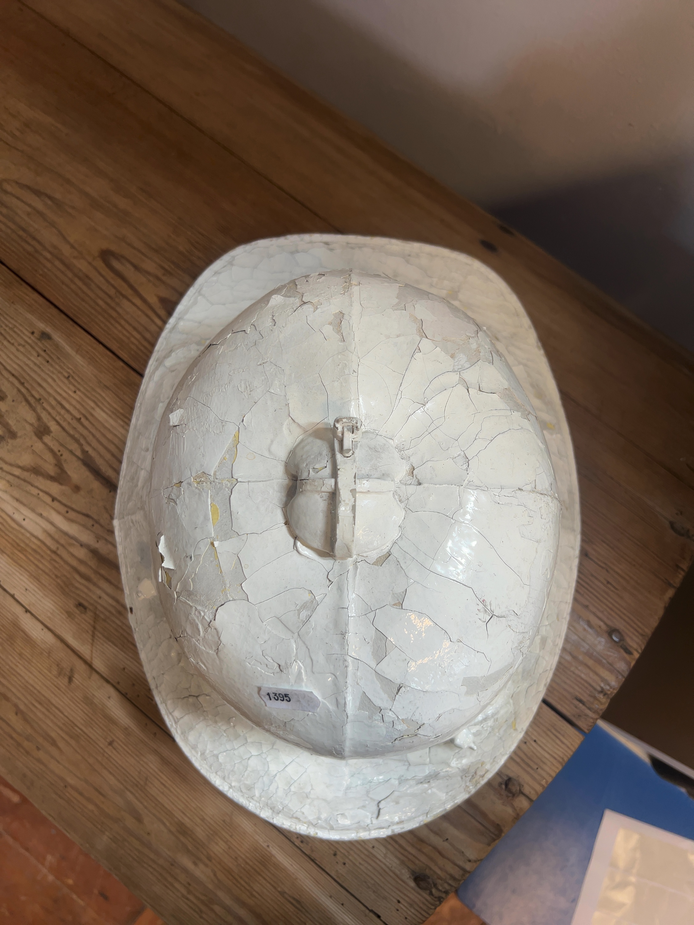 The helmet exhibits heavy weathering to the exterior. The white surface coating is severely crazed, cracked, and flaking throughout, with significant loss revealing the fabric underneath. There is minor deformation and wear to the edge of the brim. The interior fabric shows age-related staining and wear. The leather sweatband and chinstrap remain present but exhibit stiffening and surface cracking consistent with age.