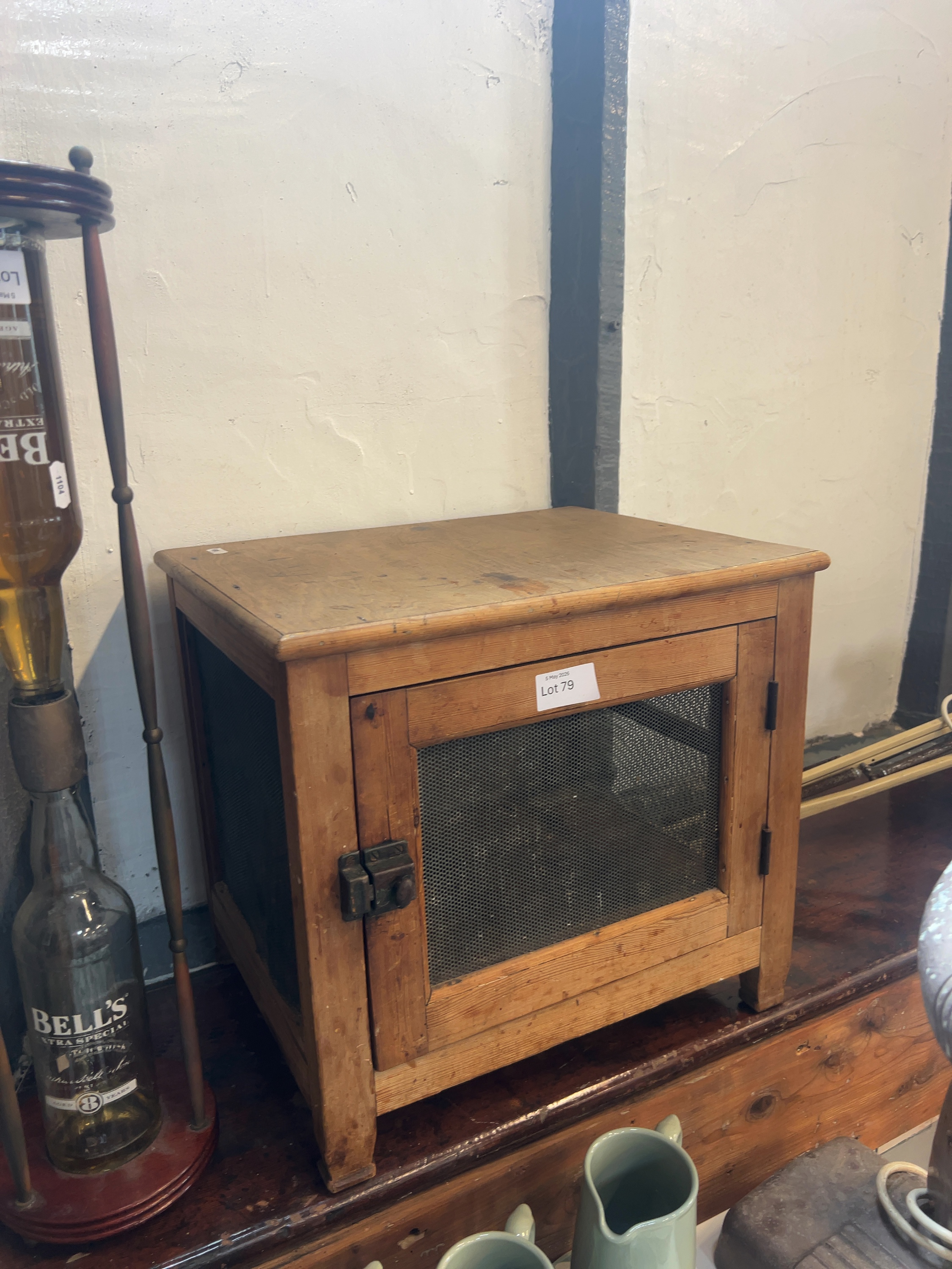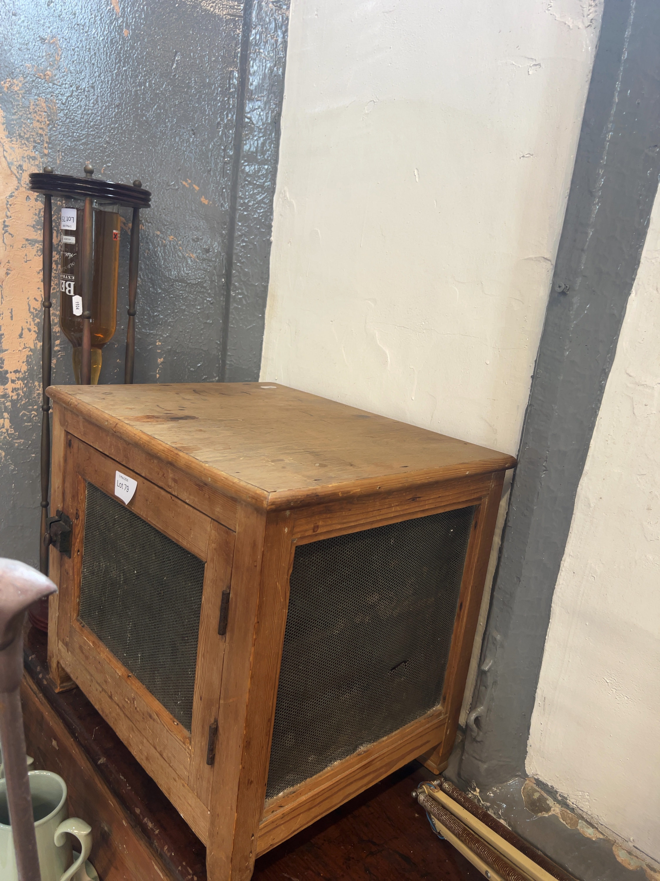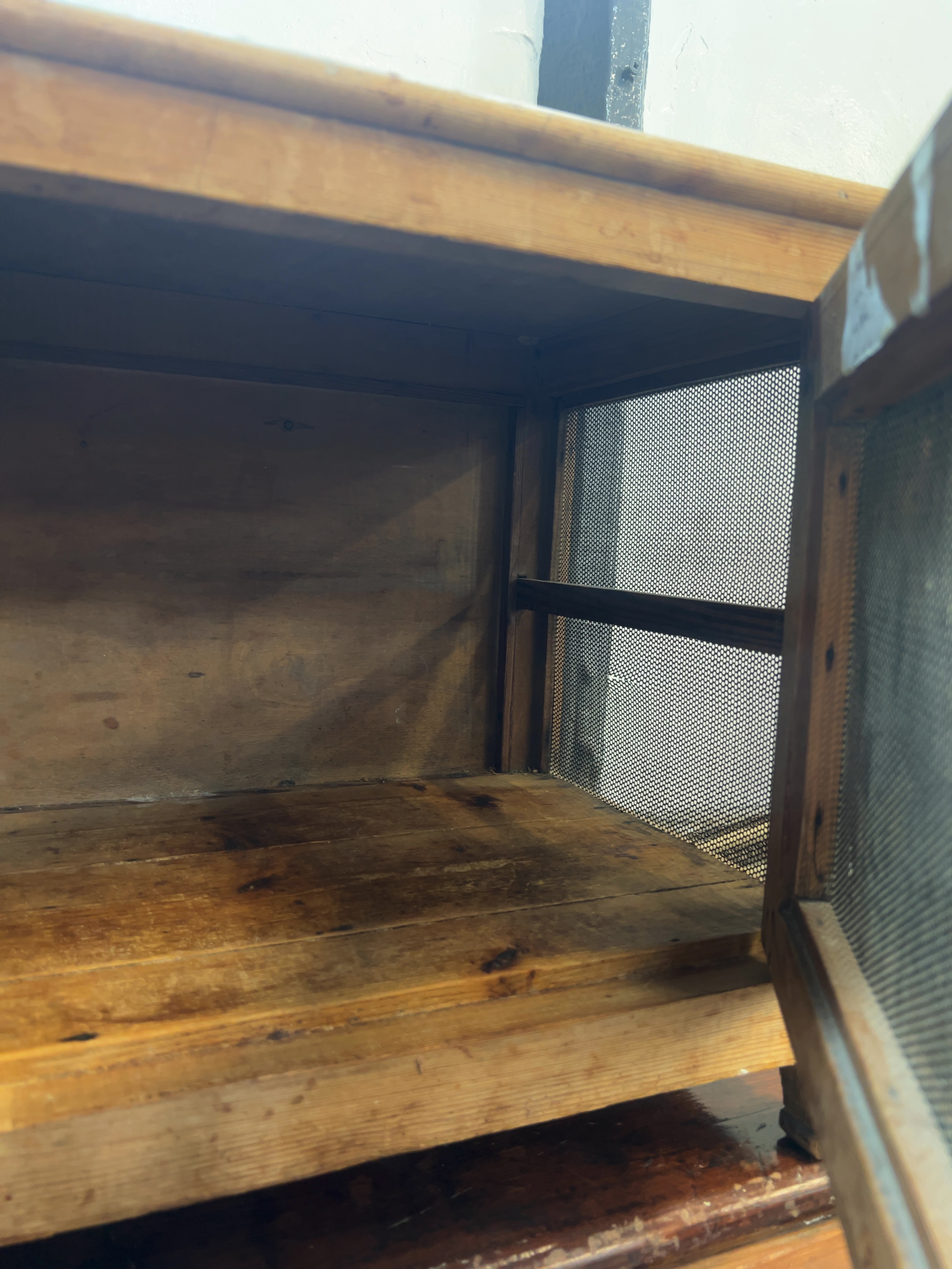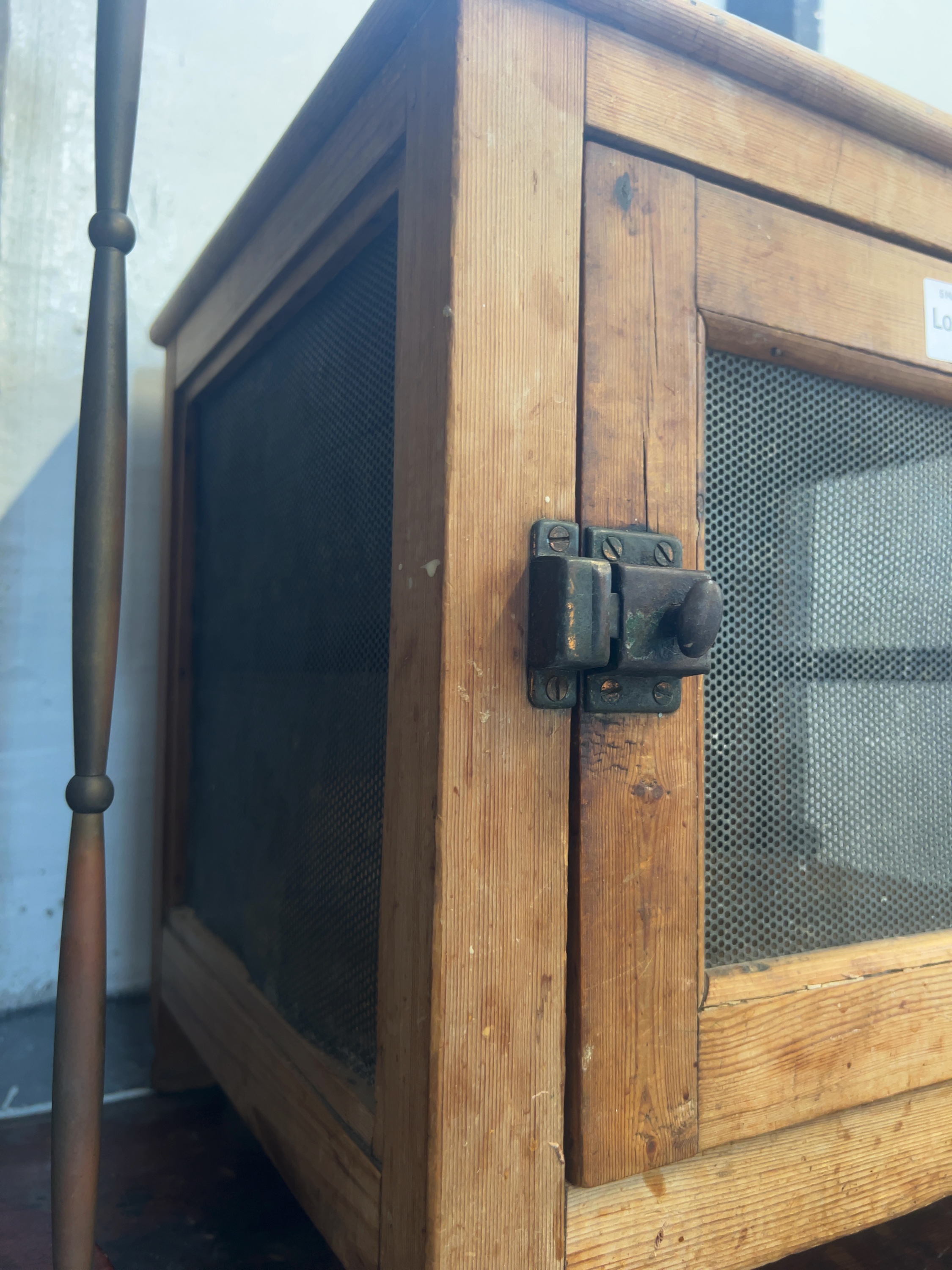 The item displays wear consistent with age and use, including staining and marks to the wooden surfaces. There is minor oxidisation visible on the metal mesh panels and the cast hardware.