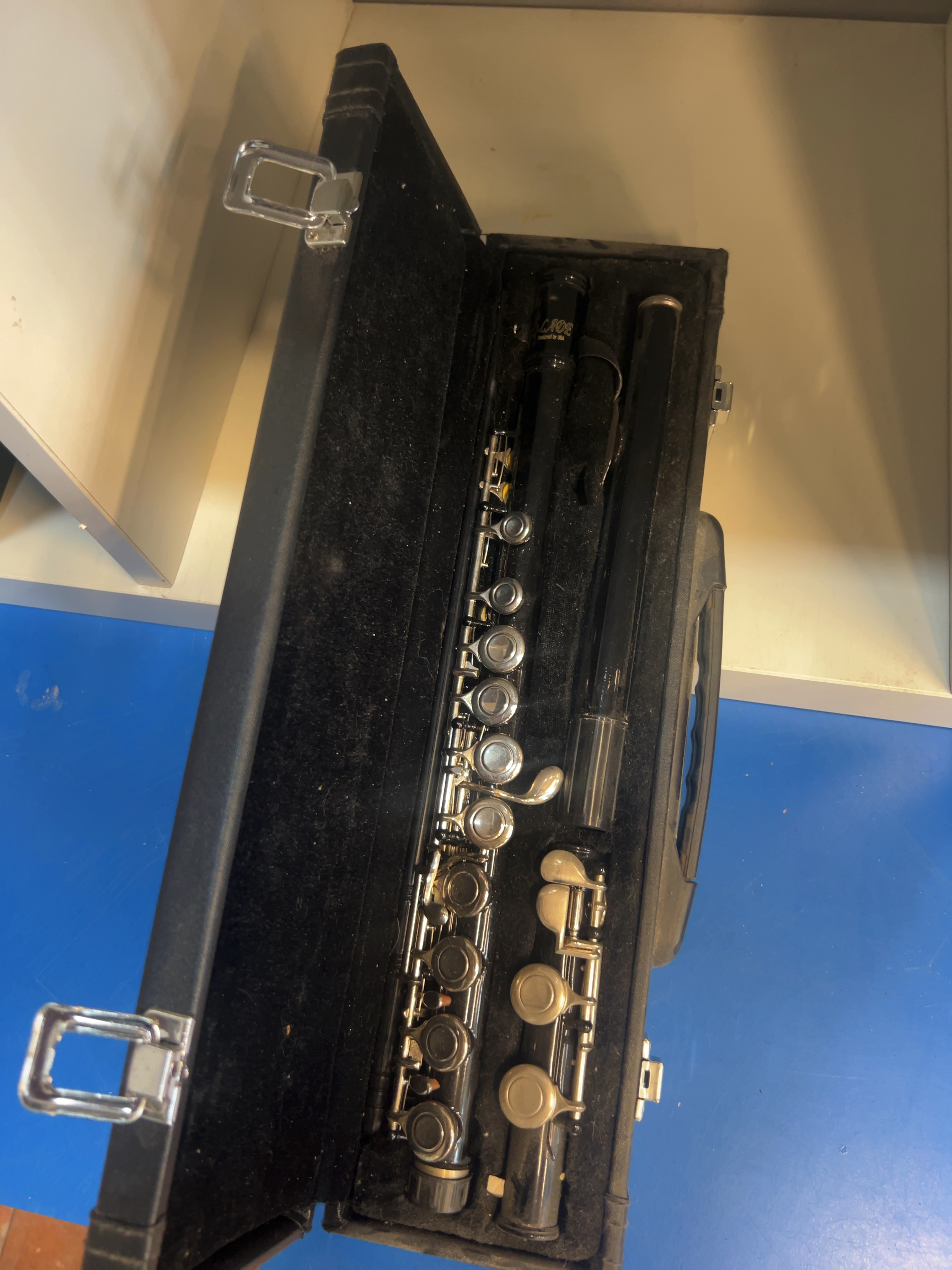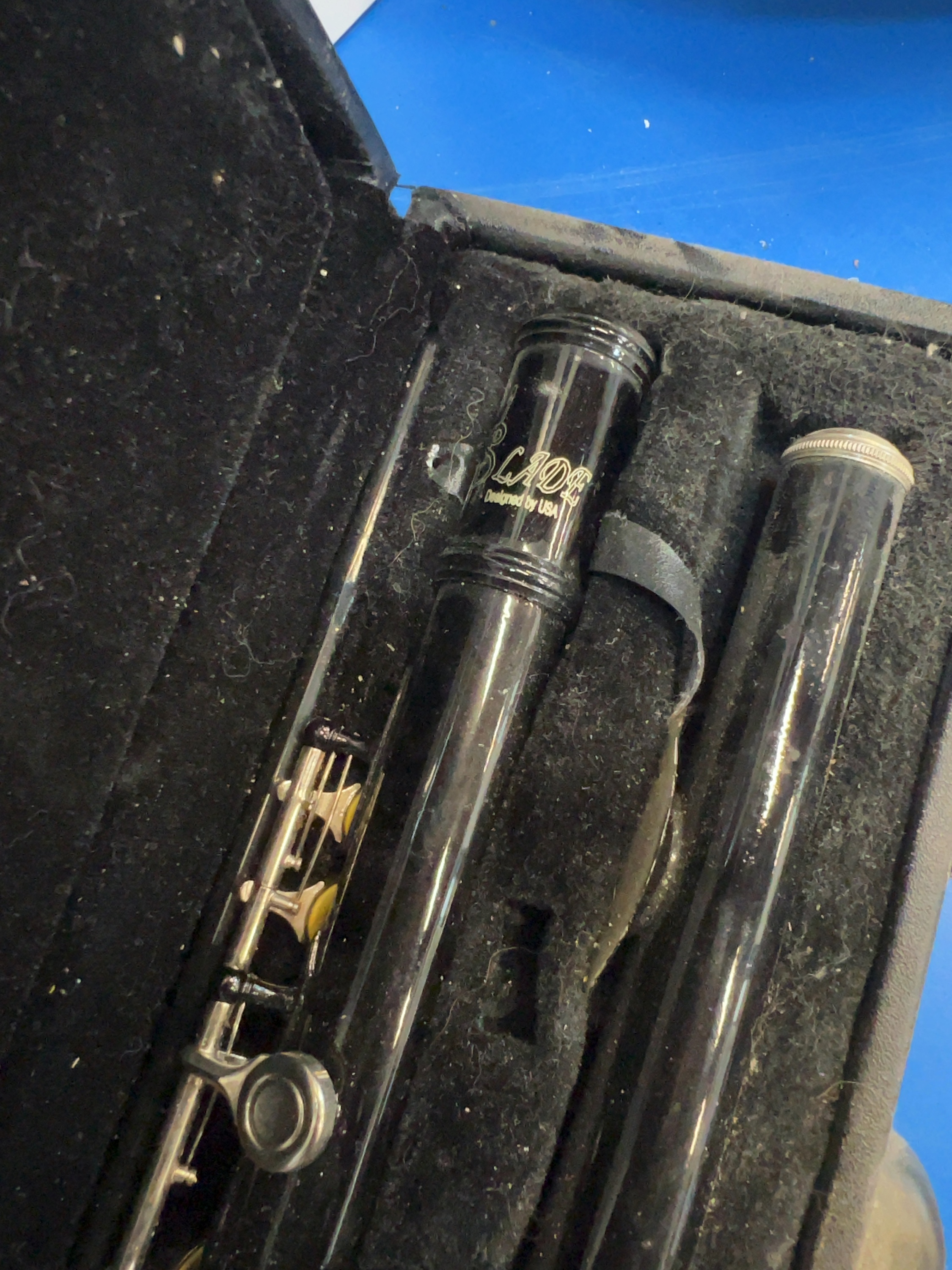 A LADE student-level transverse flute constructed with a black synthetic composite or ebonite body and silver-tone nickel-plated keywork. in a standard three-section design comprising a headjoint, main body, and footjoint. The headjoint features the LADE maker mark in script with the additional text Designed by USA. The flute is in its hardshell carrying case.