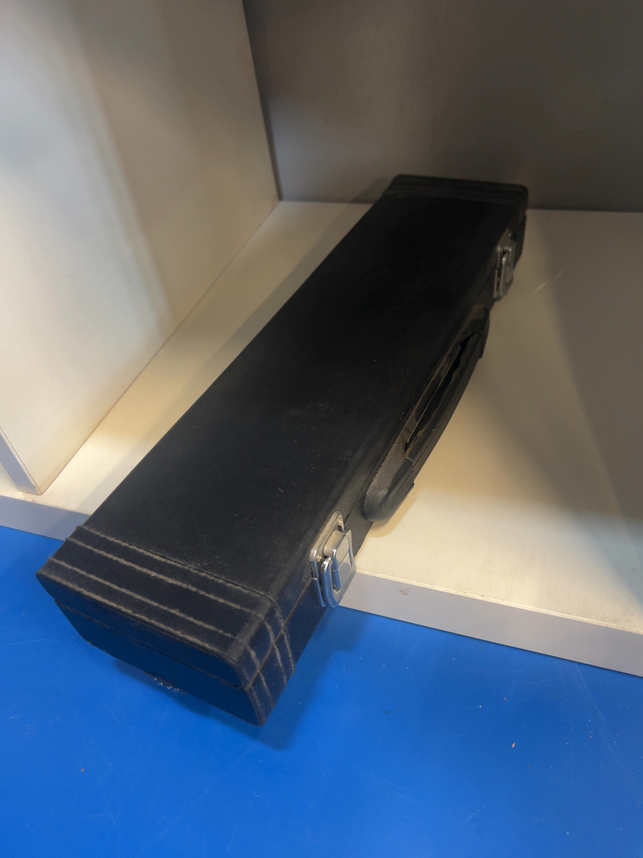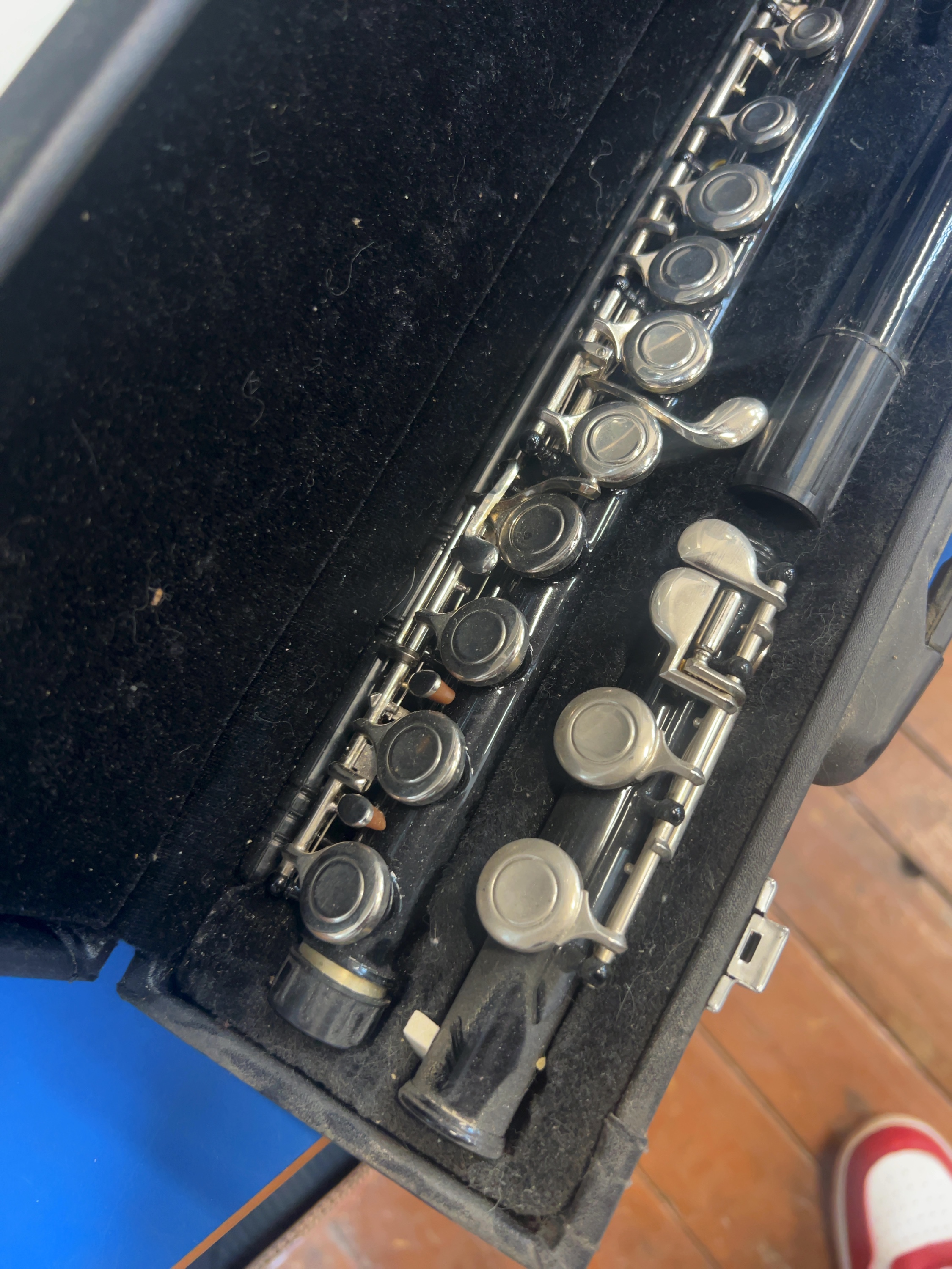 The instrument is in used condition. Visible tarnishing and oxidation are present on the silver-tone keys and mechanical components. Dust has accumulated within the fine mechanisms and the case interior. The pads are intact but exhibit yellowing consistent with age. There is visible wear to the cork joints. The case exterior shows scuffing and general wear from use. The instrument is sold as seen and likely requires professional cleaning and servicing to ensure full playability.