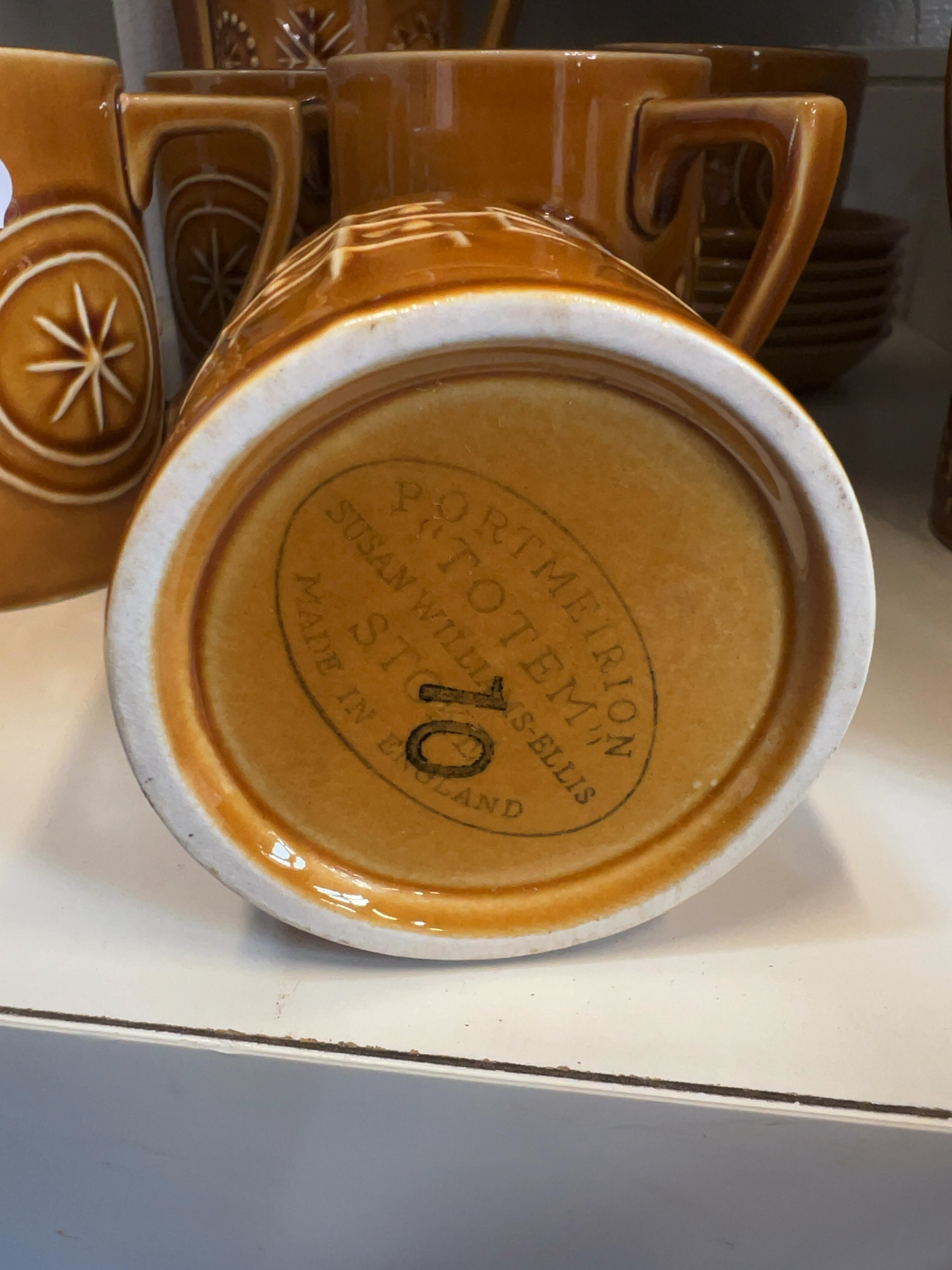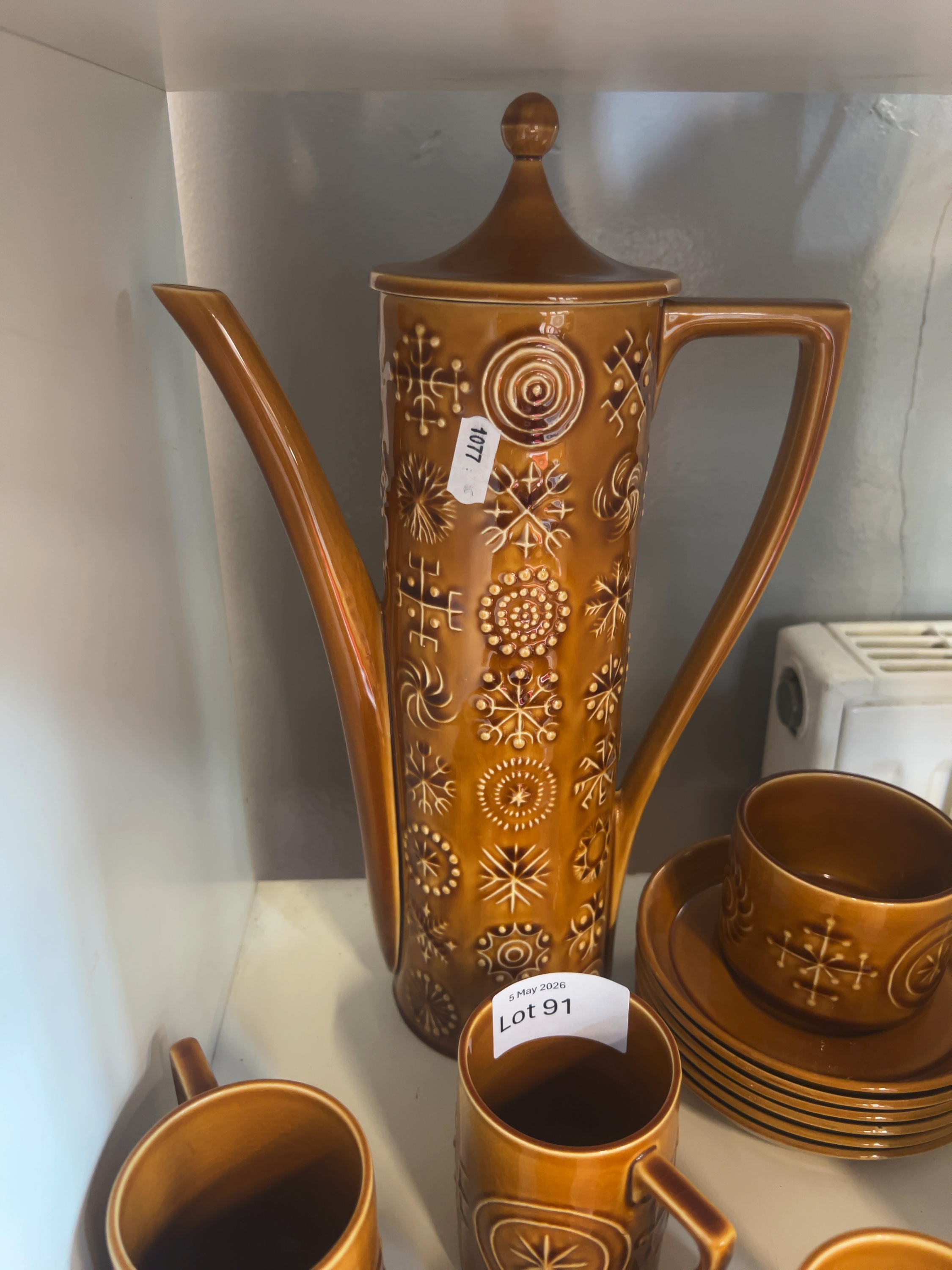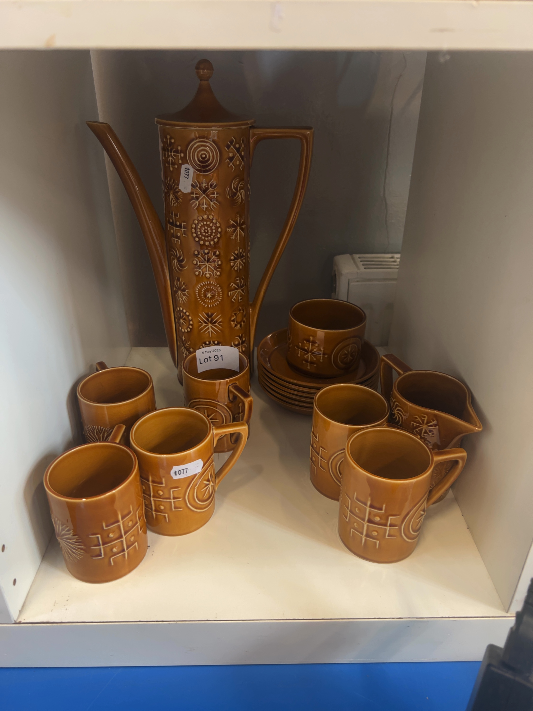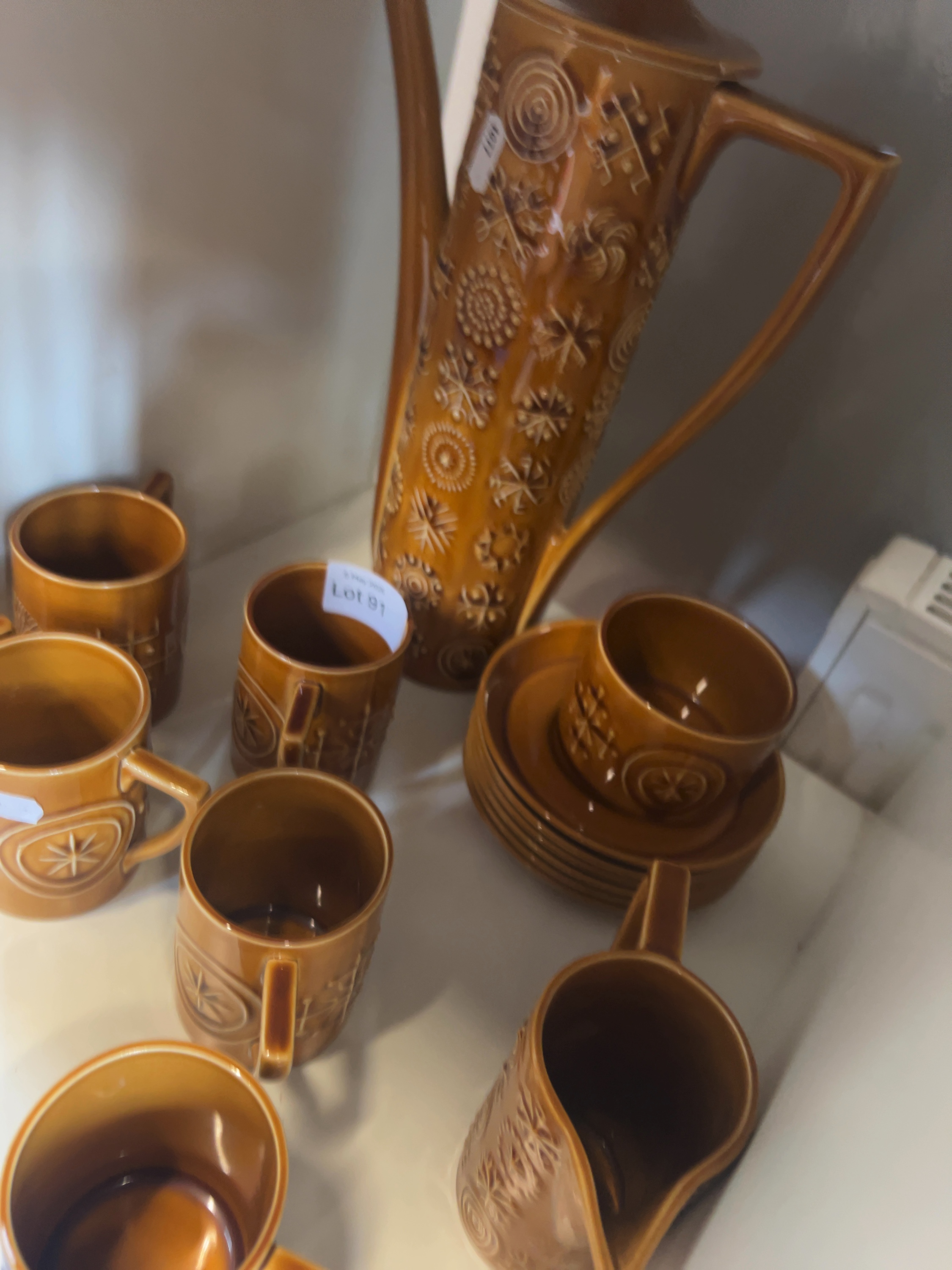 This set of Portmeirion pottery is in the Totem pattern, designed by Susan Williams-Ellis and introduced in 1963. Comprising one tall, slender coffee pot with a conical lid and angular handle, six cylindrical mugs with angular handles, one milk jug, one coffee cup, and six matching saucers. Some pieces also feature a hand-stamped numeric mark.