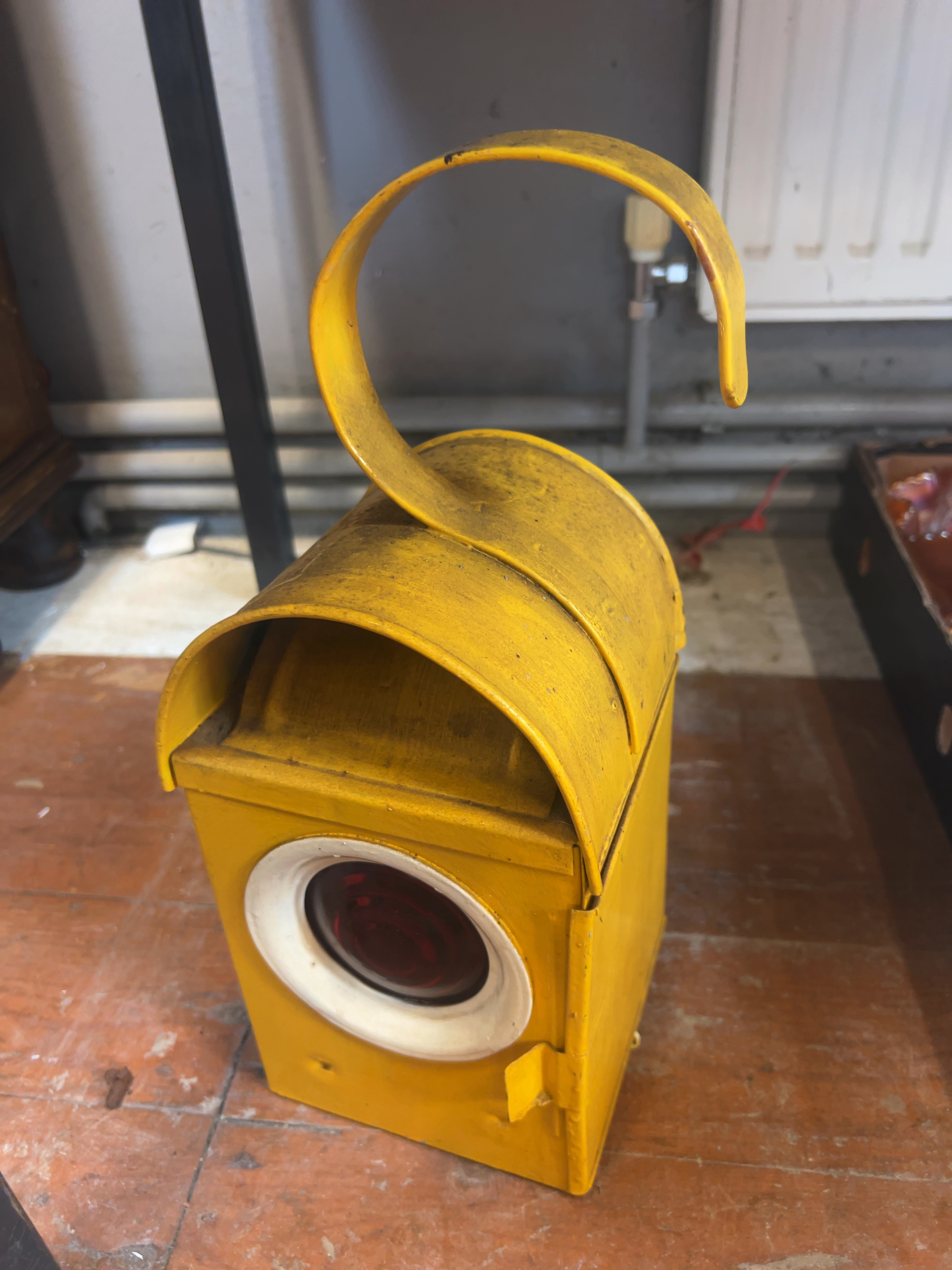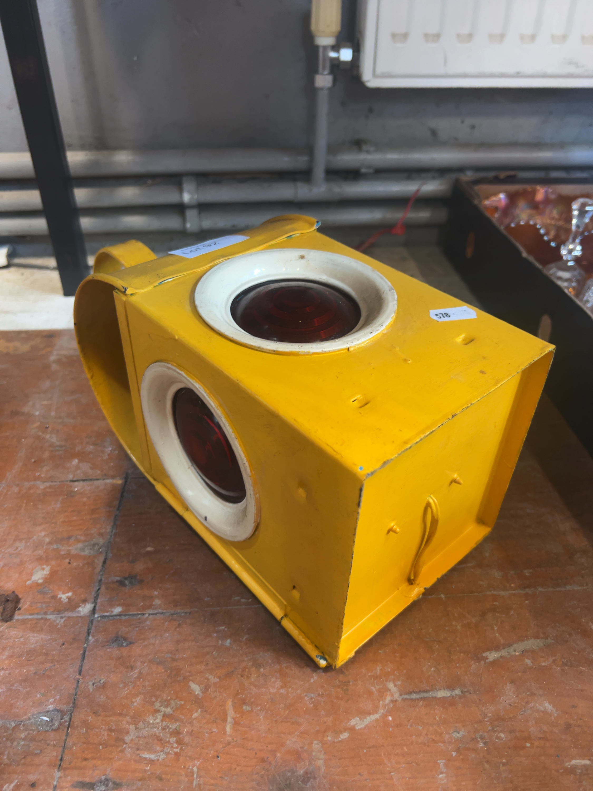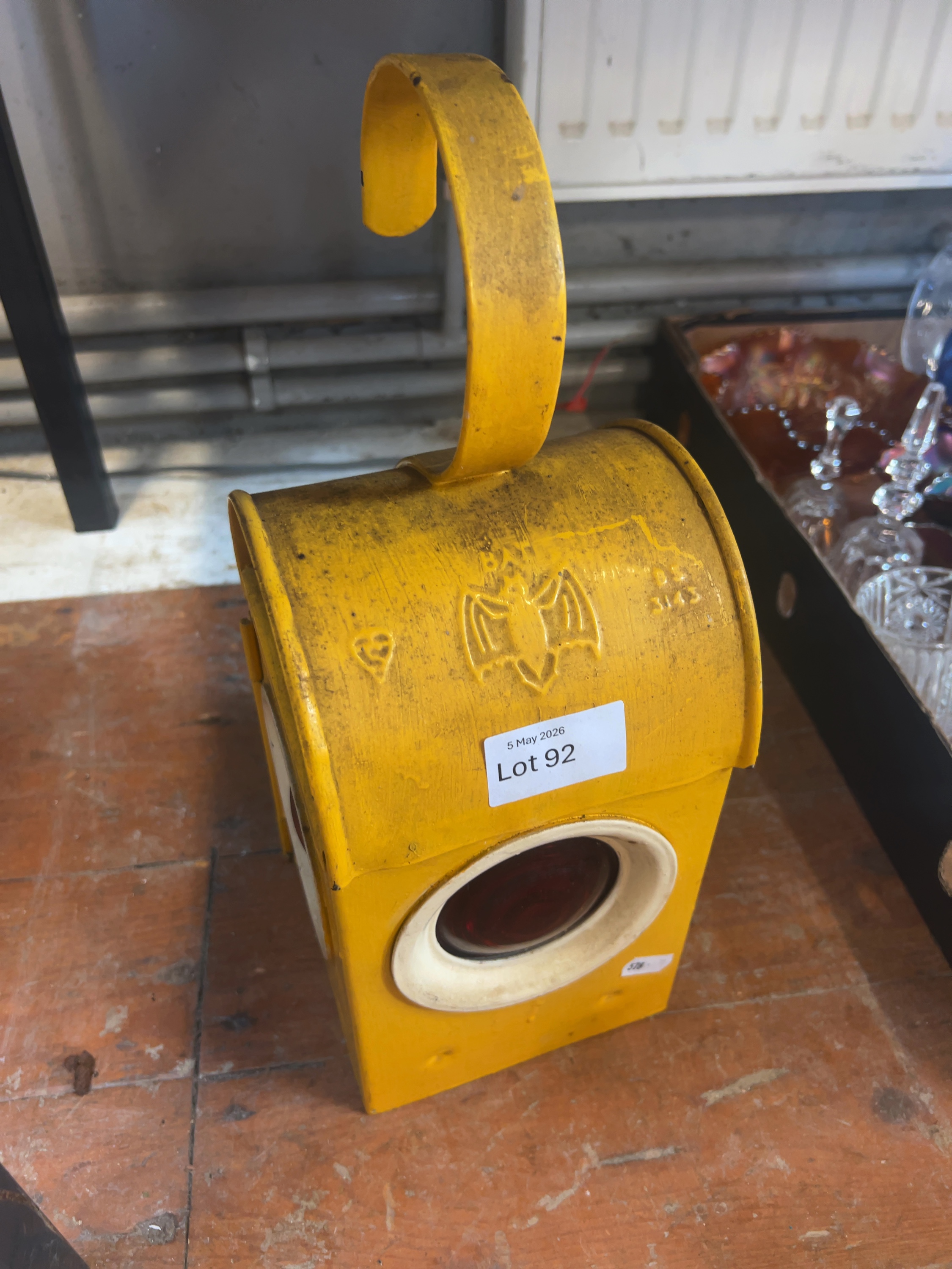 A vintage industrial road works signal lamp of box-form construction, manufactured by the Bat brand.