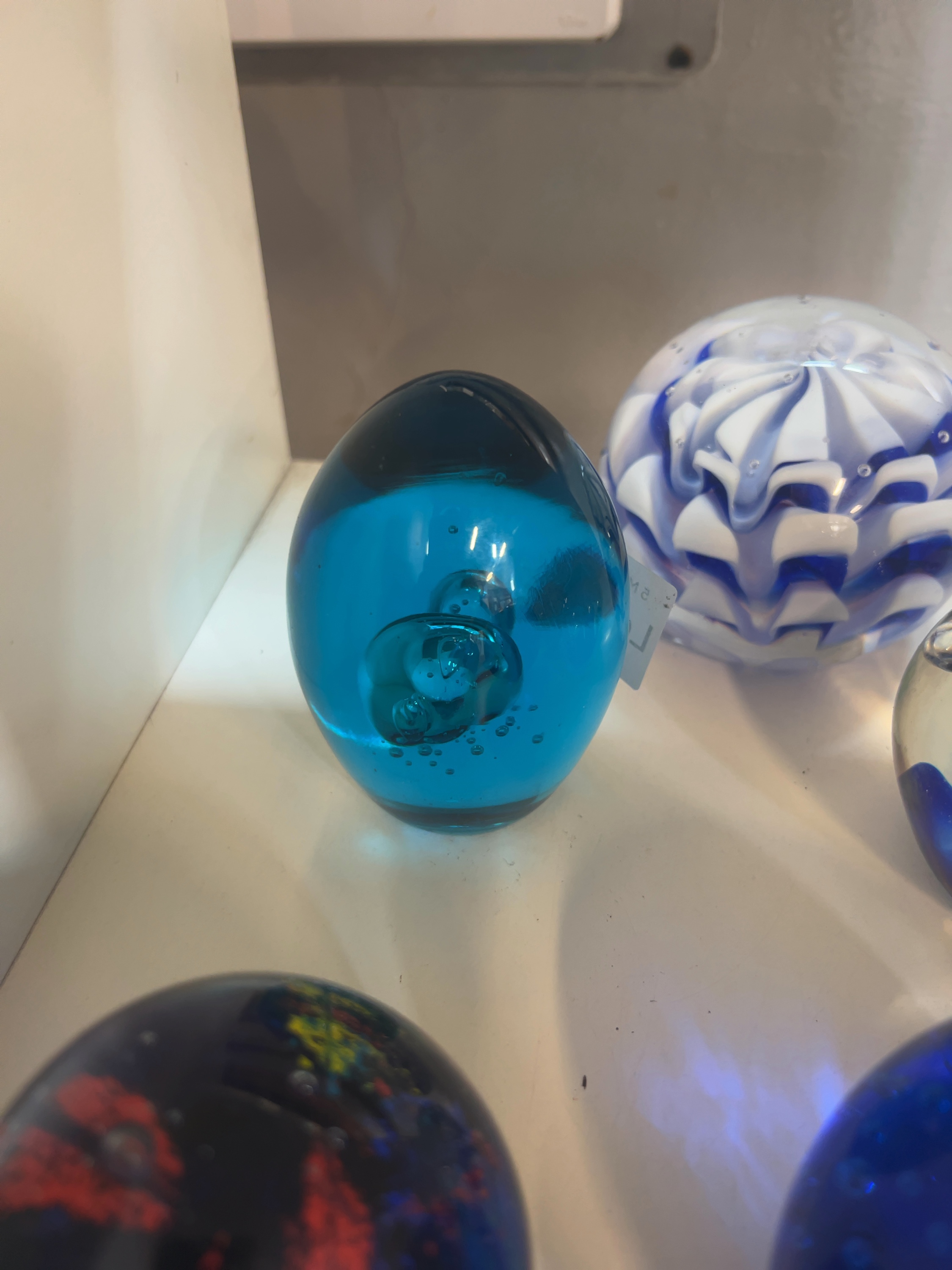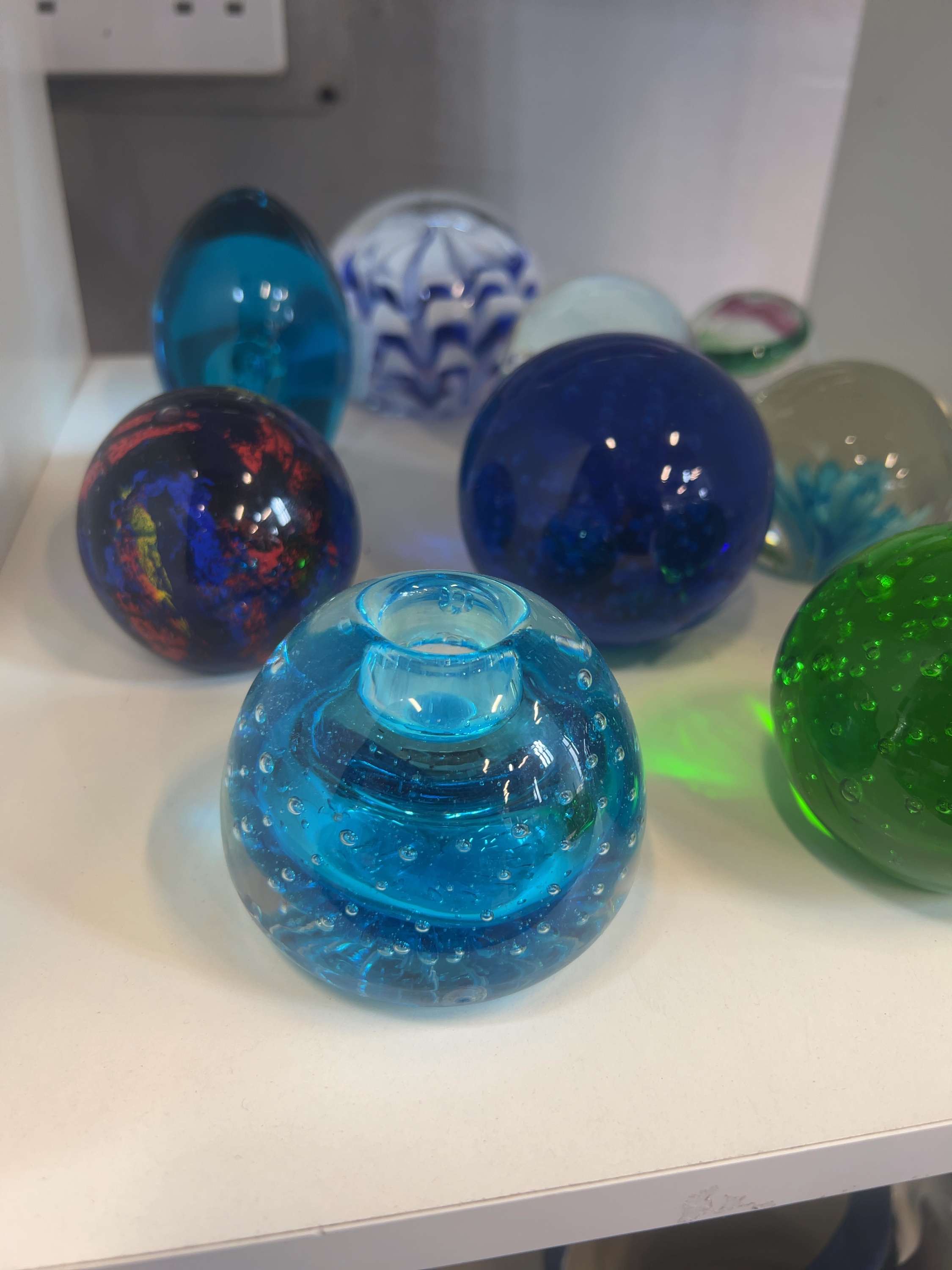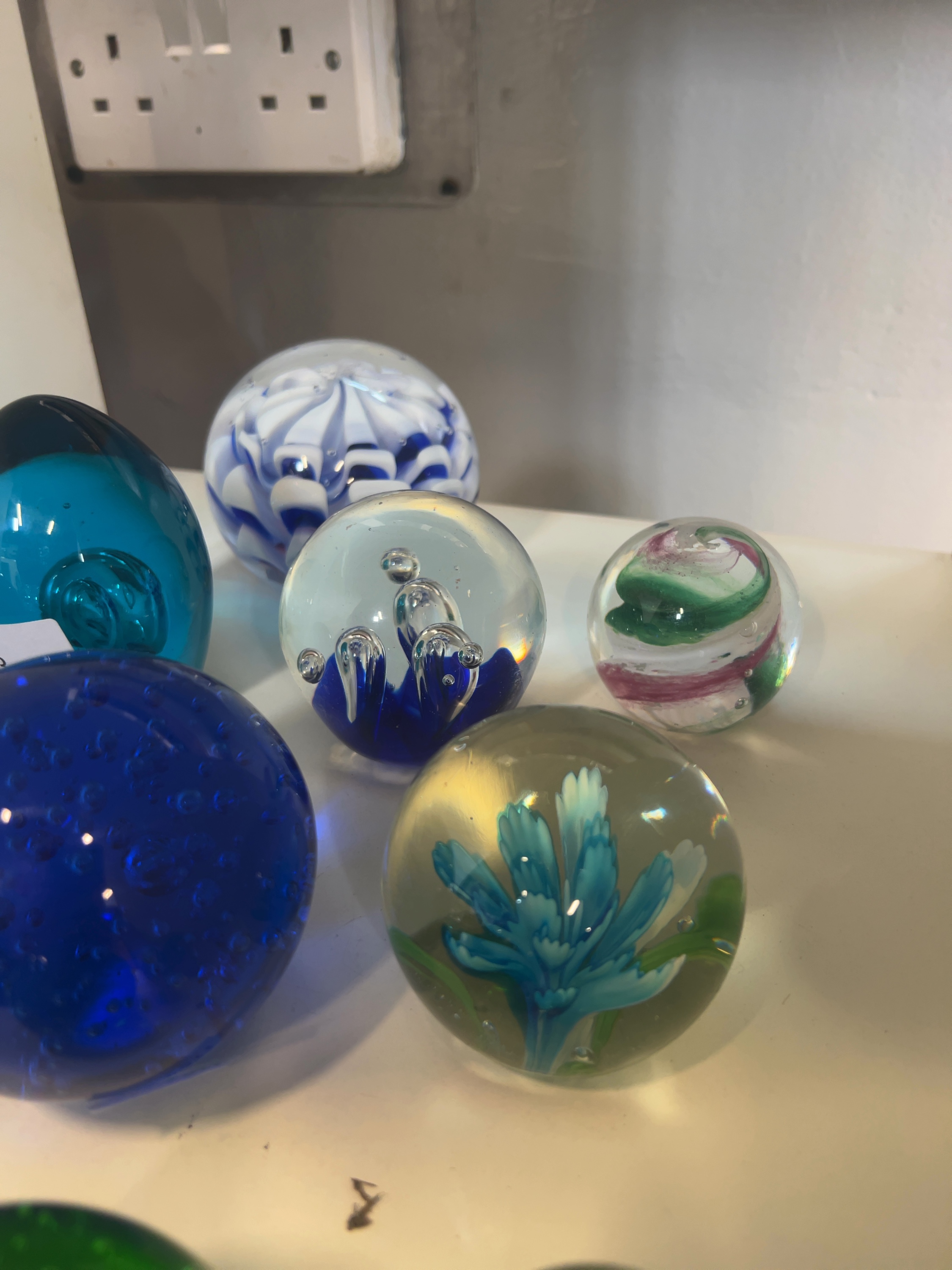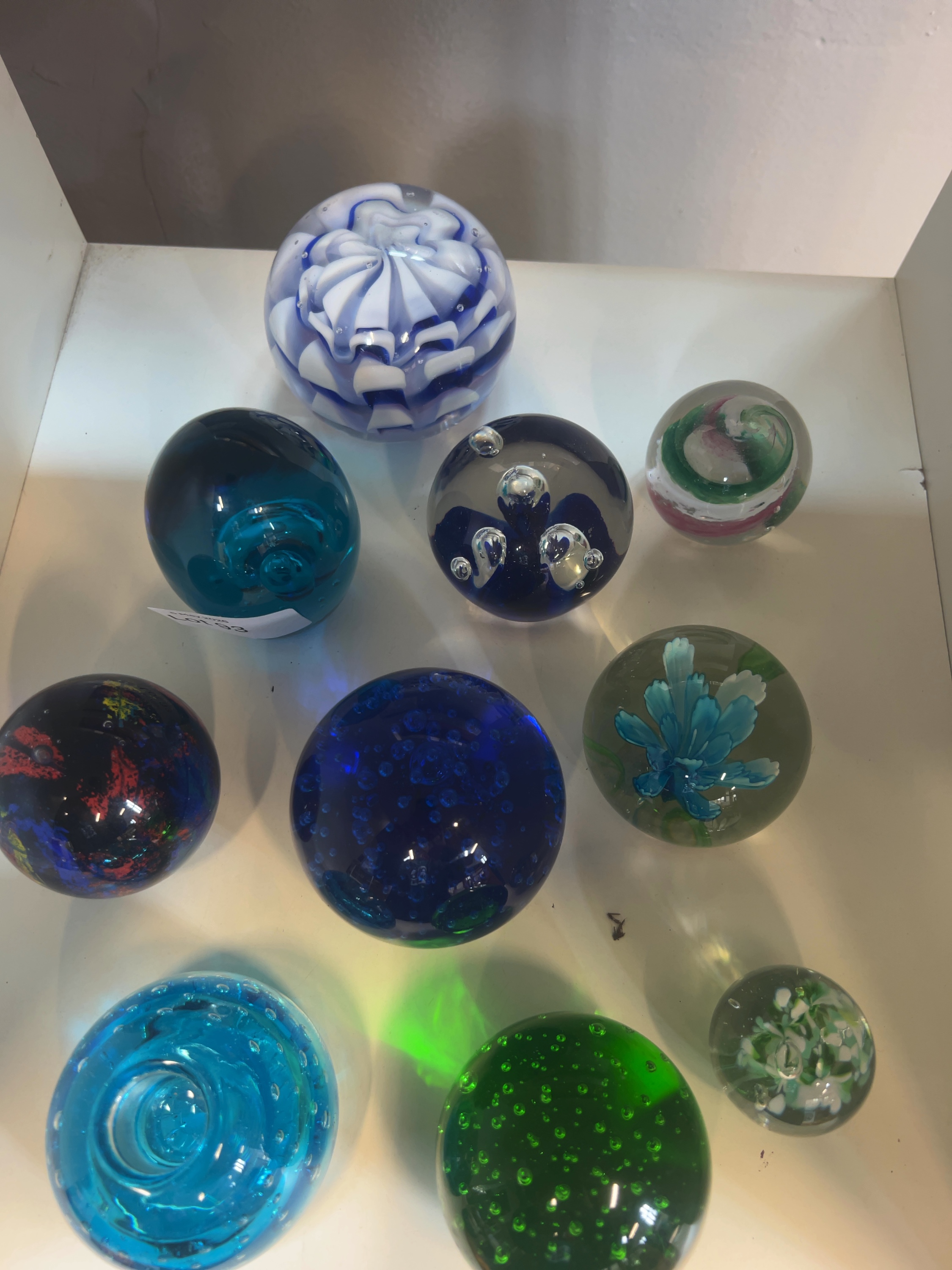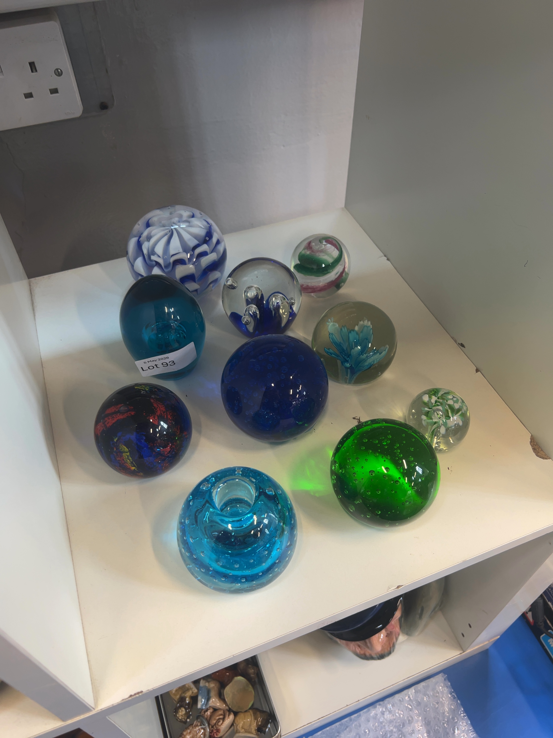 A collection of ten decorative glass paperweights and objects, primarily dating from the mid-to-late 20th century such as Caithness, Whitefriars, and Mdina, although they remain unattributed in the absence of visible marks.