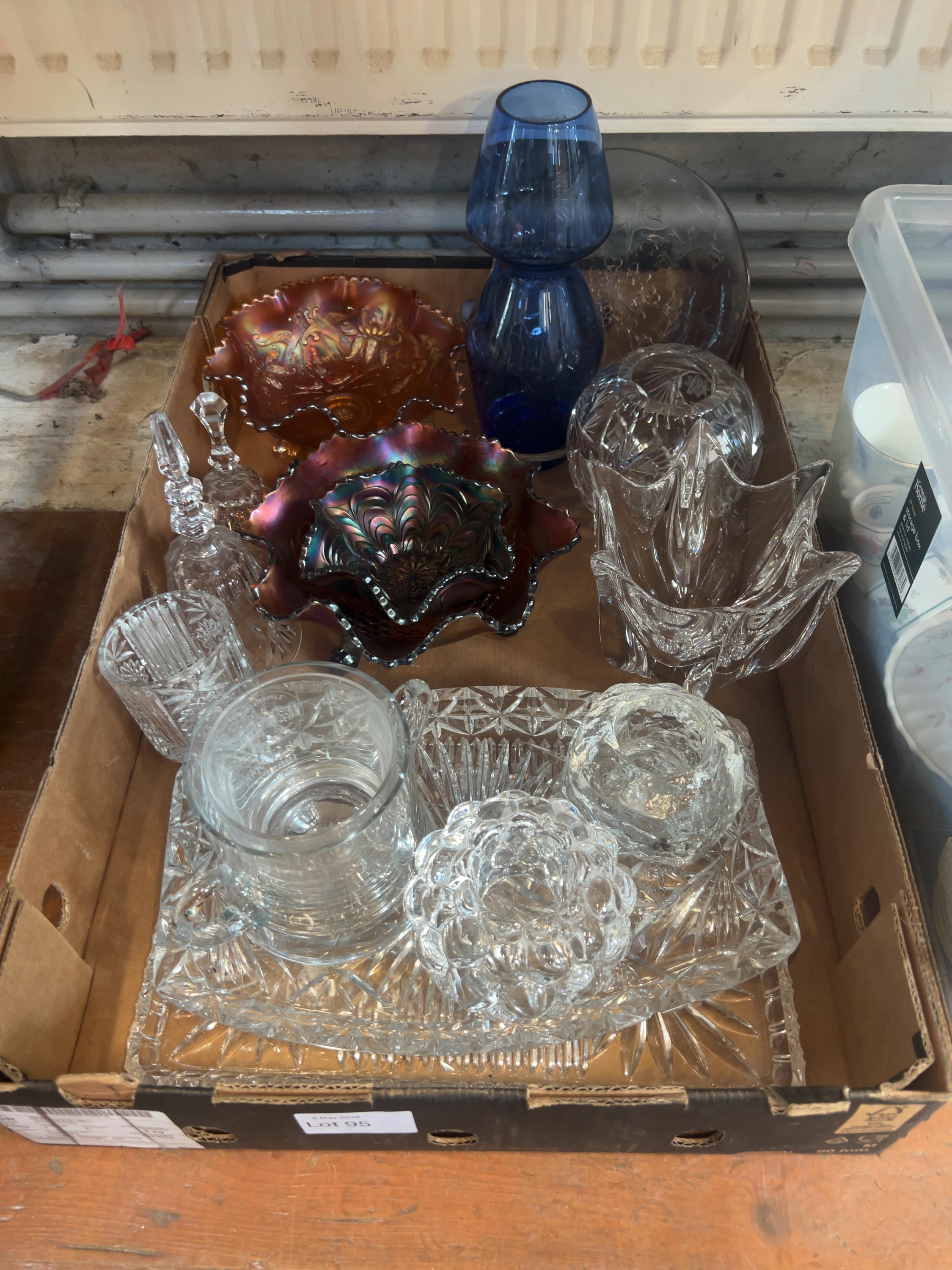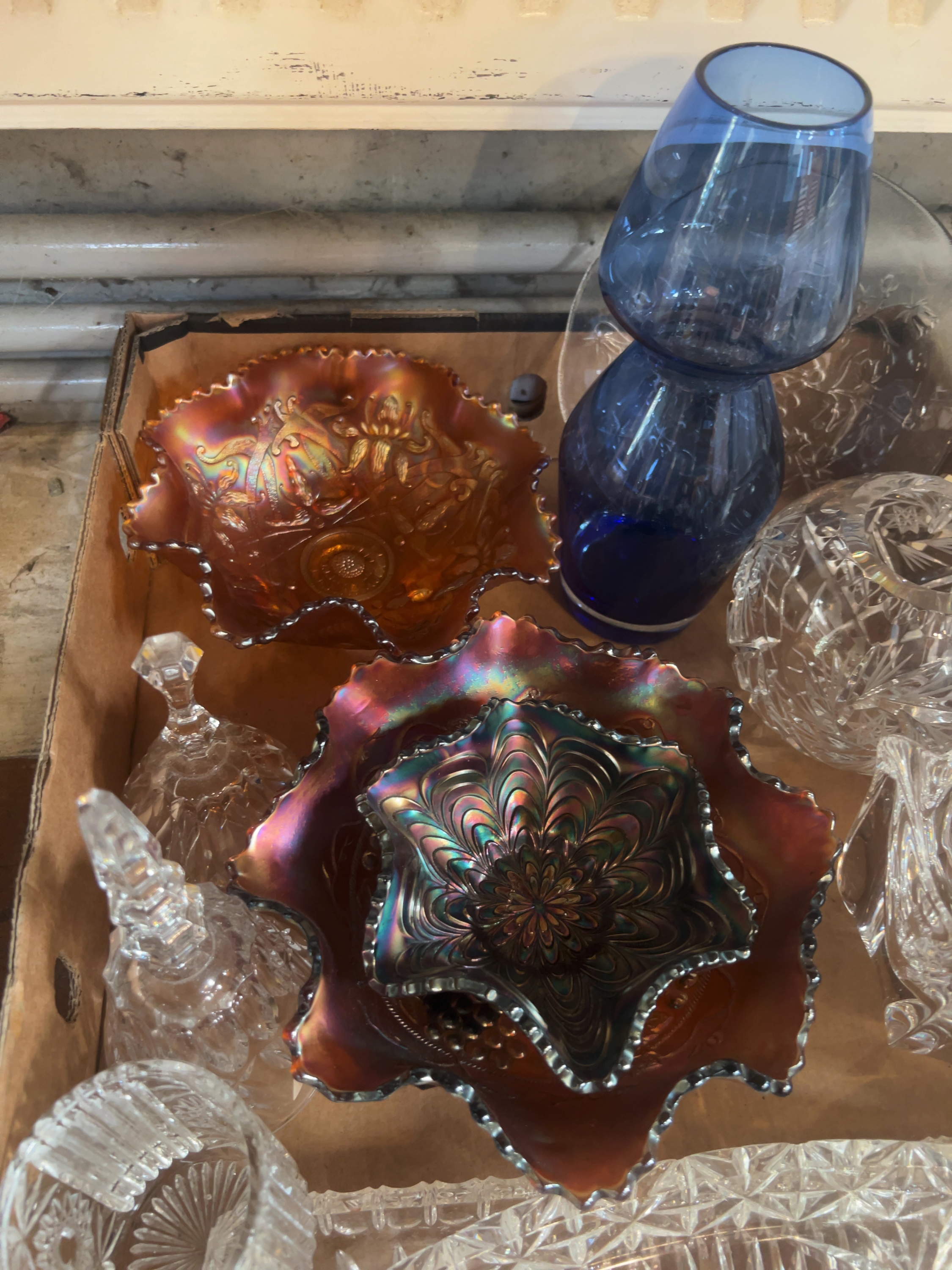 Items appear to be in generally good condition. No significant cracks or large chips are immediately apparent. Minor flea-bite chips to the facets of the cut glass and light surface scratching consistent with age and use should be expected. The iridescent finish on the carnival glass remains bright.