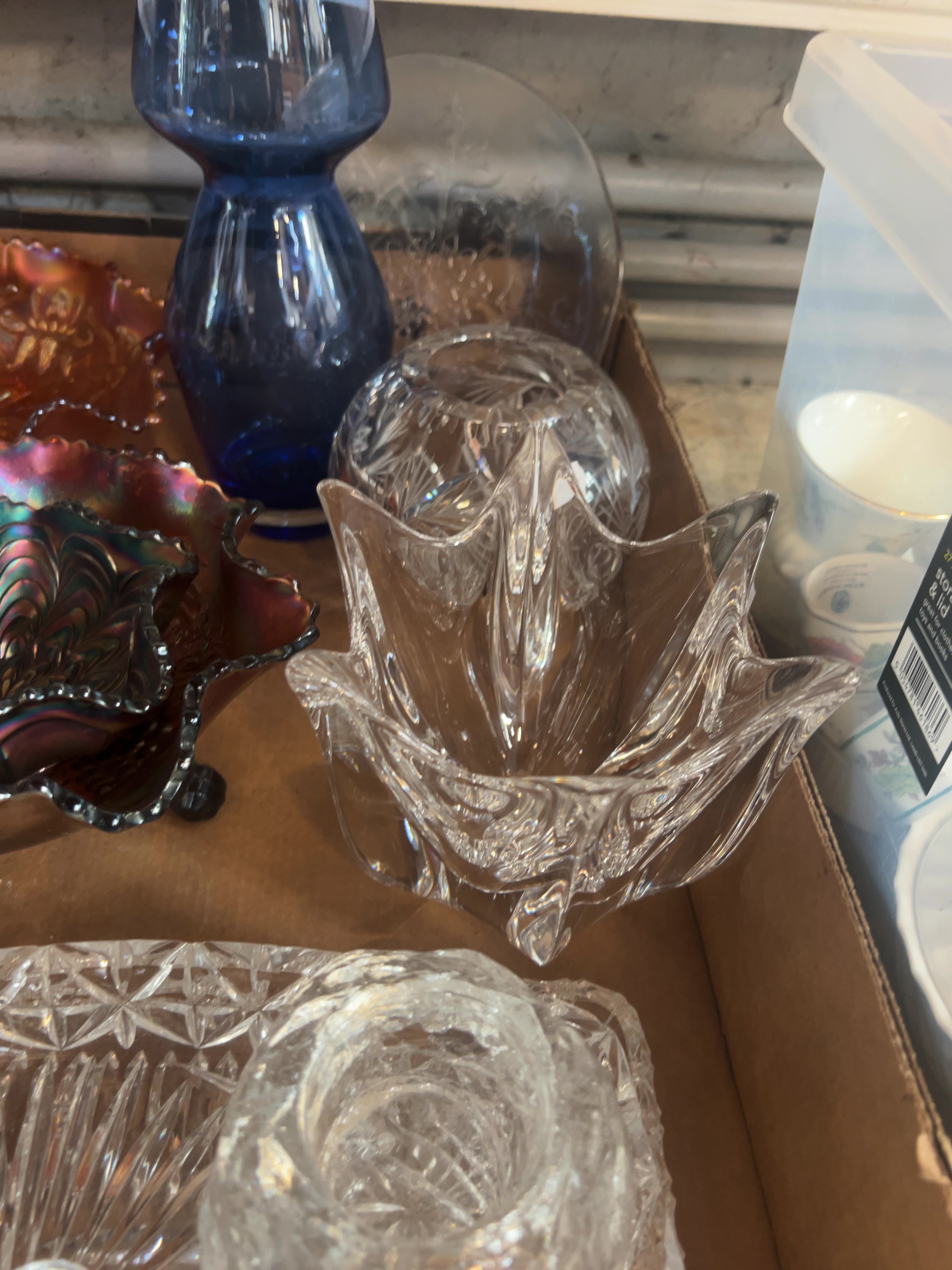 An assortment of 20th-century decorative and household glassware, comprising carnival glass, cut crystal, and art glass pieces.